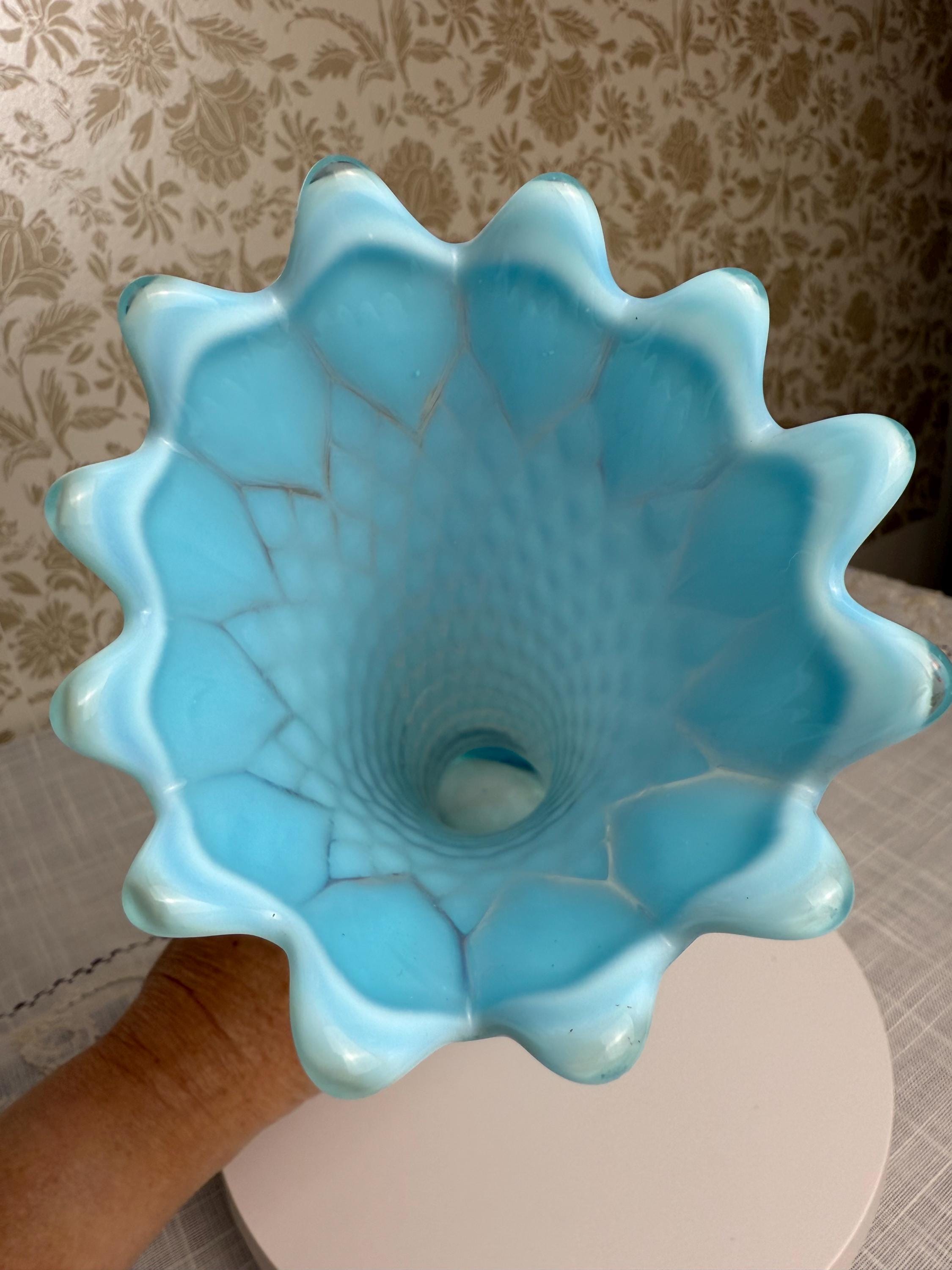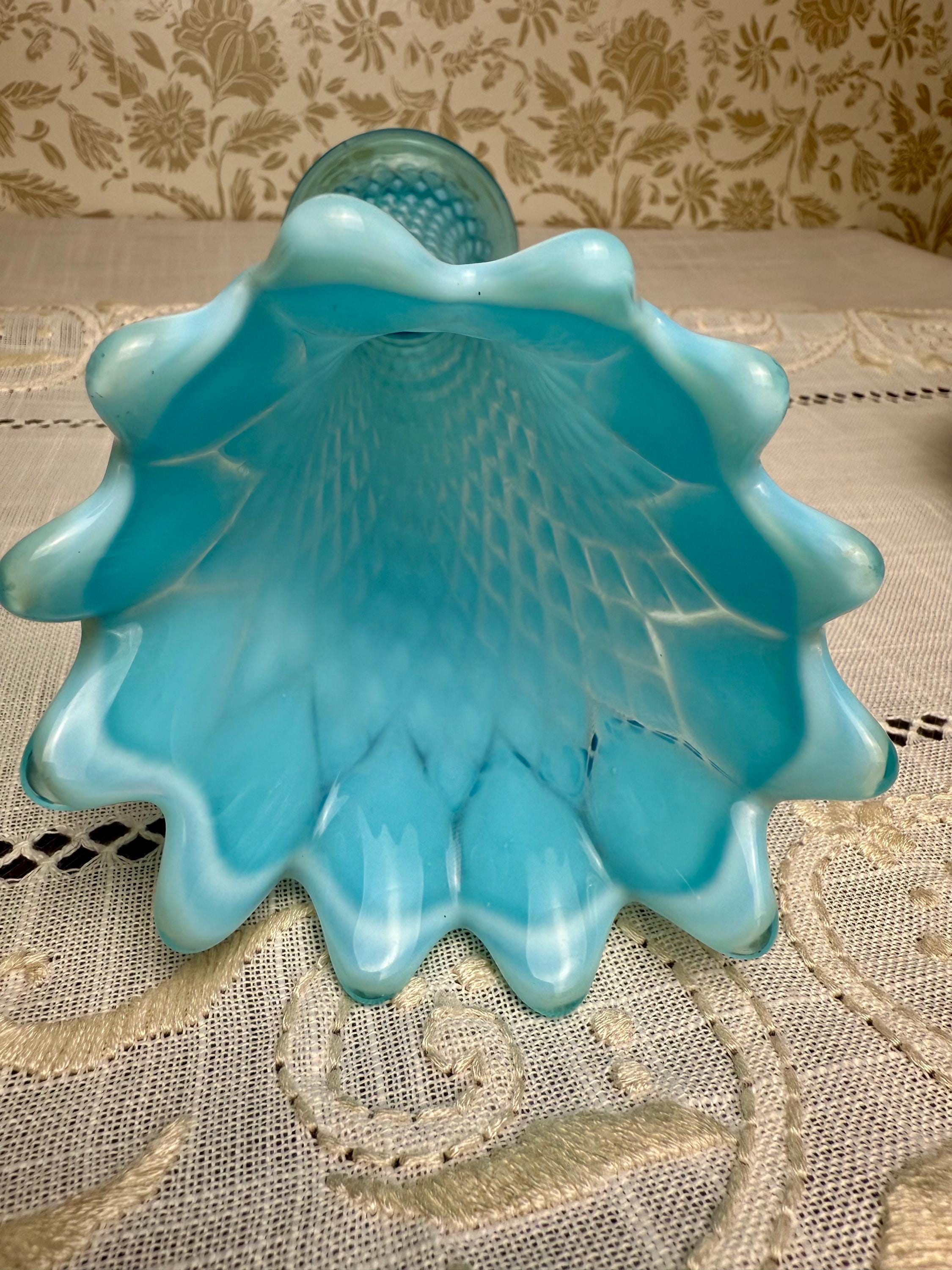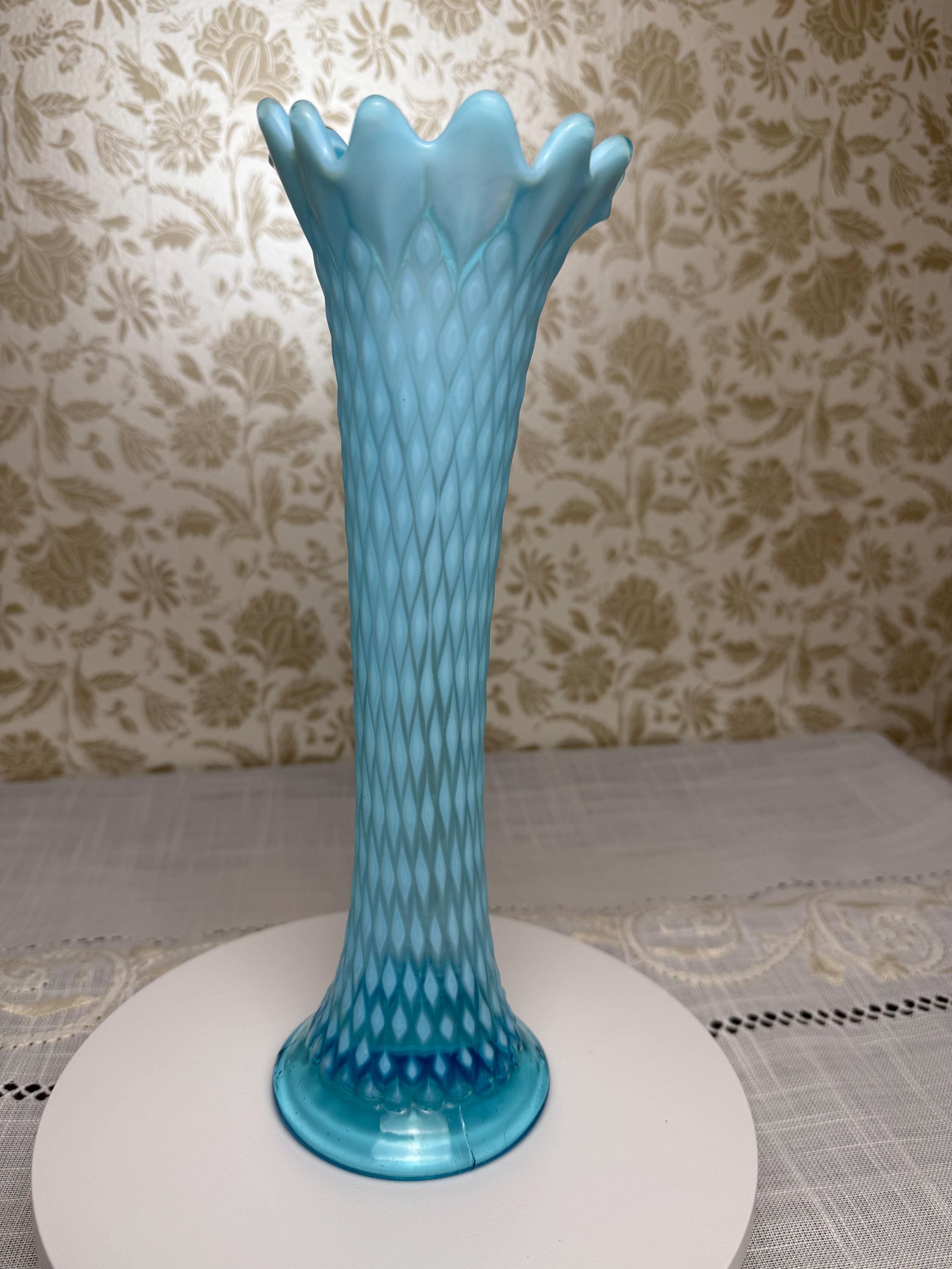 The moment I found this vase, I was captivated by its stunning color — a dreamy aqua blue that seems to glow from within — and its elegant, flared shape. The diamond pattern adds such beautiful texture, catching the light in ways that feel almost magical. I knew this piece would be perfect for anyone who loves antique glass or wants a showstopping accent in their home.