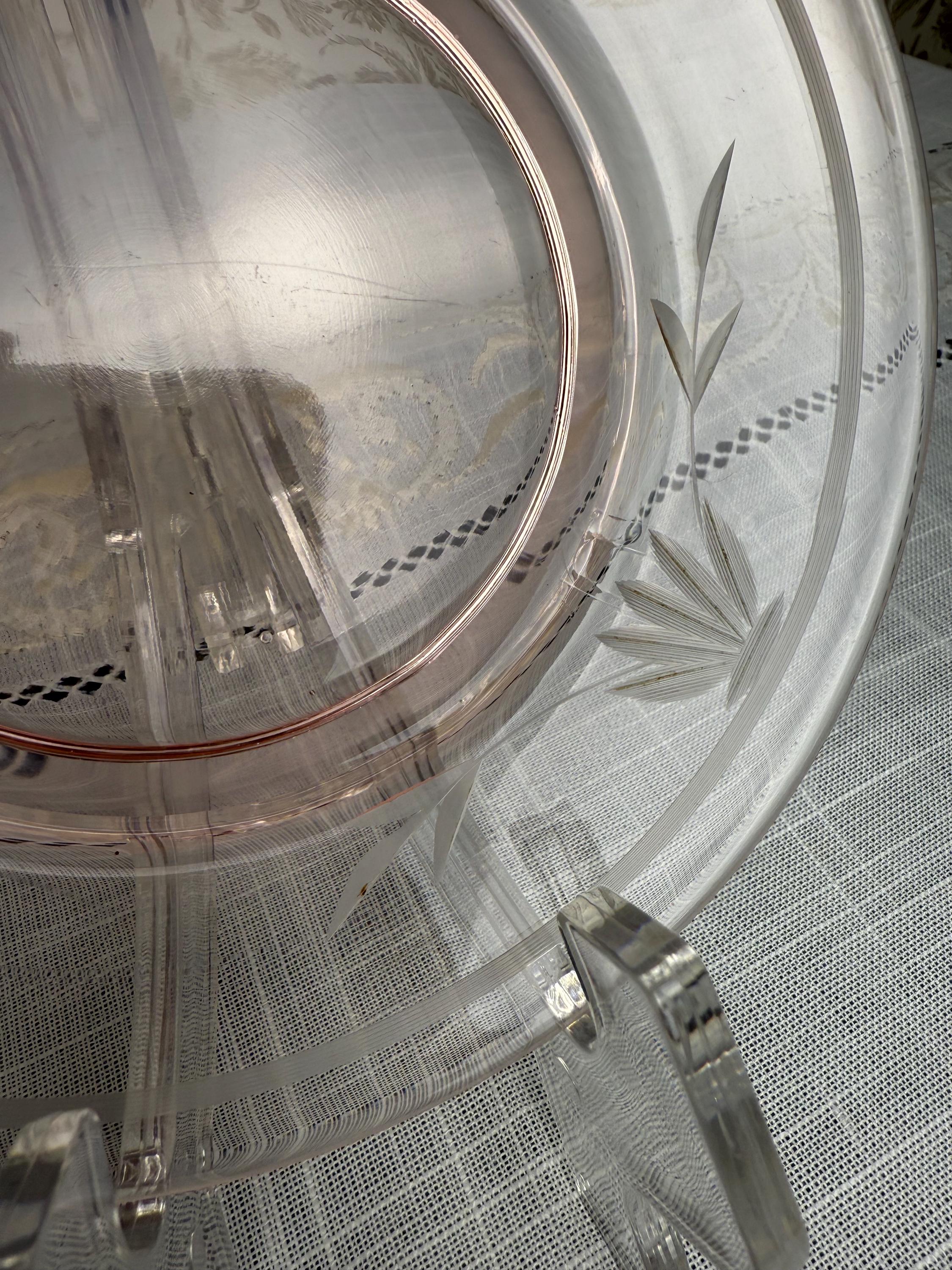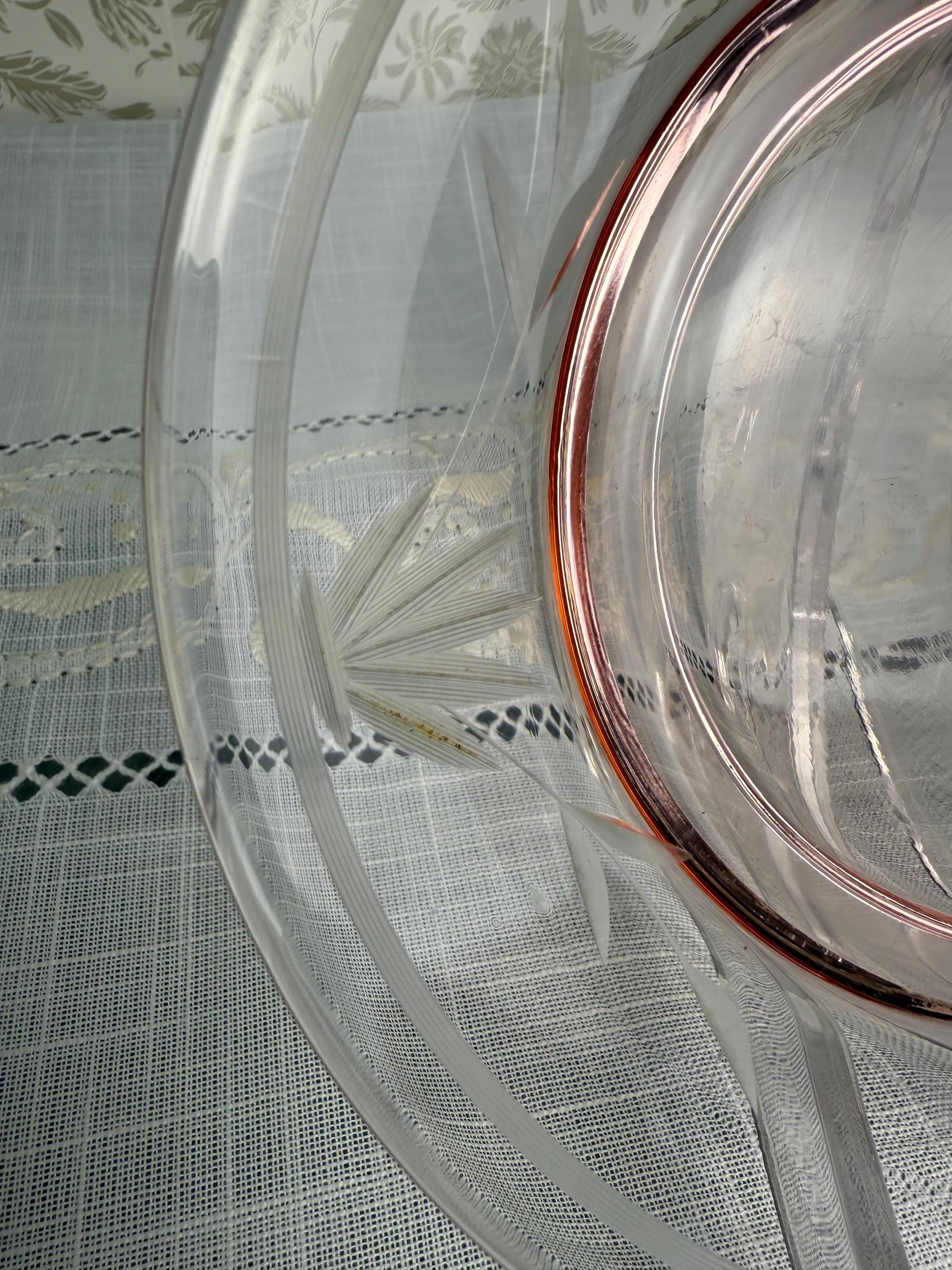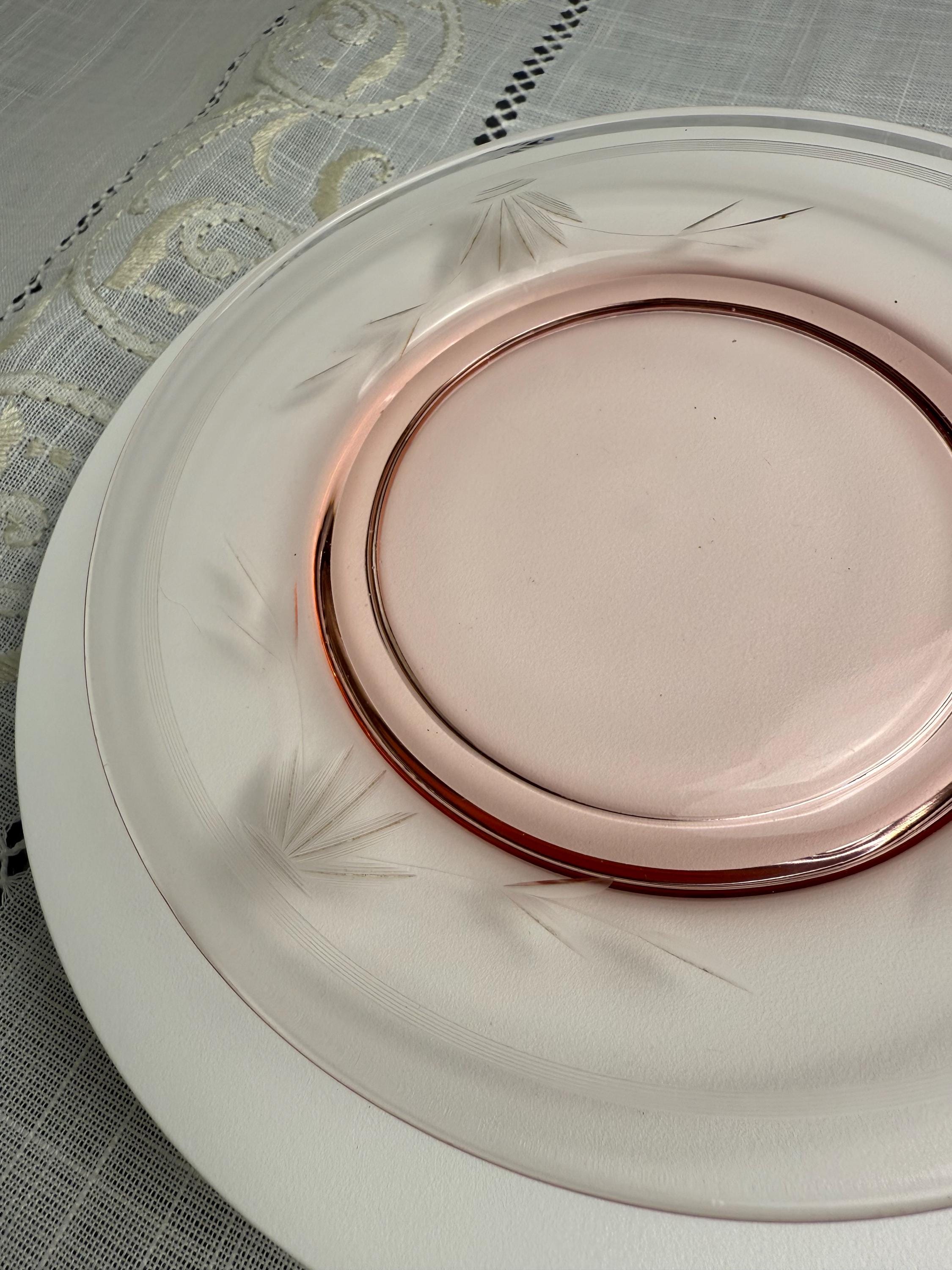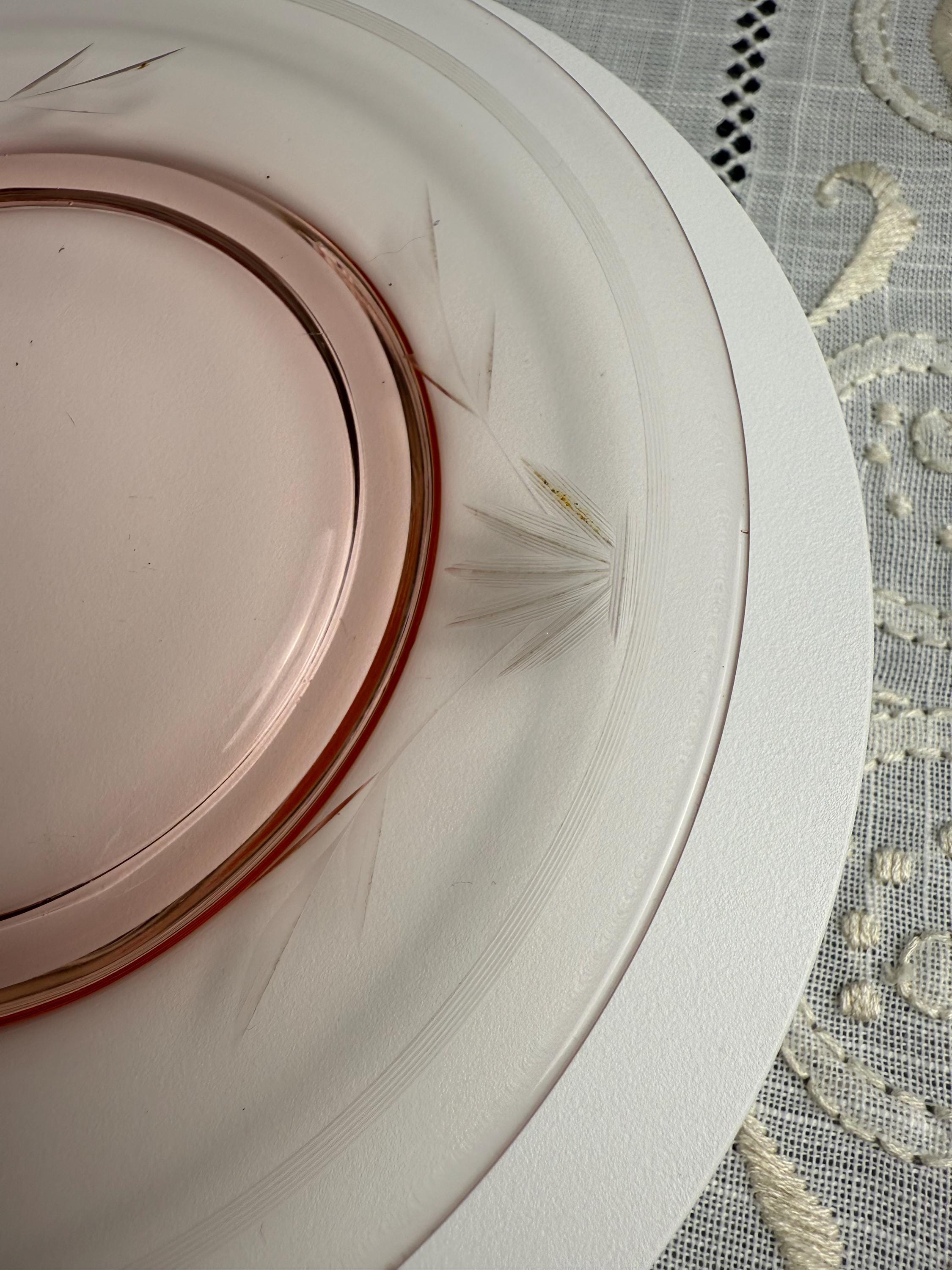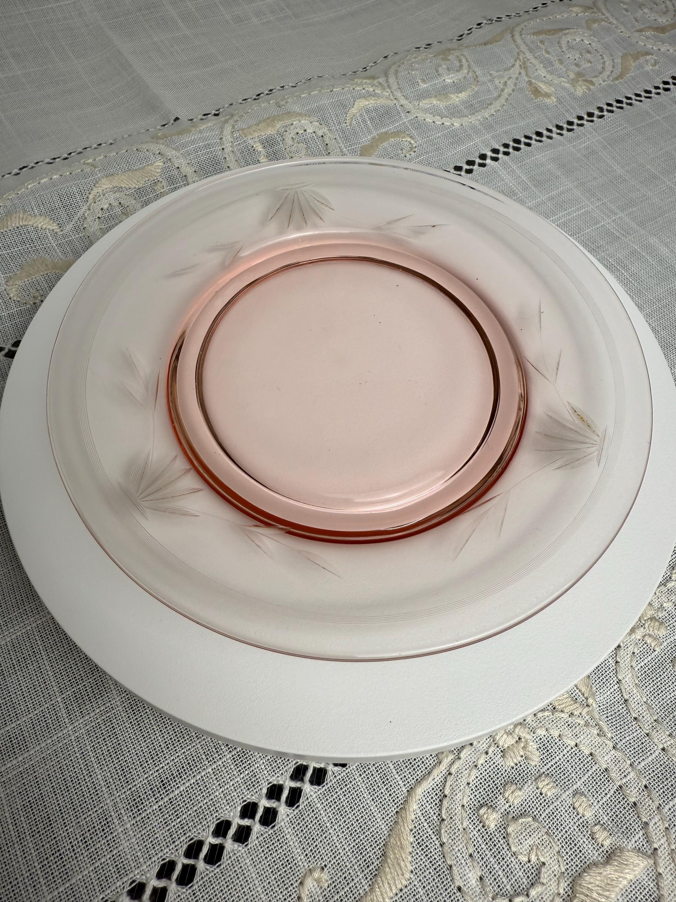 Invite a touch of vintage elegance and delicate color into your home with this stunning pink Depression glass plate, featuring a graceful etched leaf-and-floral motif.