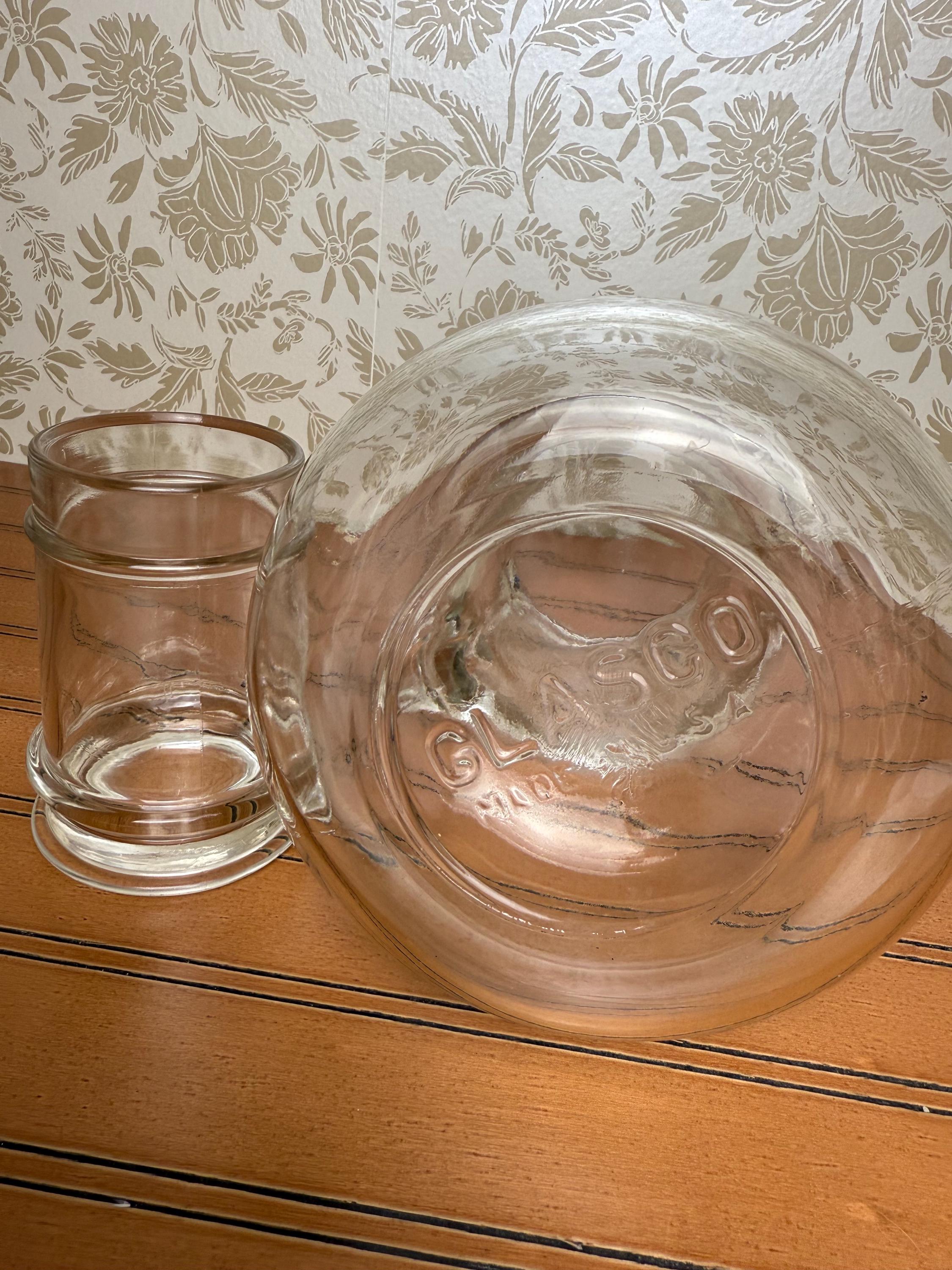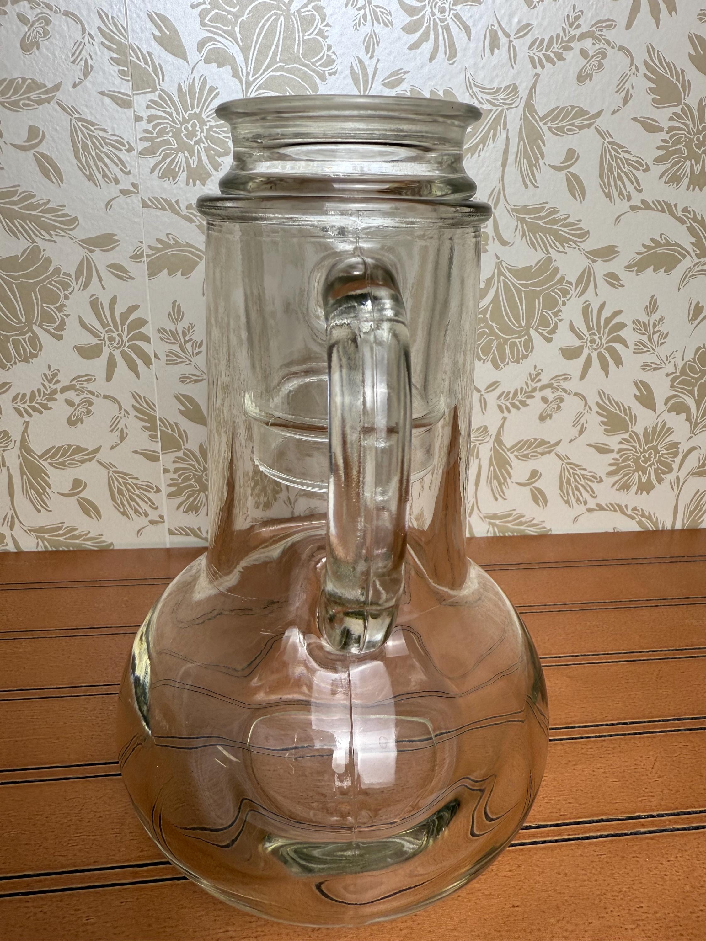 Bring timeless mid-century charm to your table with this vintage Glasco clear glass pitcher. Its sleek silhouette, gracefully curved handle, and sturdy weight speak to the practical beauty of mid-20th-century American glassware. Perfect for serving water, juice, or your favorite beverages, this pitcher blends seamlessly into both modern and vintage-inspired decor.