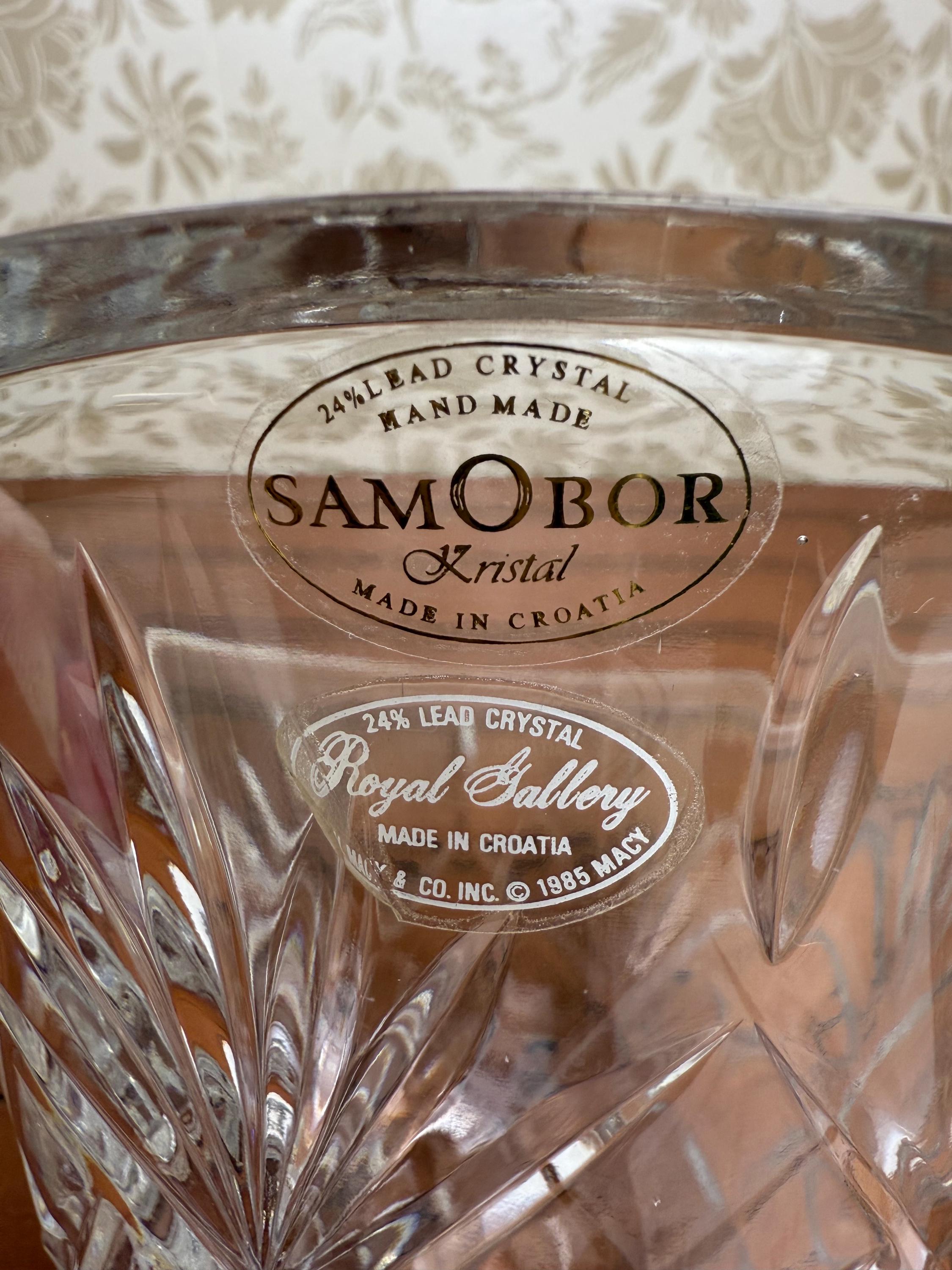 Samobor Kristal is a renowned Croatian crystal maker, celebrated for producing fine lead crystal pieces using traditional methods of hand-cutting and shaping. Royal Gallery, a brand carried by Macy’s in the 1980s, partnered with artisans like those in Samobor to bring European luxury glassware to American homes. The presence of both labels makes this bowl a fascinating piece of both European and American retail history, and a collectible for lovers of fine crystal.