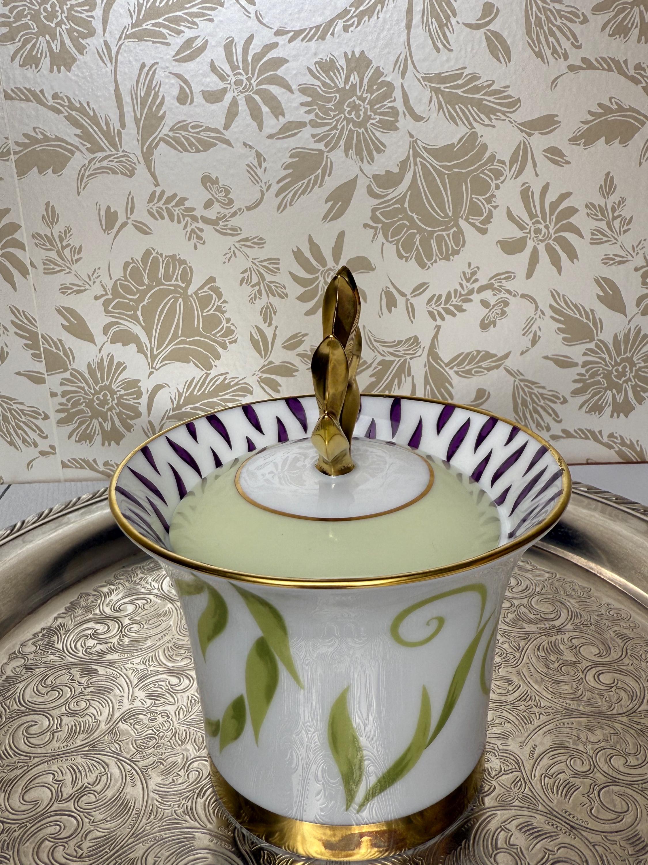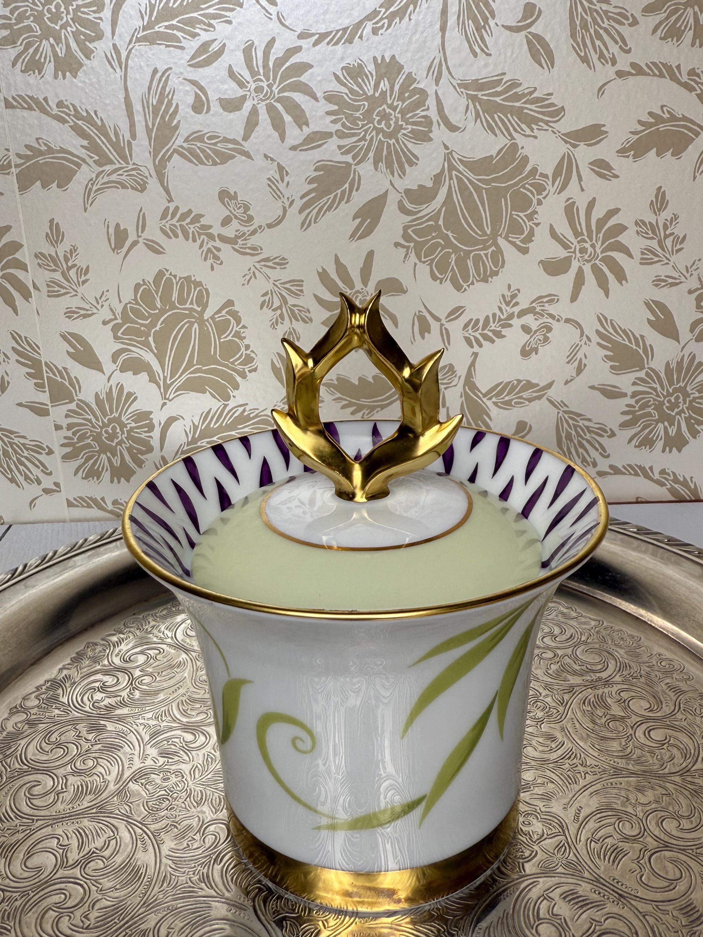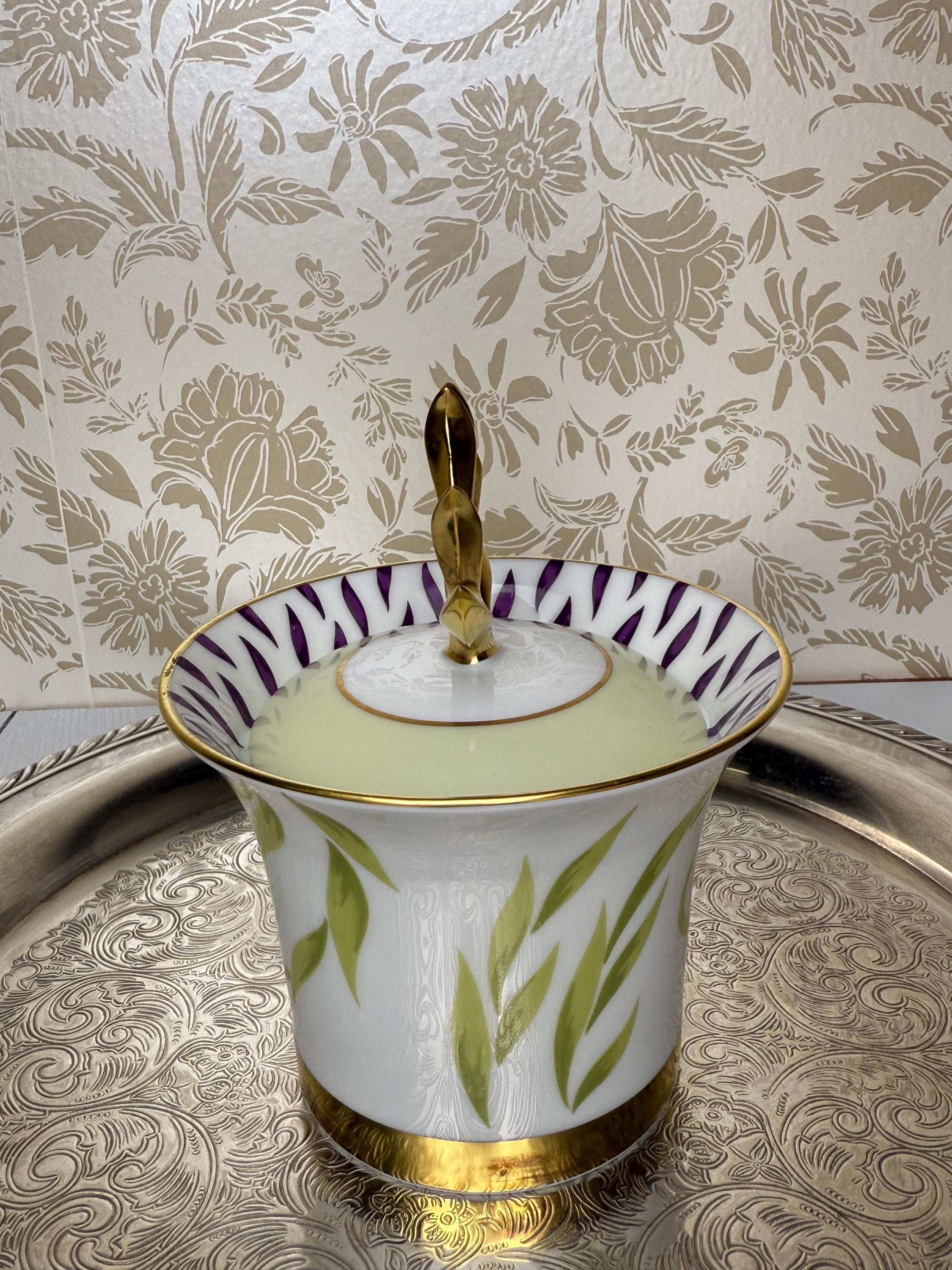An exquisite piece of French porcelain artistry, this Bernardaud Frivole sugar bowl from Limoges is a rare blend of whimsical design and timeless elegance. Featuring the signature Frivole pattern — soft green swirling leaves, vibrant purple feathered accents, and gleaming gold trim — it’s crowned with a stunning sculptural finial that makes it as eye-catching as it is collectible.