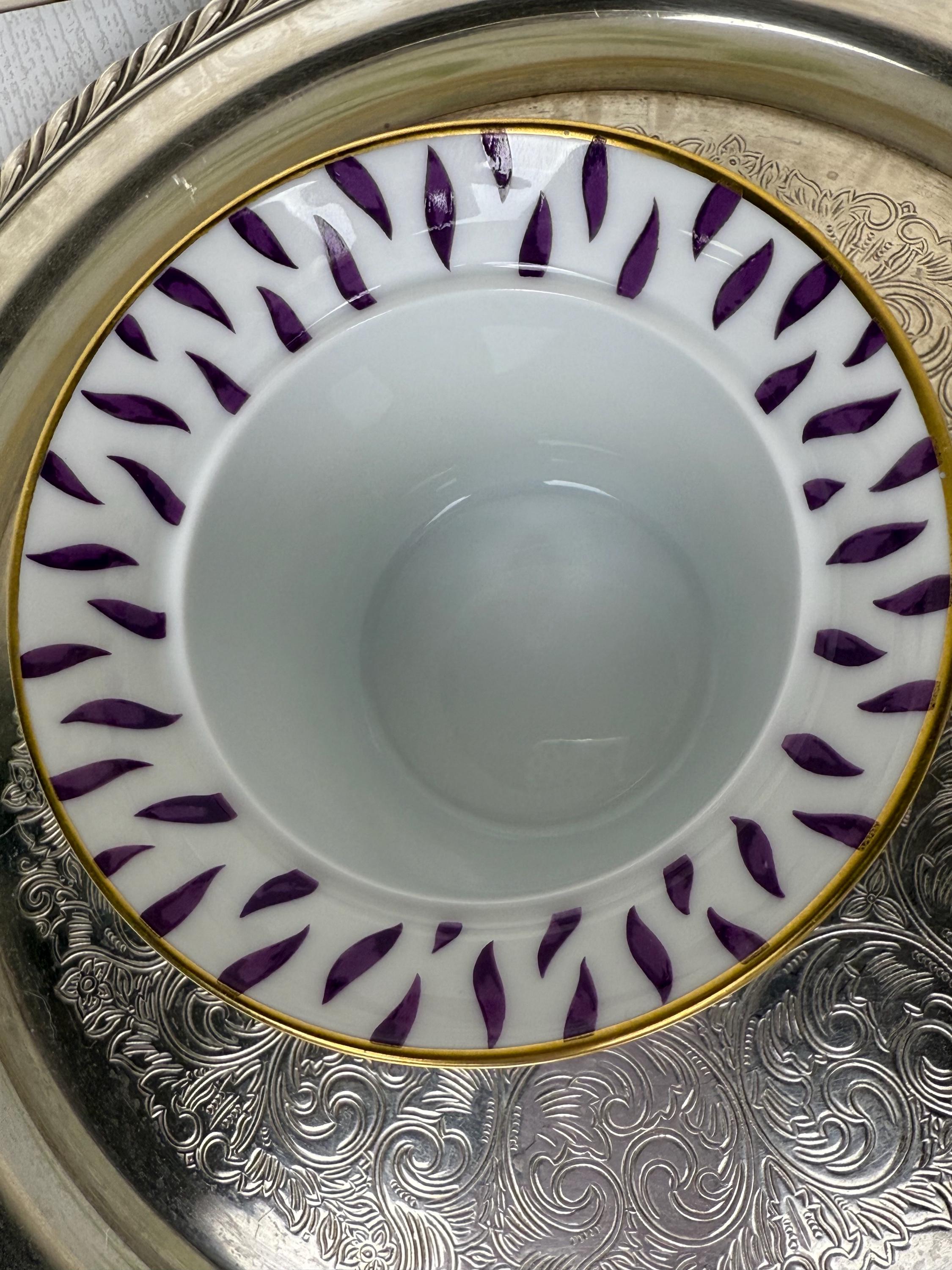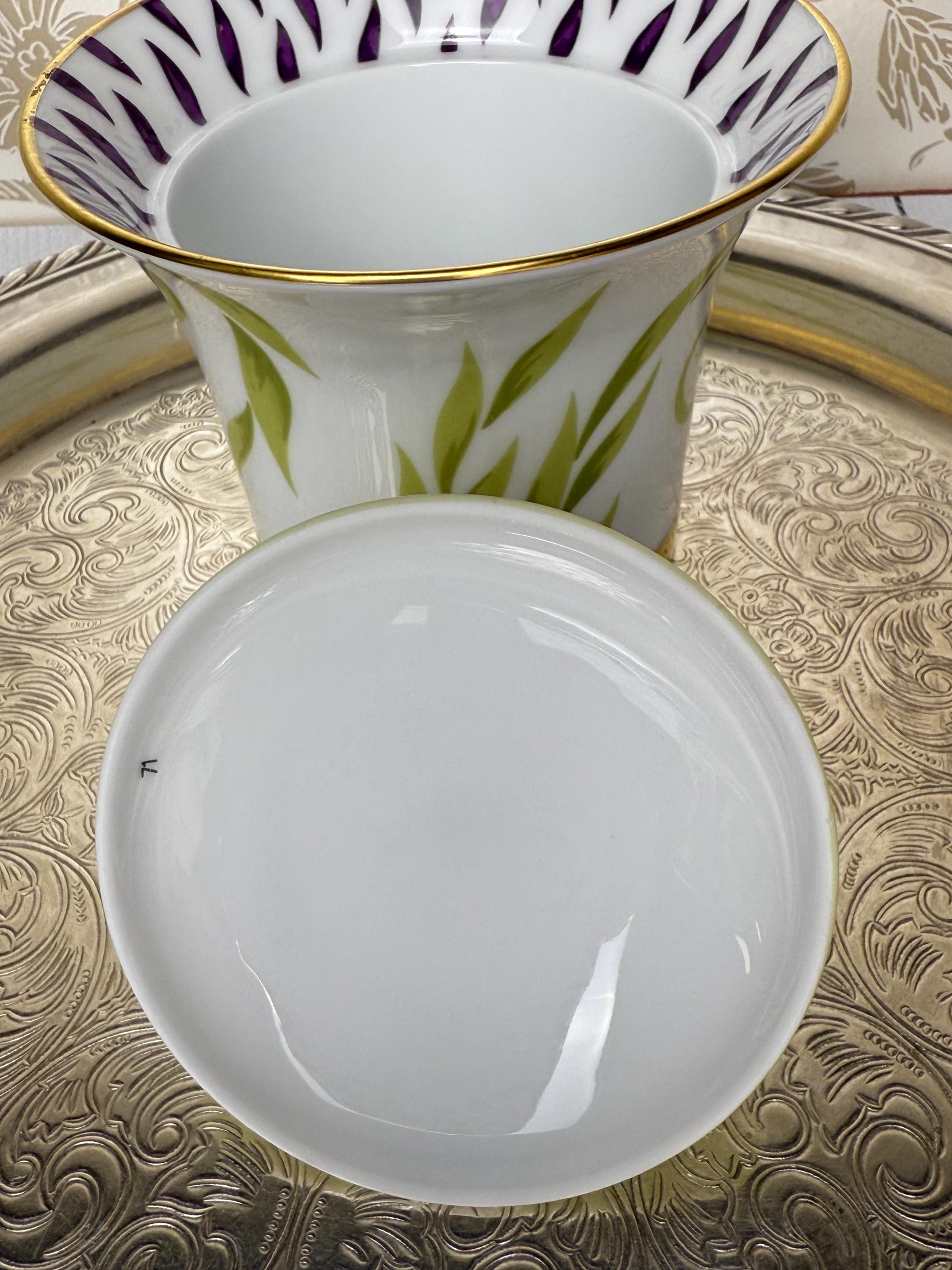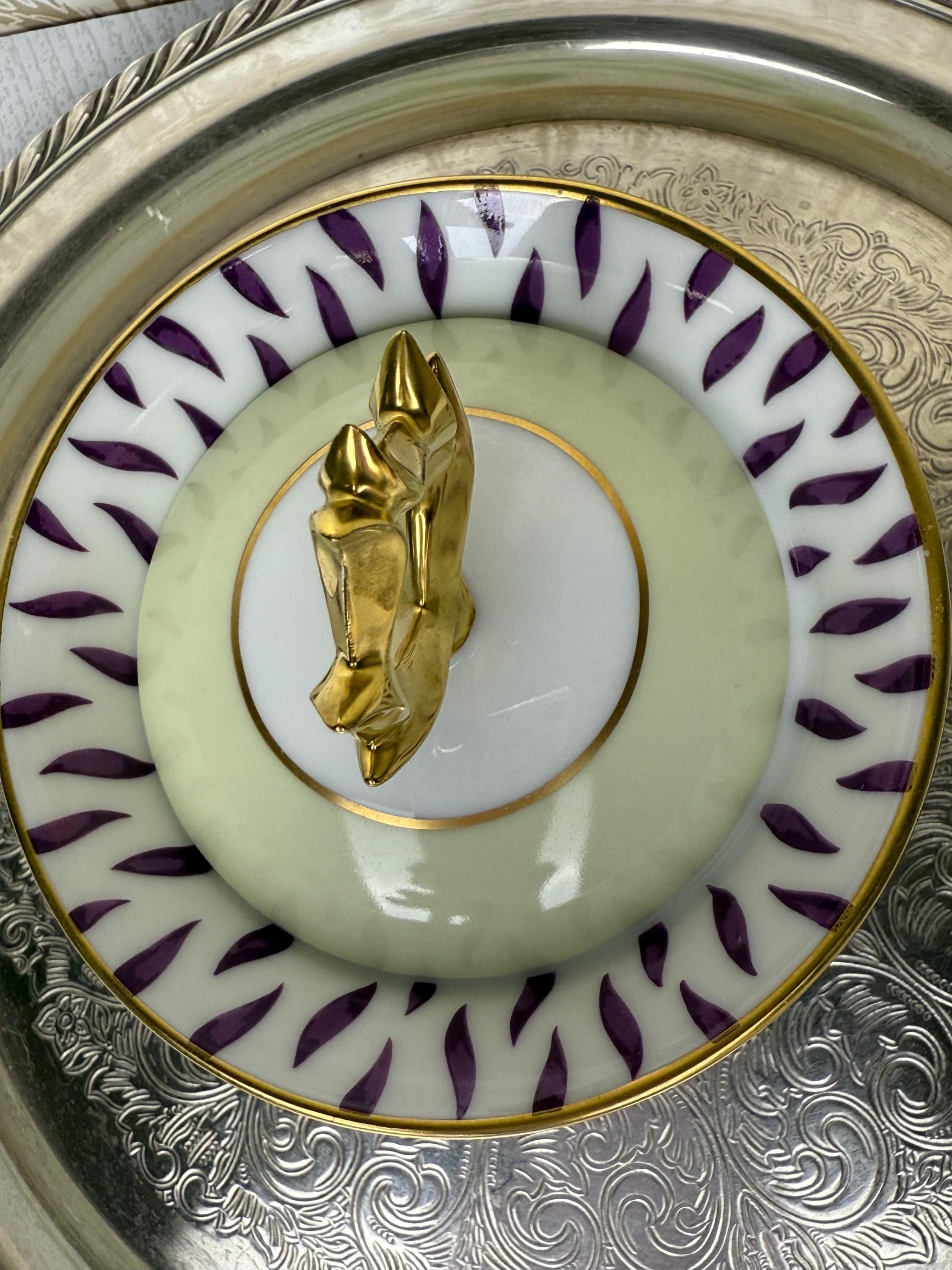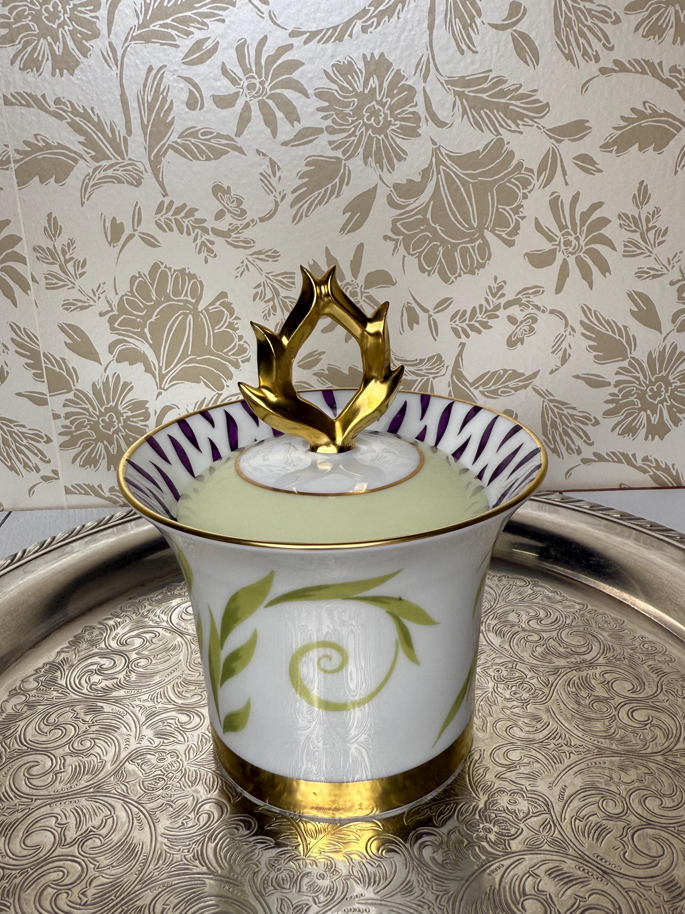 An exquisite piece of French porcelain artistry, this Bernardaud Frivole sugar bowl from Limoges is a rare blend of whimsical design and timeless elegance. Featuring the signature Frivole pattern — soft green swirling leaves, vibrant purple feathered accents, and gleaming gold trim — it’s crowned with a stunning sculptural finial that makes it as eye-catching as it is collectible.