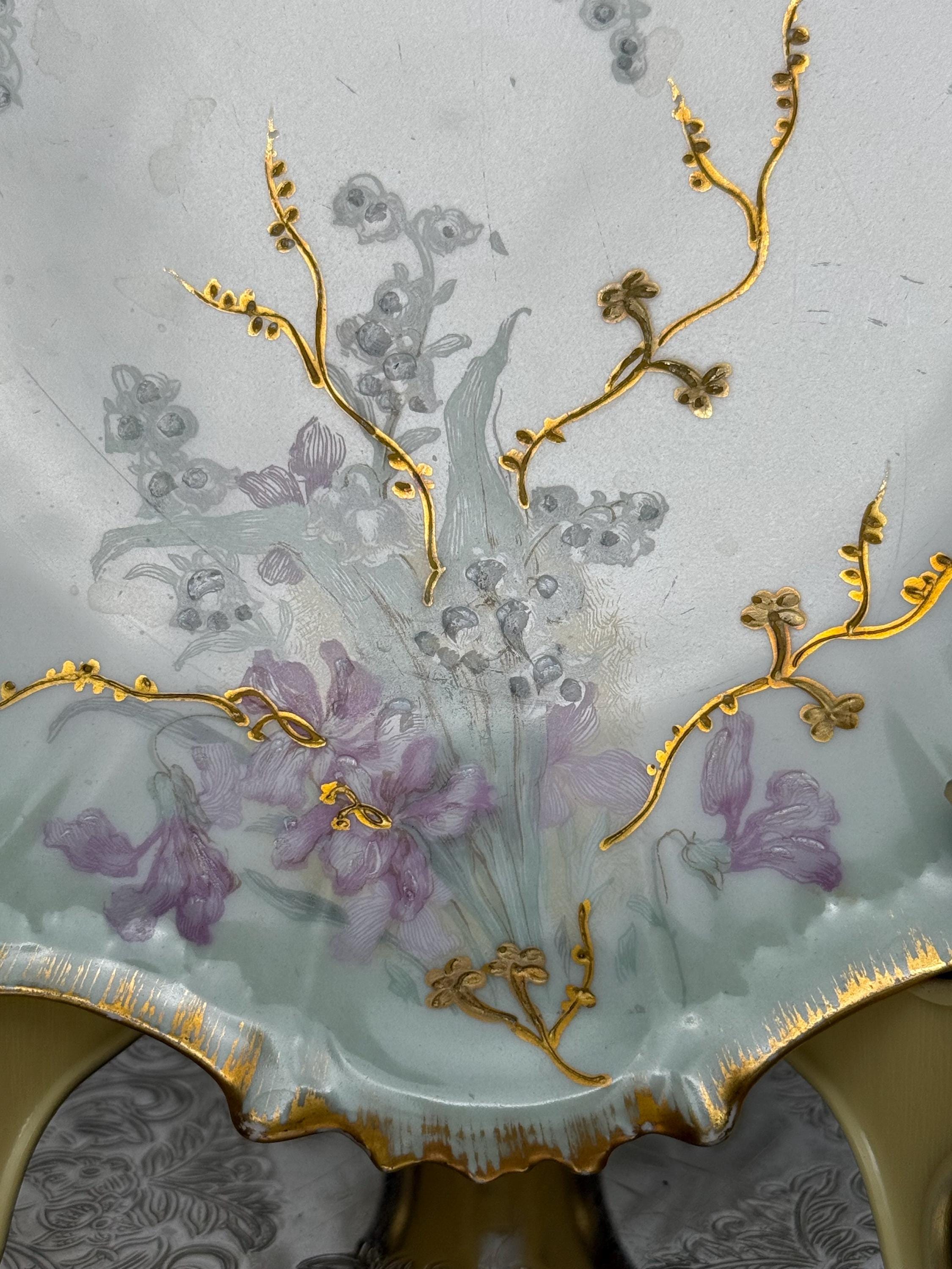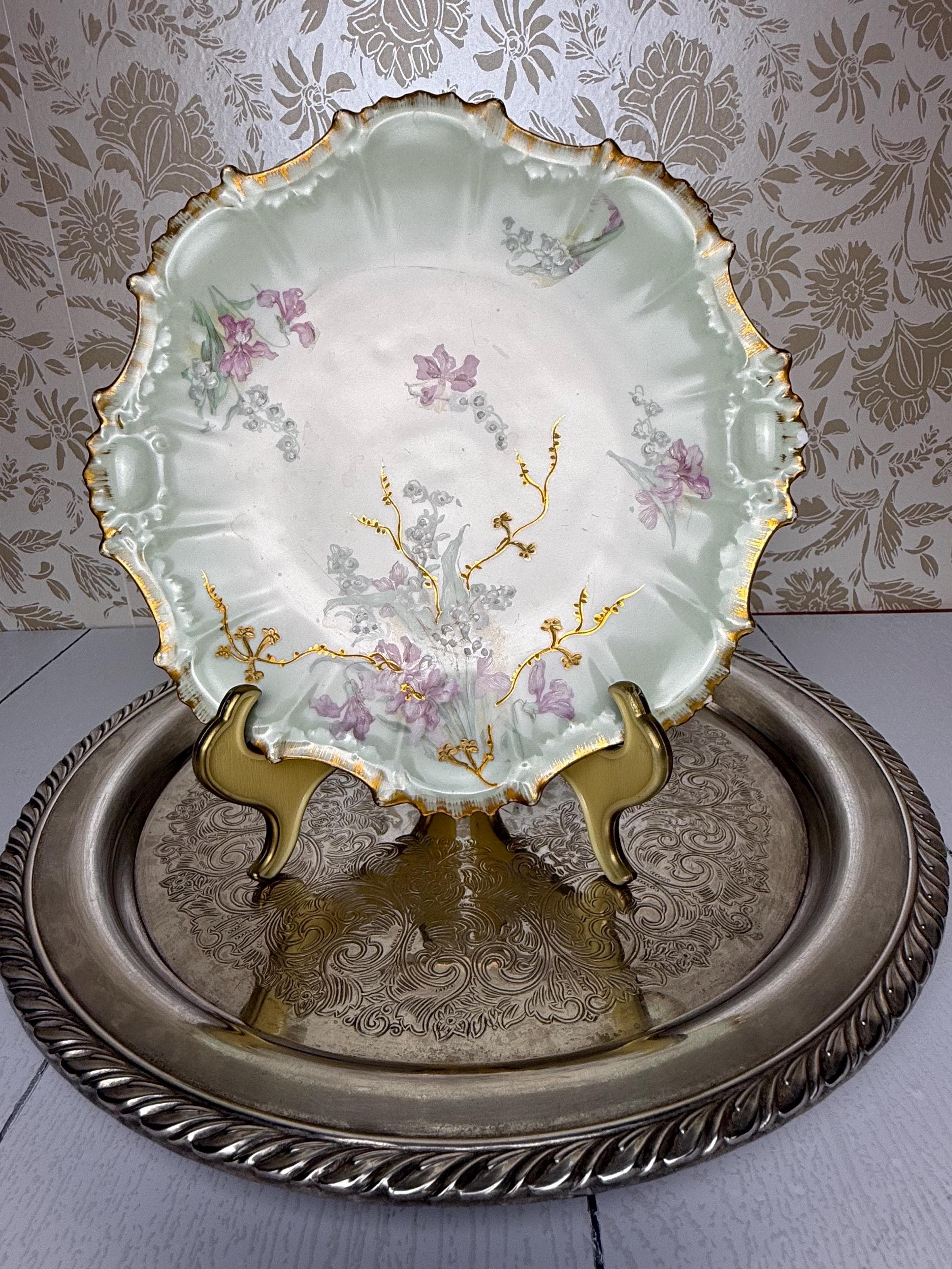 A true gem of antique French porcelain, this exquisite hand-painted Limoges plate features soft lavender irises and delicate lily of the valley, all framed with rich 24k gold accents and a dreamy celadon green border. The scalloped edge and ornate, painterly detail reflect the high artistry of late 19th-century Limoges work.