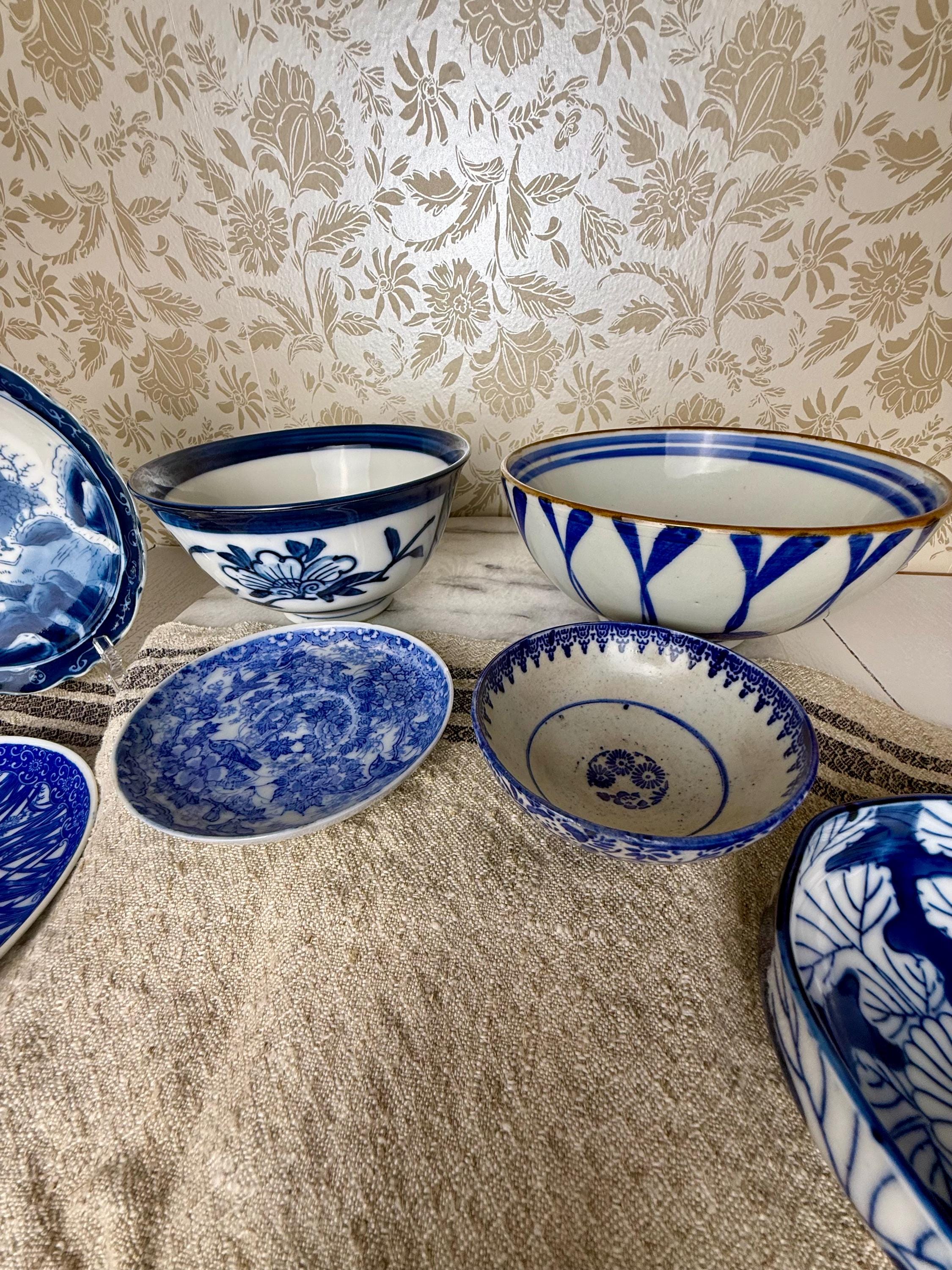 Bring timeless elegance to your home with this Chinoiserie blue and white porcelain set — seven handpicked vintage pieces blending Japanese Arita ware, sometsuke folk pottery, and English transferware. Ranging from petite 4” dishes to 7” serving bowls, each piece is decorated in deep cobalt blue with motifs including irises, songbirds, chrysanthemums, serene landscapes, and traditional East Asian figure scenes. Perfect for Japandi, cottagecore, and classic blue-and-white collectors, this set is equally at home in the kitchen, dining room, or as wall decor.