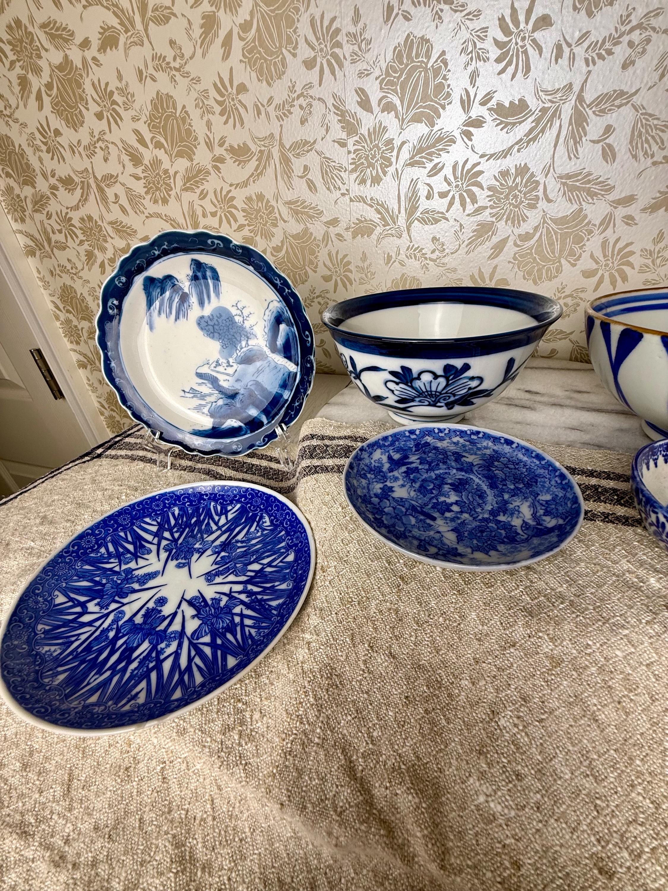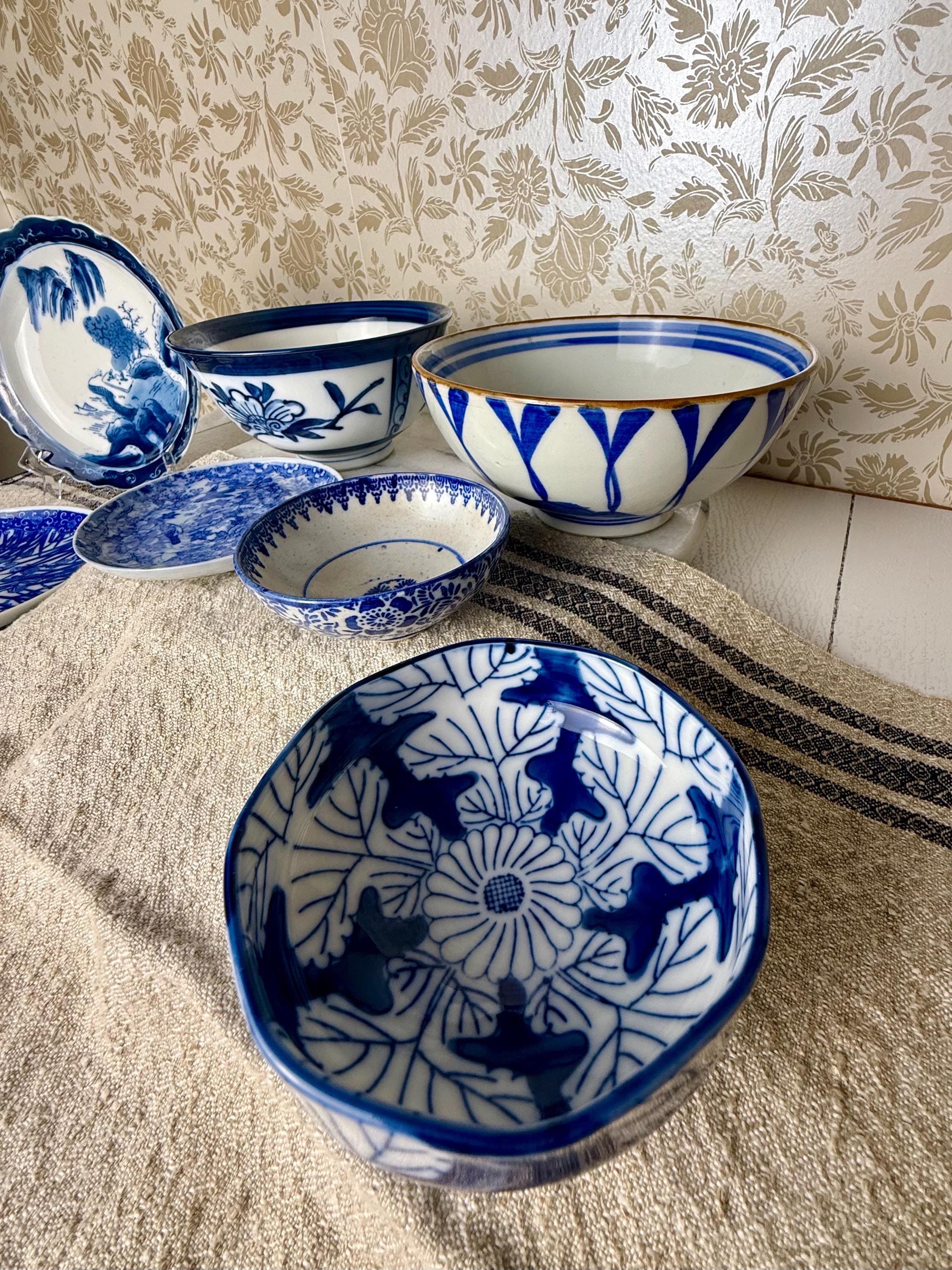I love how each dish and bowl tells its own story — a delicate floral here, a sweeping mountain scene there — yet together they form a perfectly harmonious blue-and-white porcelain collection. This set is for anyone who loves the mix of refined Japanese artistry, rustic mingei charm, and the romance of vintage transferware.