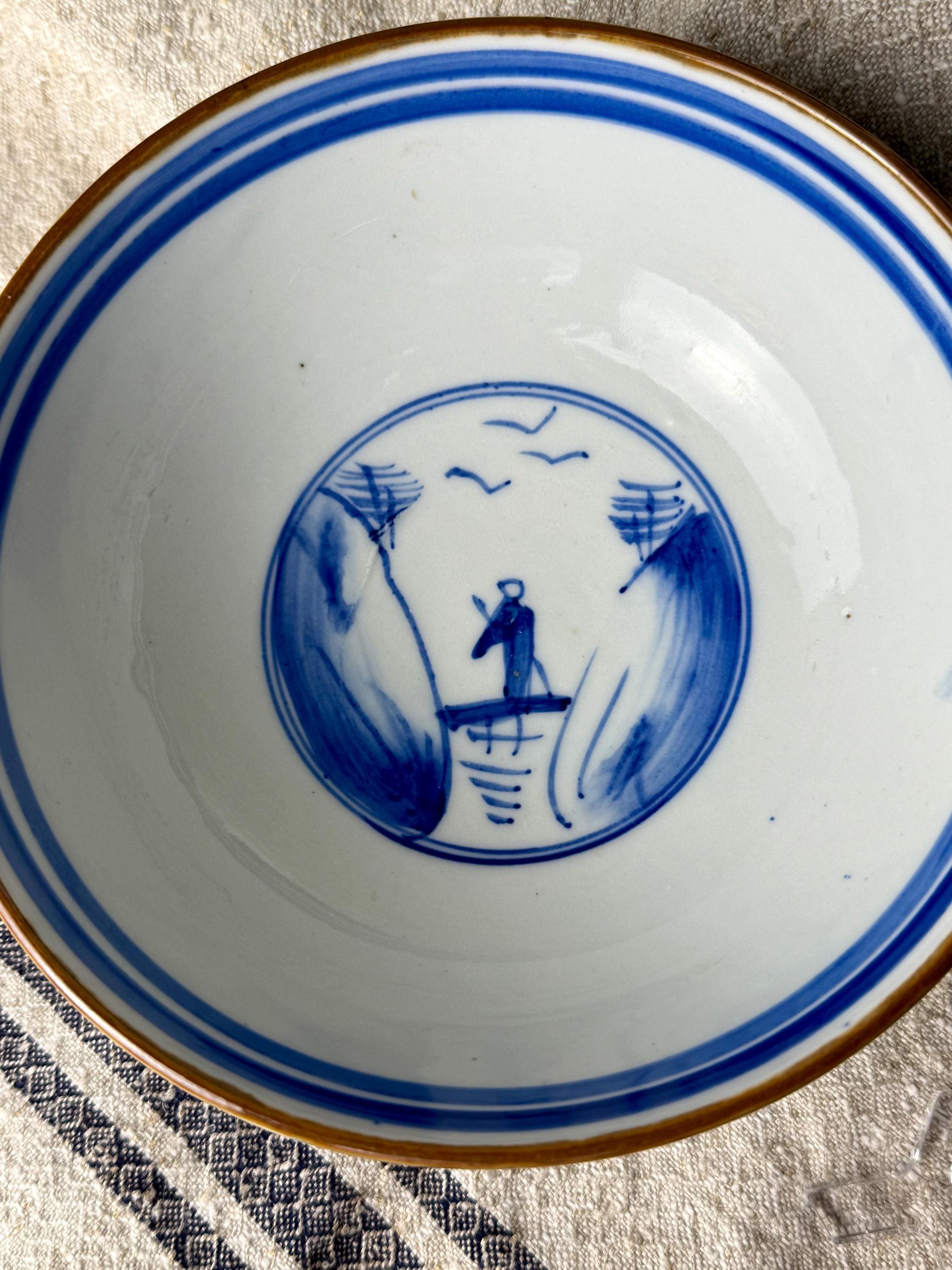 The largest bowl in this set reflects a classic East Asian art theme — a lone figure on a raft, framed by trees and birds. Such imagery symbolized travel, solitude, and harmony with nature, and was a favorite subject for export porcelains bound for Europe and the Americas.
