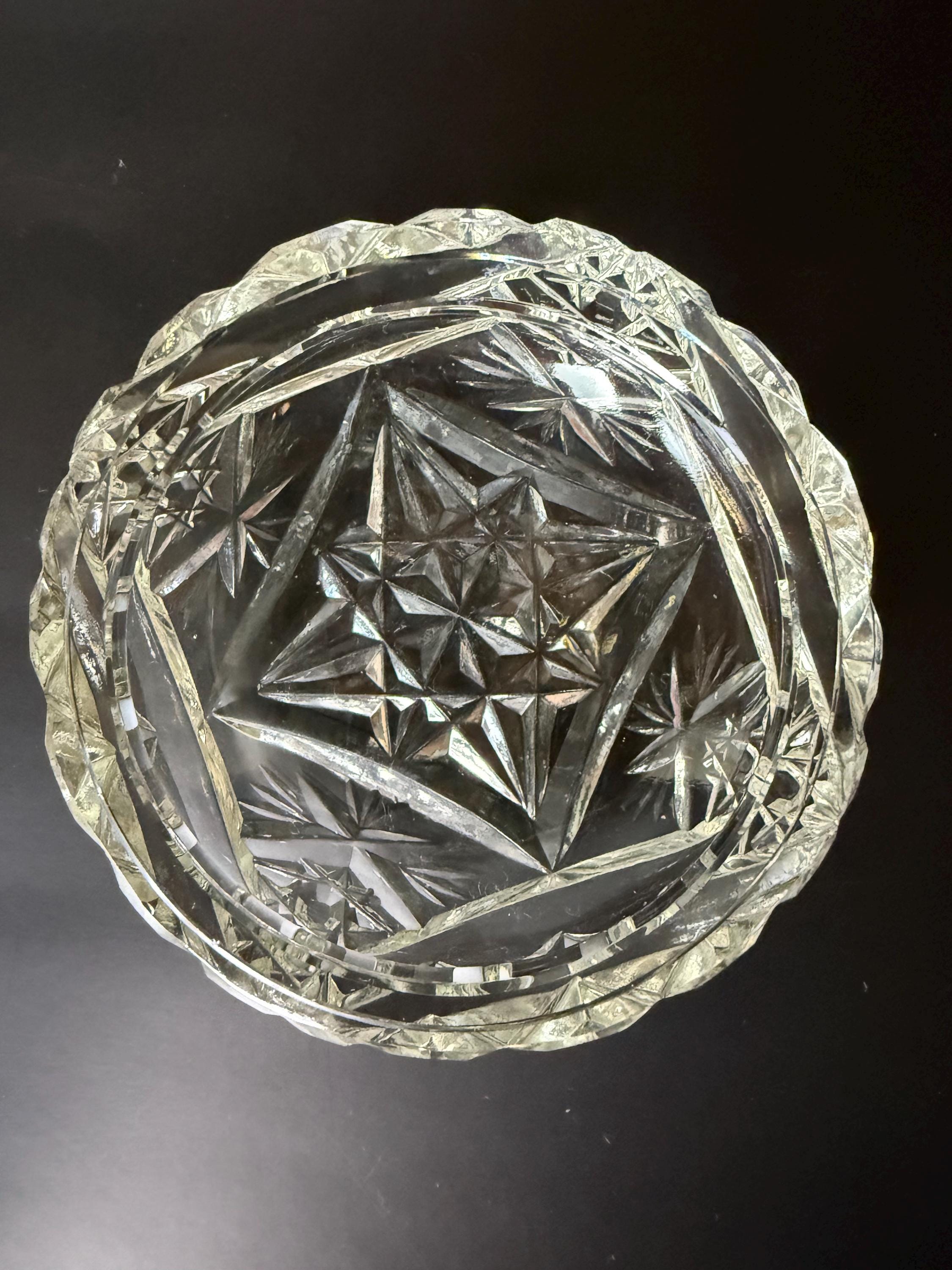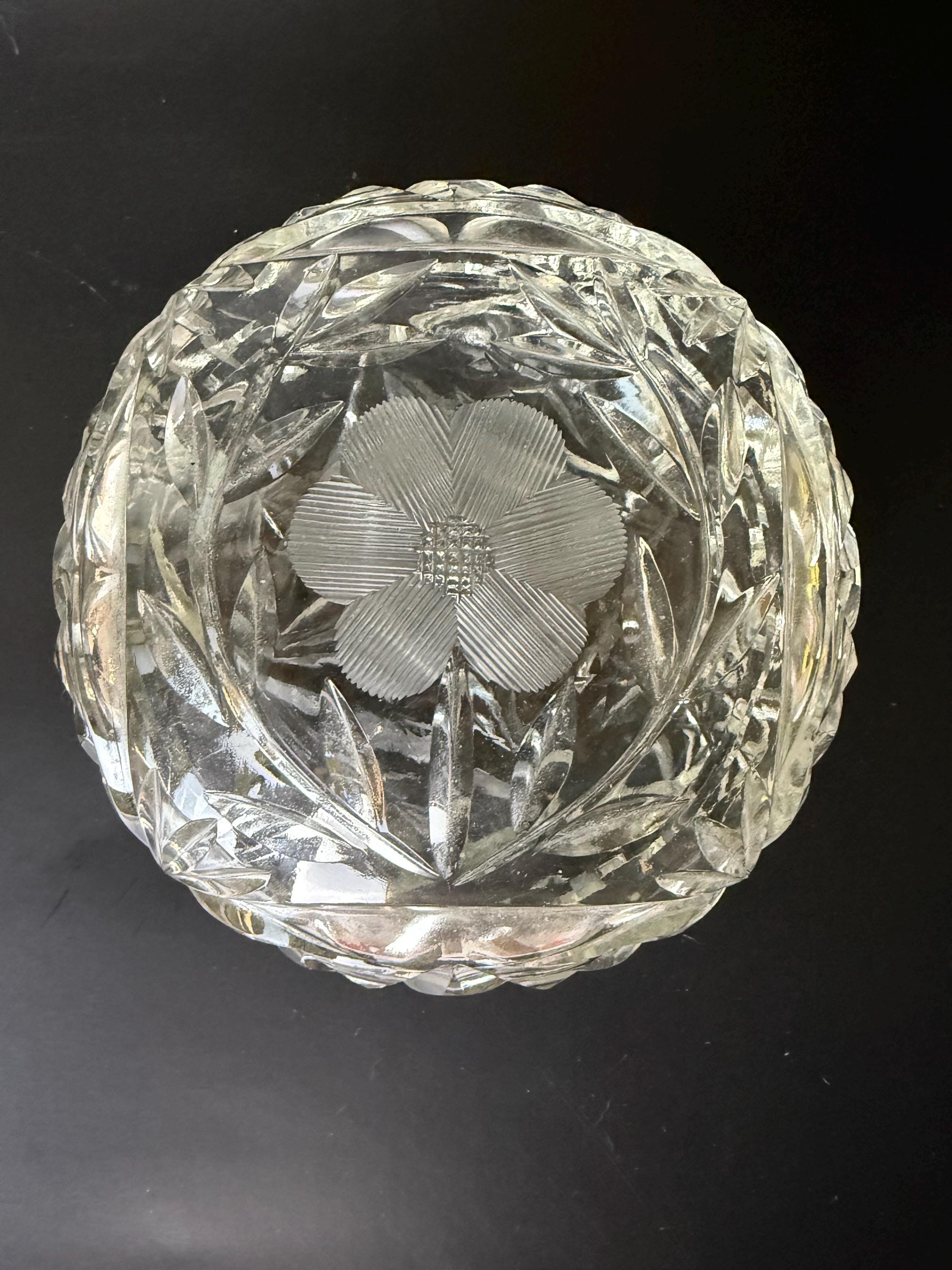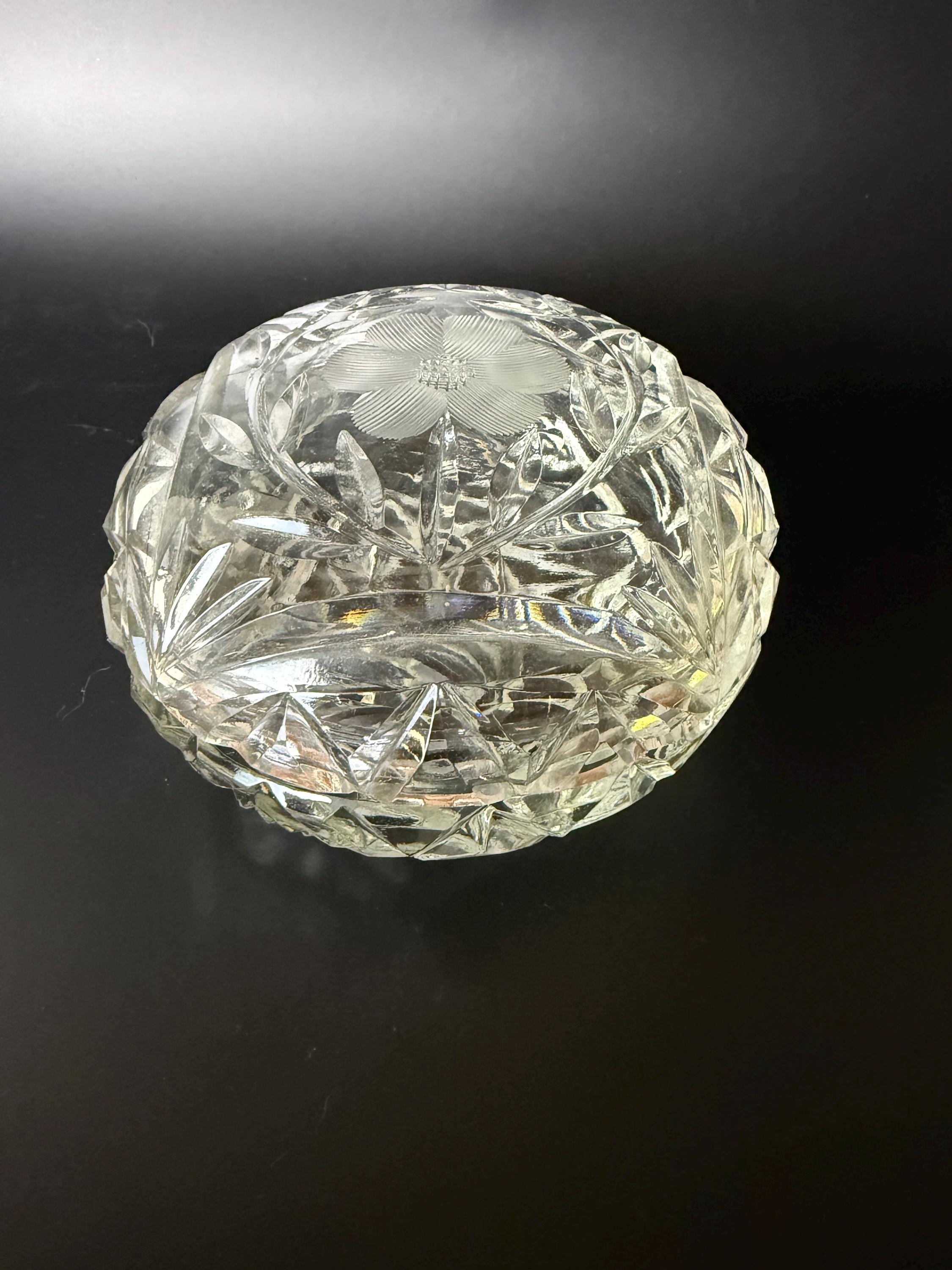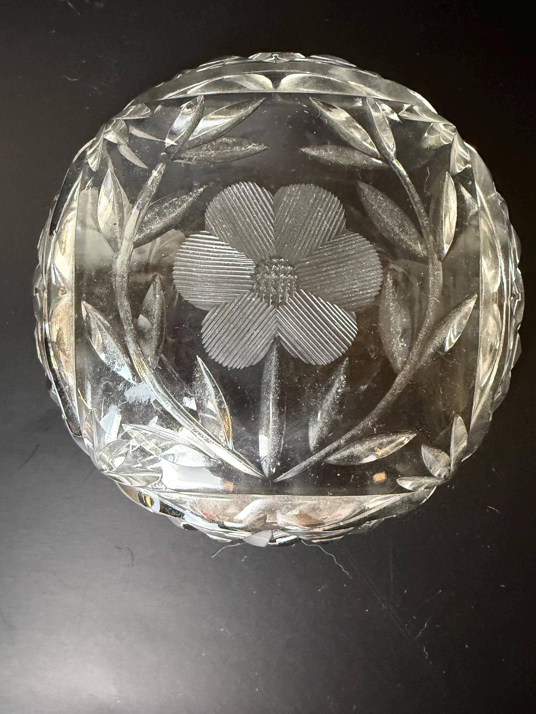 This vintage cut crystal powder dish from Bohemia, Czech Republic, is a petite treasure with timeless charm. Measuring 4” across and 2.25” tall, it features a beautifully etched floral motif on the lid, leafy engraving around the sides, and a radiant starburst on the base.