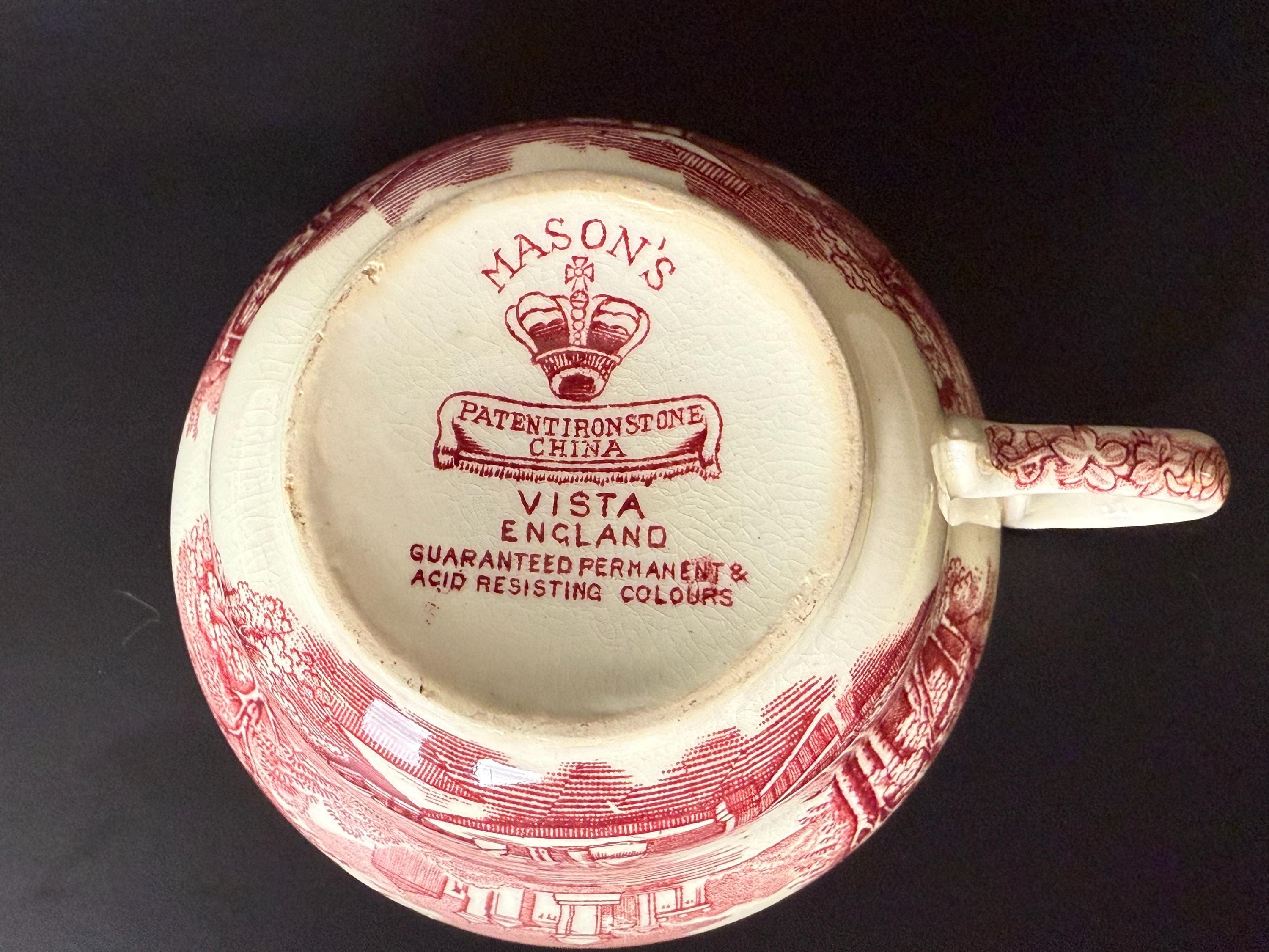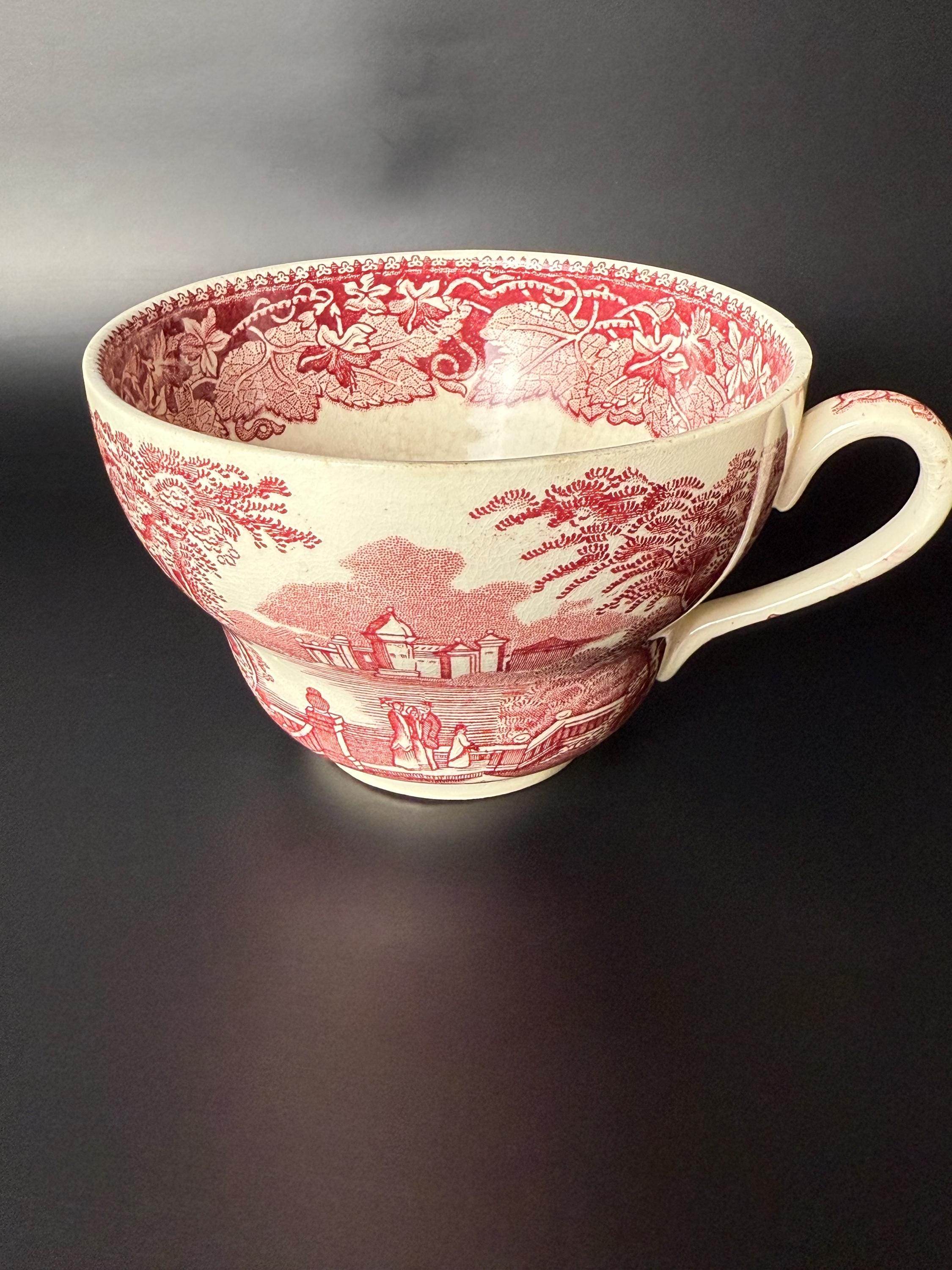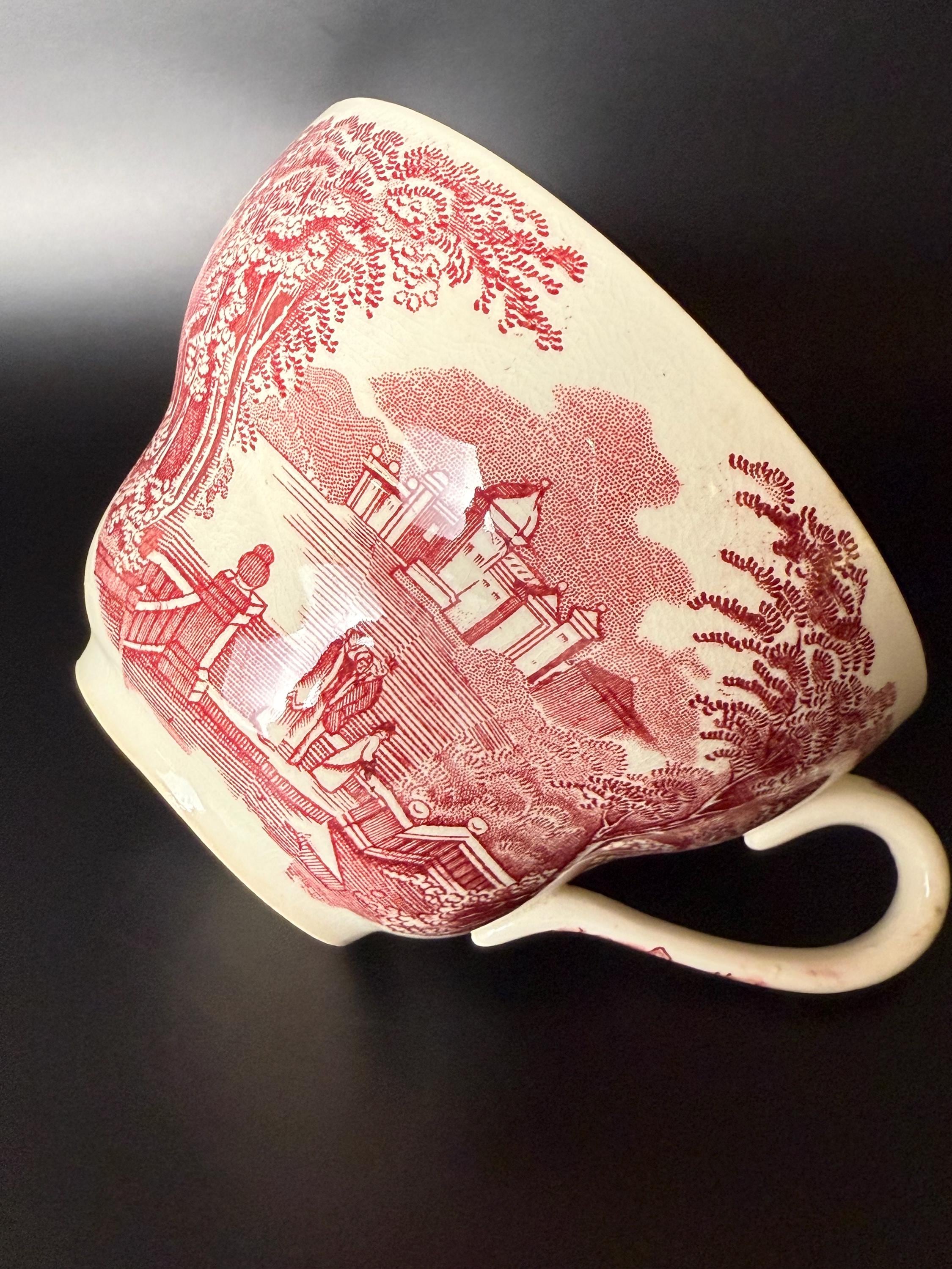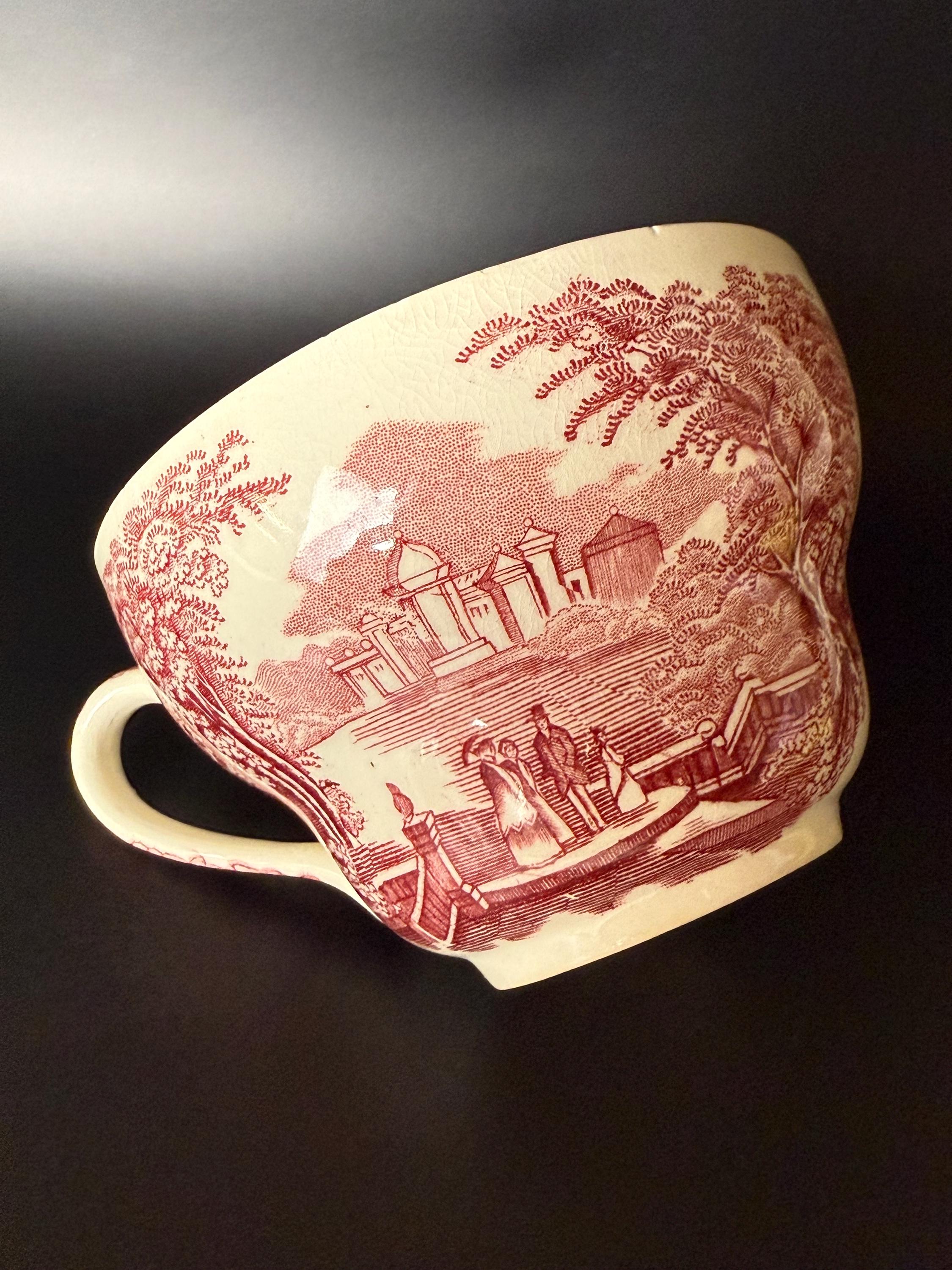 • The Cup: An early 20th-century Mason’s Vista extra-large “junk cup,” a generously sized ironstone vessel decorated in matching deep red countryside scenes.