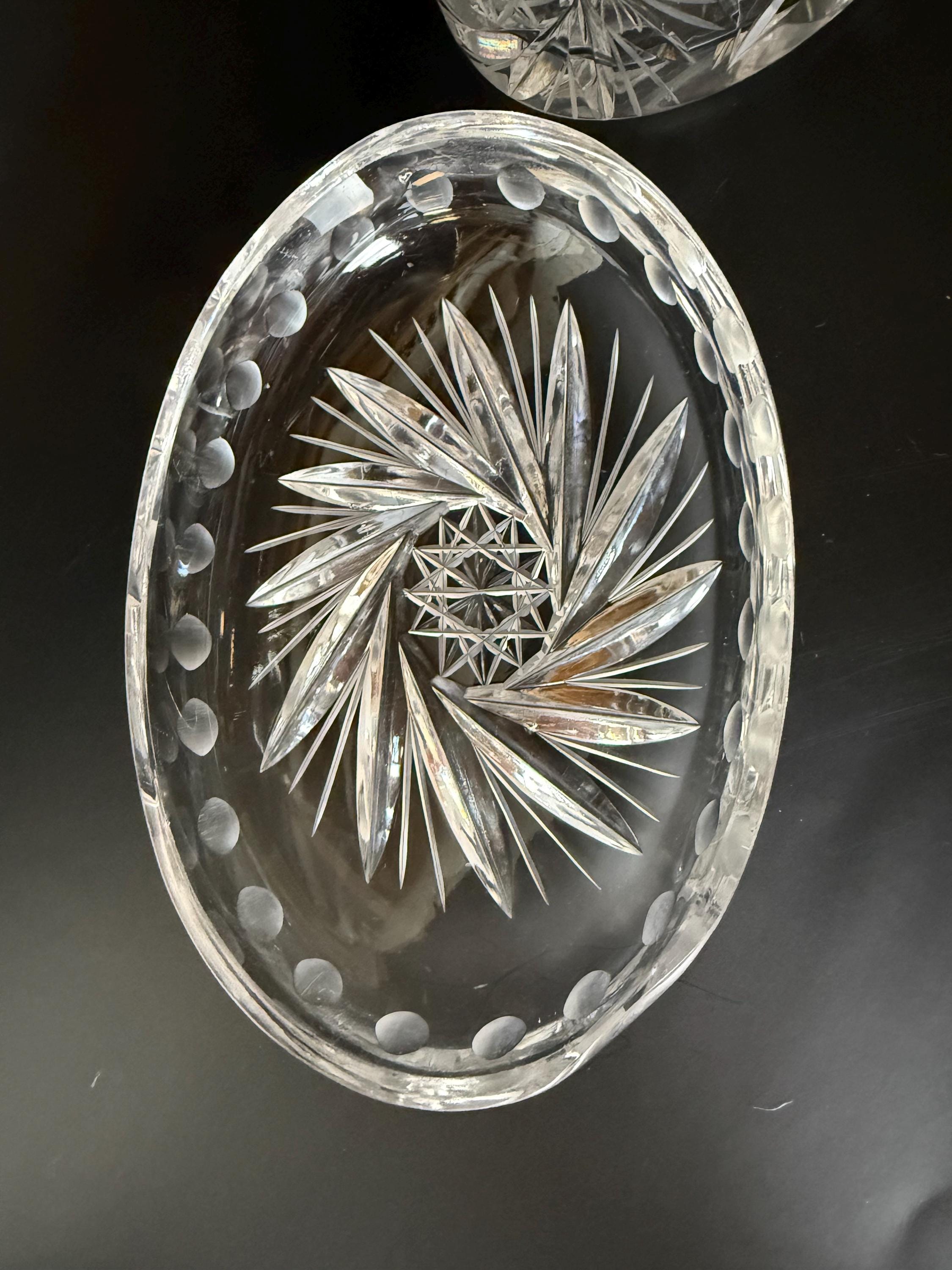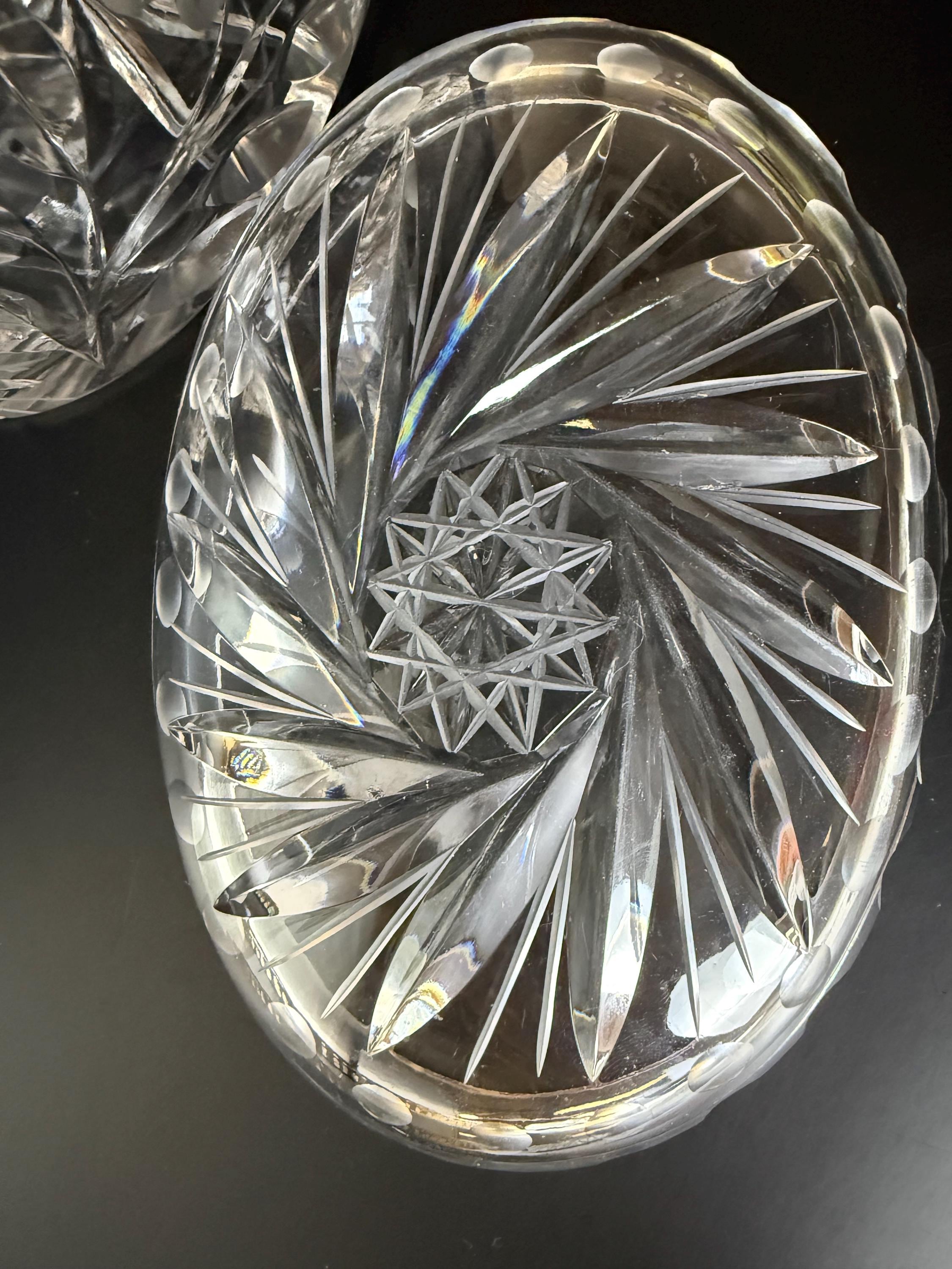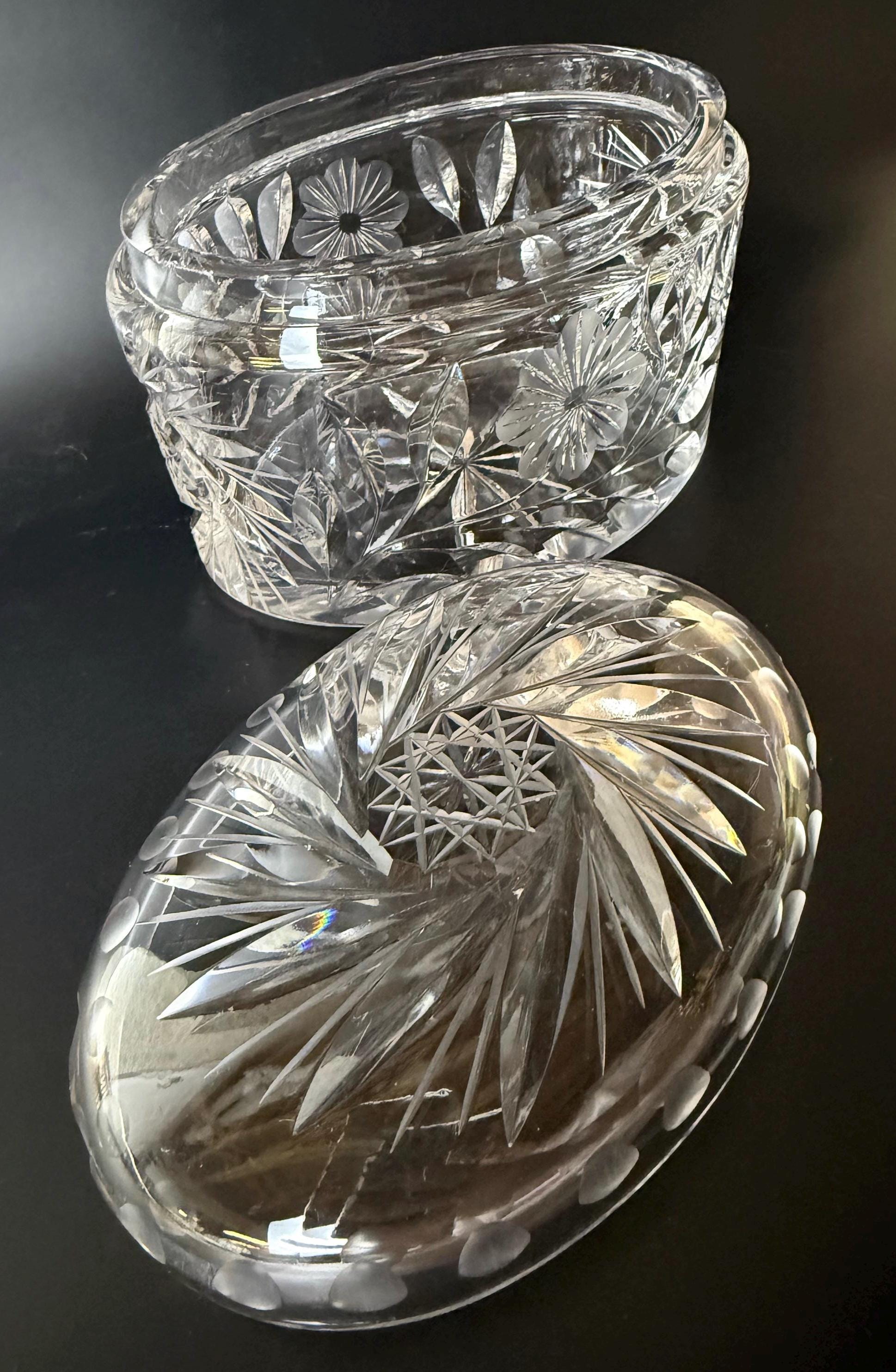 This stunning vintage cut crystal jar with lid captures the timeless beauty of mid-20th century European crystal. Measuring 6” long, 3.5” wide, and 3.75” tall, it dazzles with deeply cut floral motifs, a dotted rim detail, and brilliant starburst patterns on both lid and base.