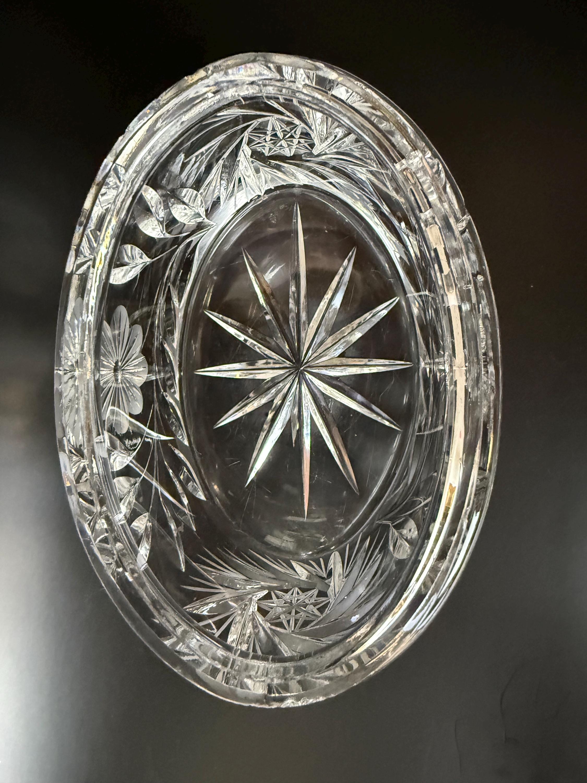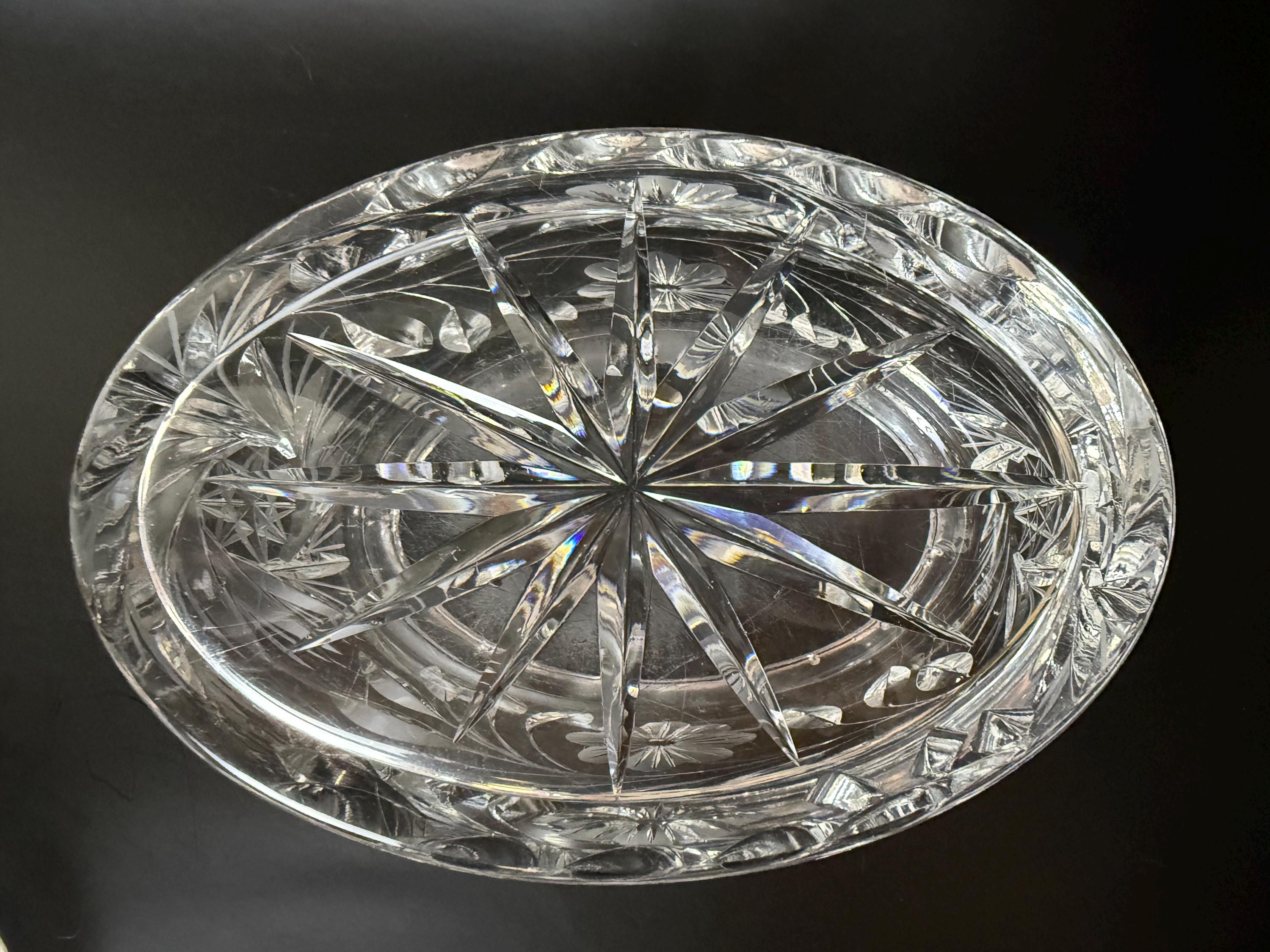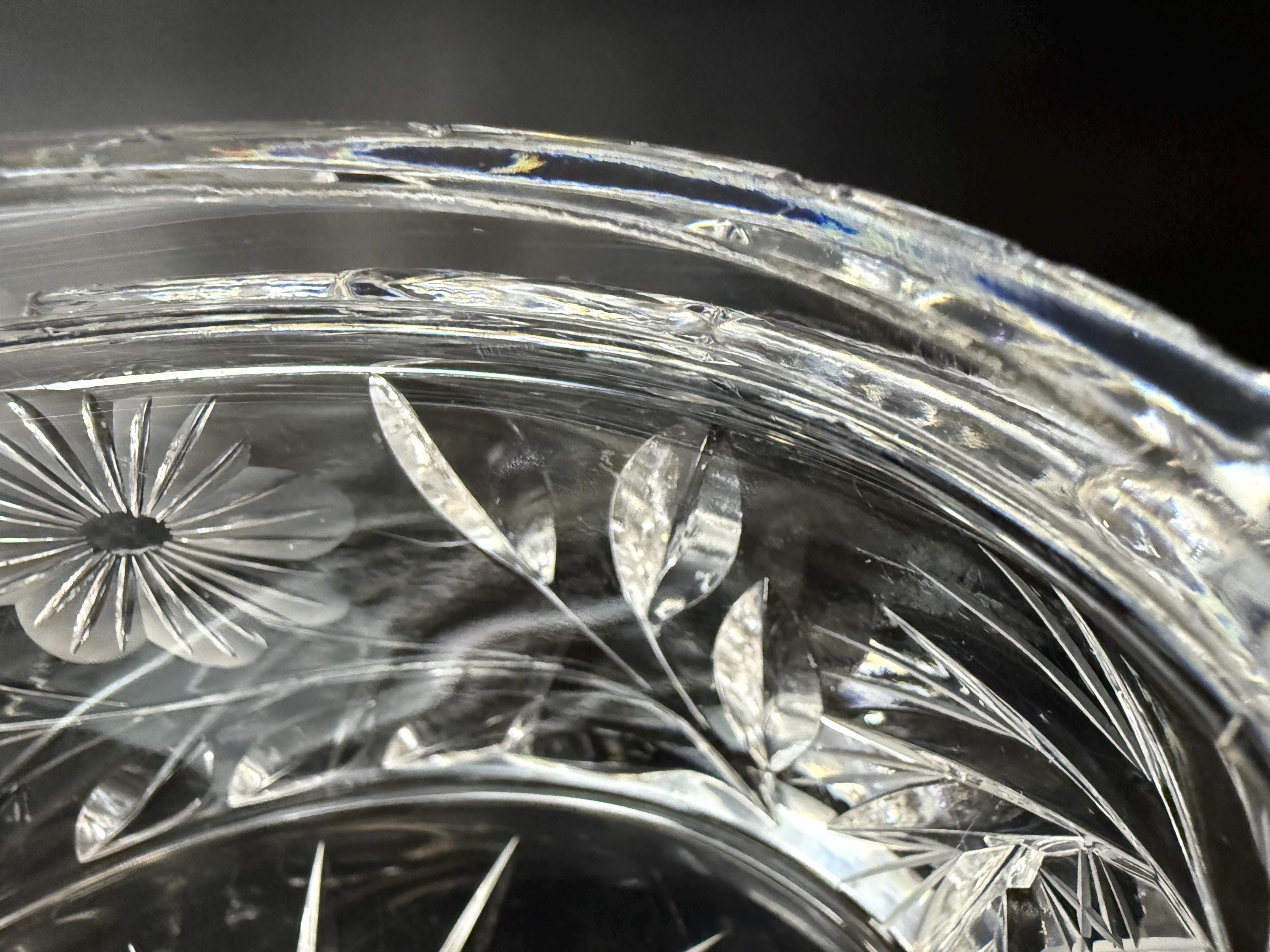 This stunning vintage cut crystal jar with lid captures the timeless beauty of mid-20th century European crystal. Measuring 6” long, 3.5” wide, and 3.75” tall, it dazzles with deeply cut floral motifs, a dotted rim detail, and brilliant starburst patterns on both lid and base.