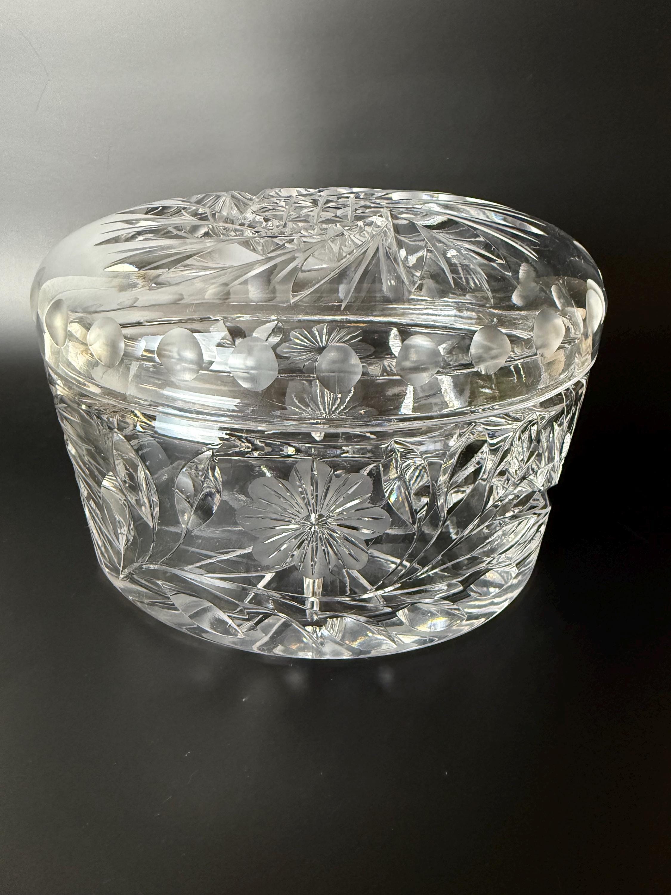Lead crystal has been cherished since the 18th century for its clarity and brilliance, achieved by adding lead oxide to glass. This allows for deep cutting and faceting, which enhances the sparkle when light hits the surface. By the mid-20th century, European makers were producing crystal jars like this in a wide range of floral and geometric designs, often used in dining rooms or vanities as elegant but practical storage.