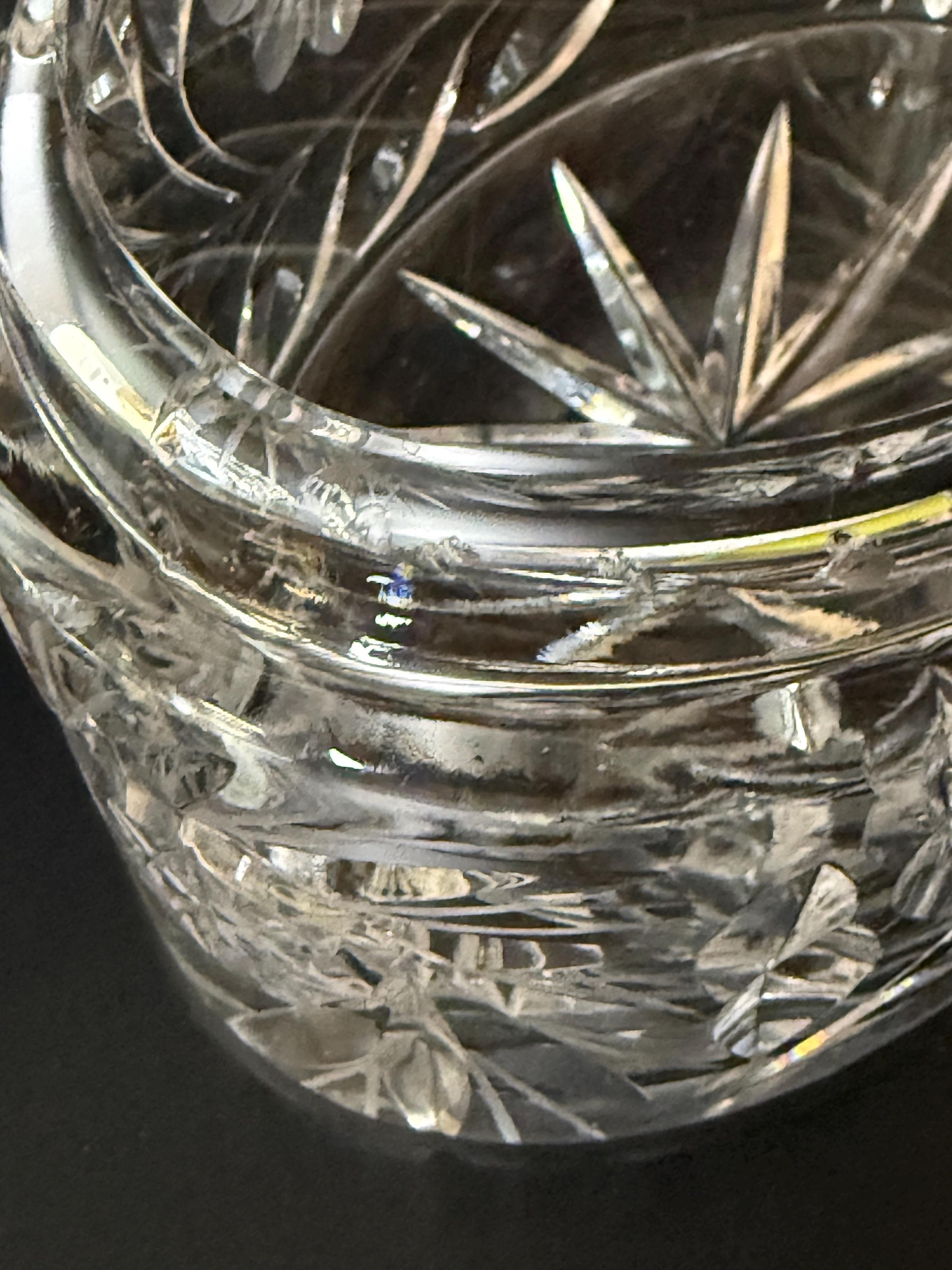 Heavy in the hand and richly refractive, this jar was likely used to hold candies, cookies, or trinkets — but today it makes a gorgeous jewelry box, vanity piece, or decorative accent. It shows a few small rim chips and gentle hazing on the bottom, signs of a life well-lived, but overall remains a striking piece of crystal craftsmanship.
