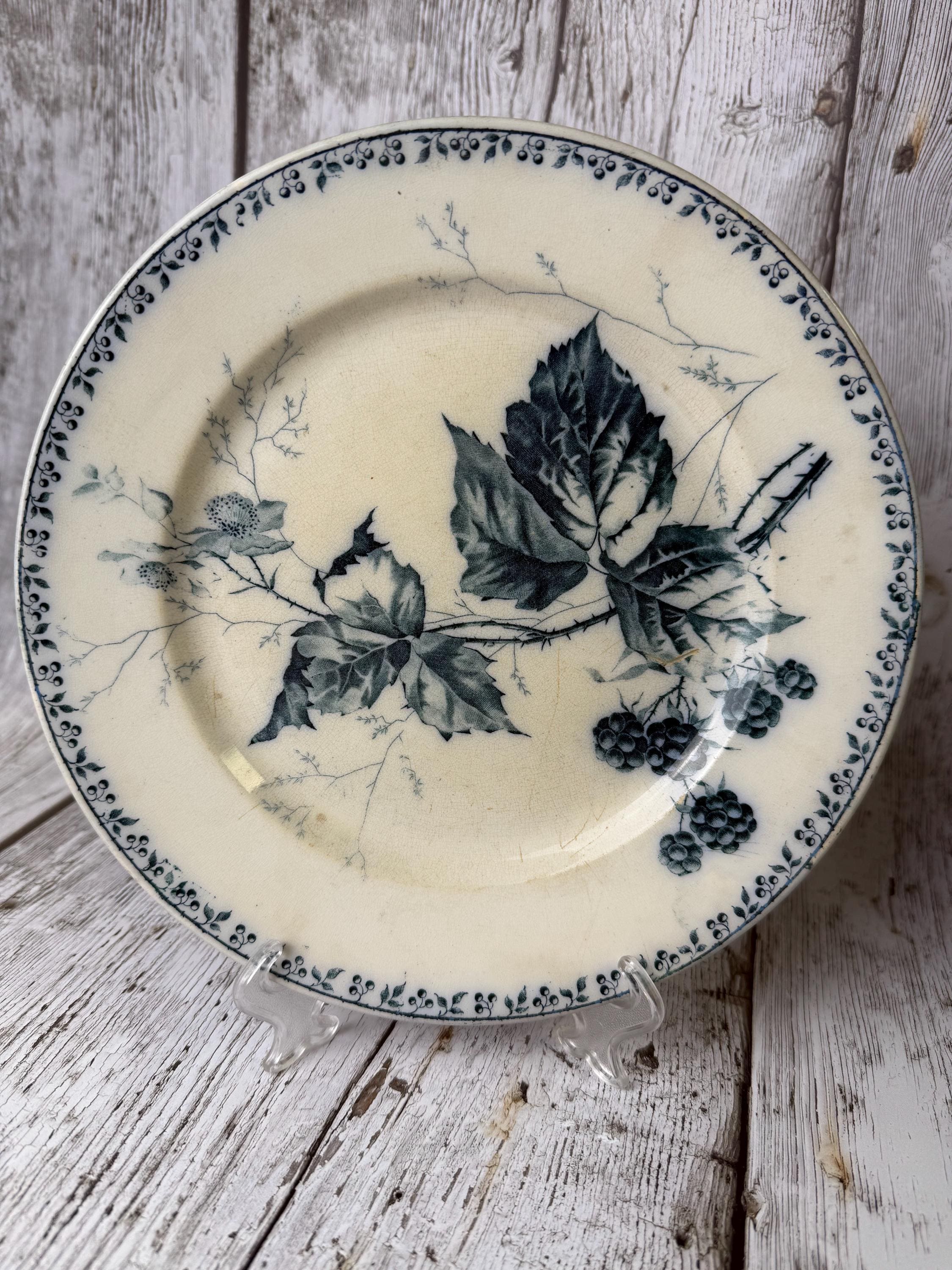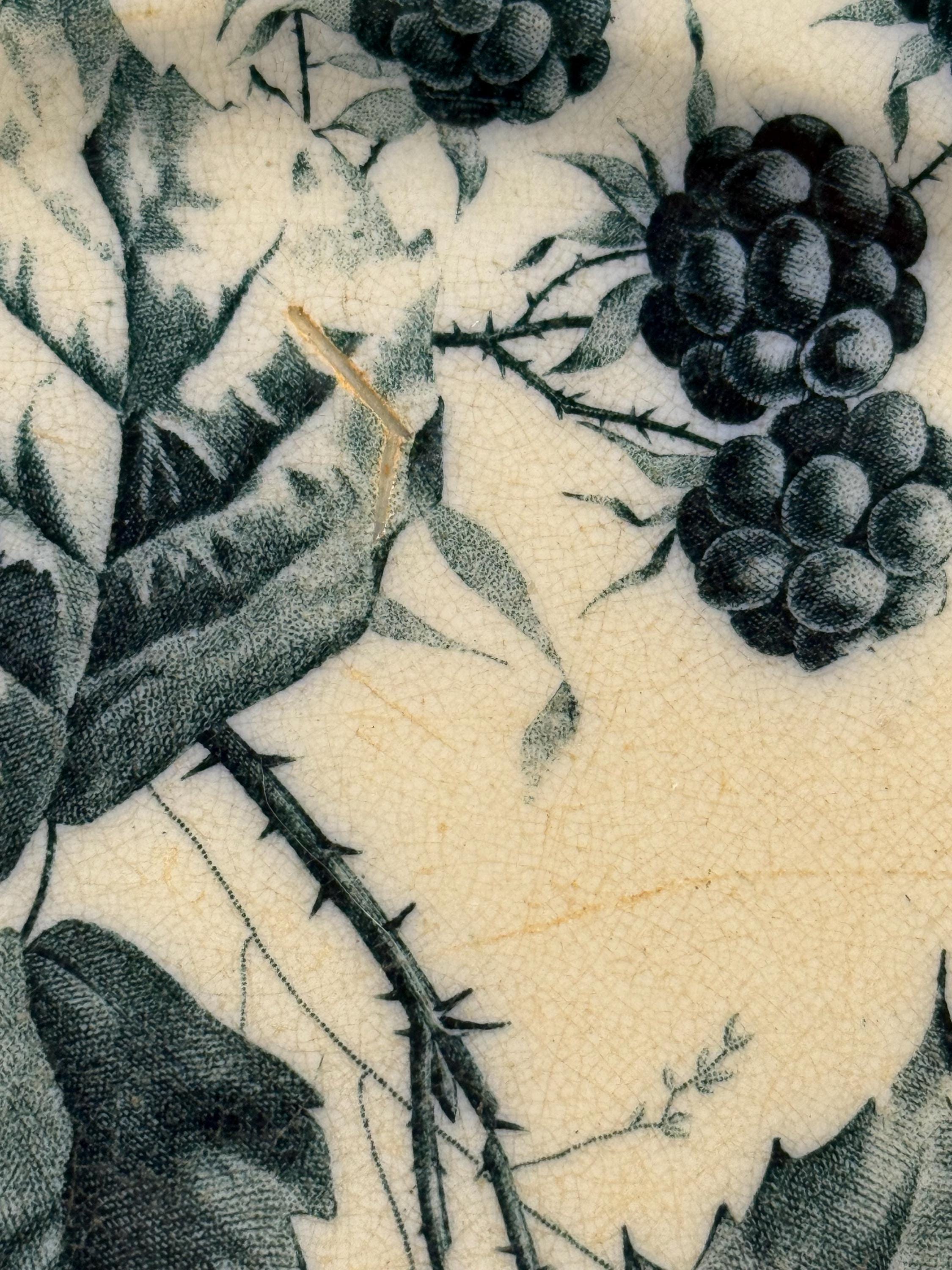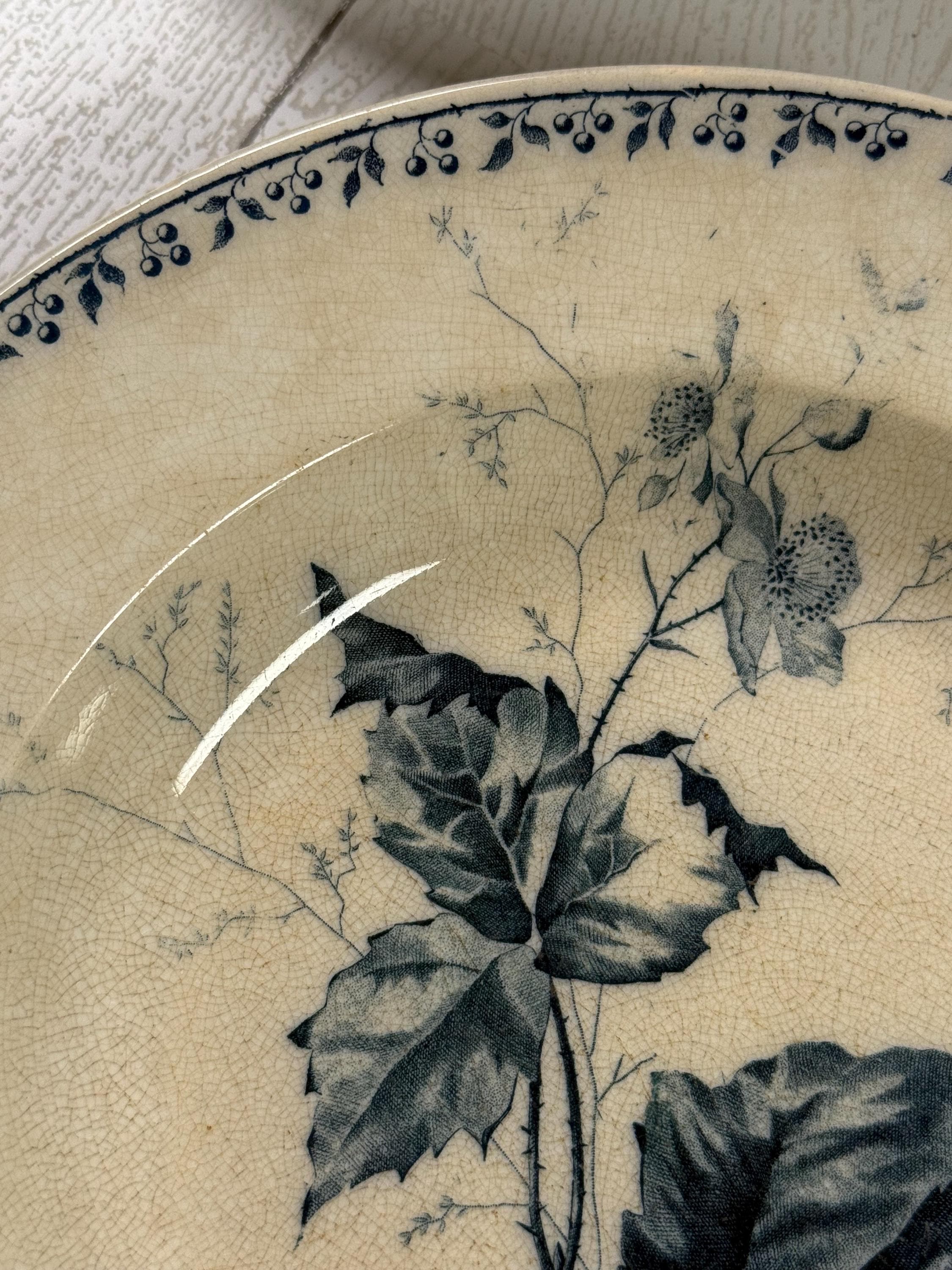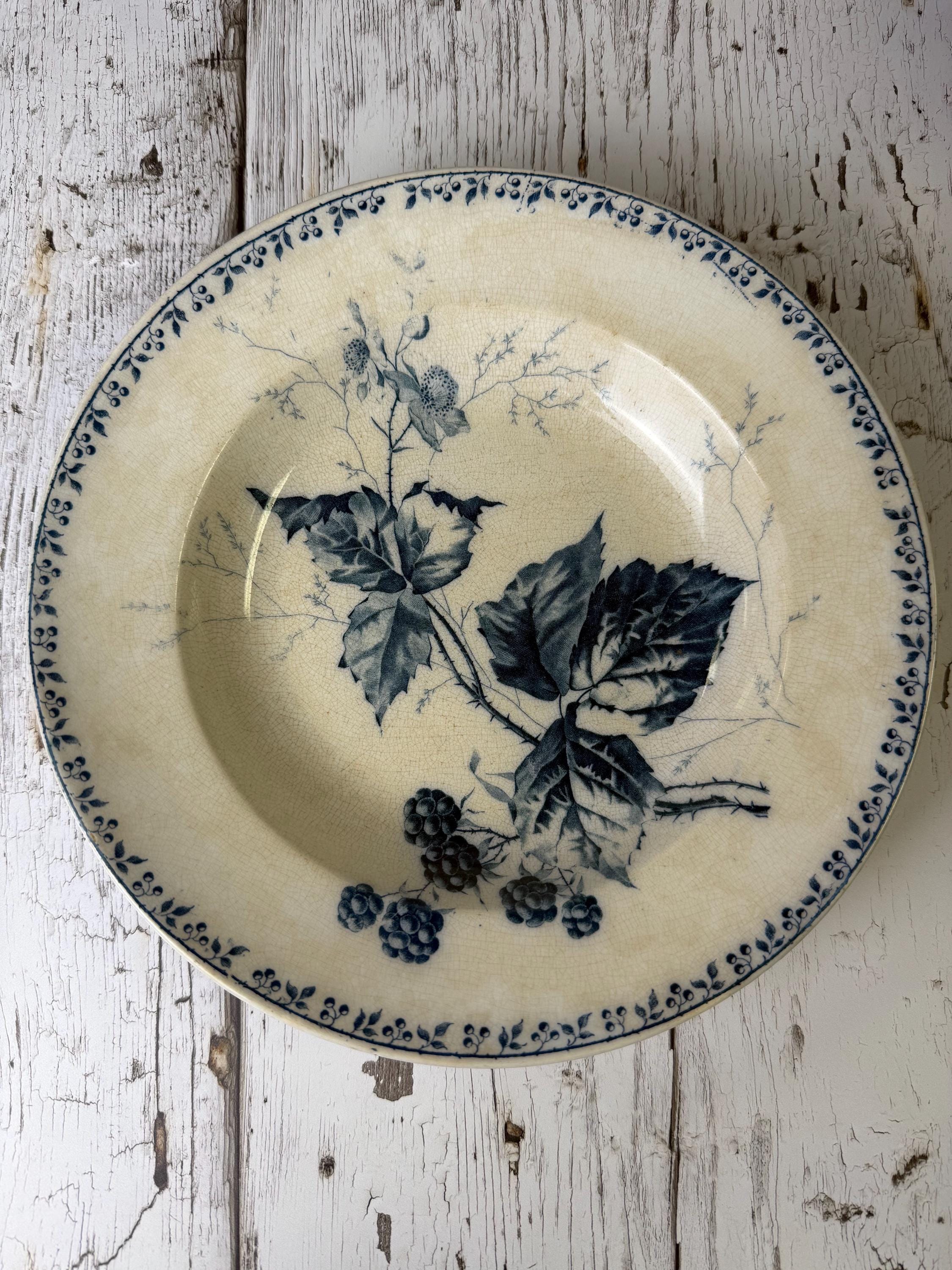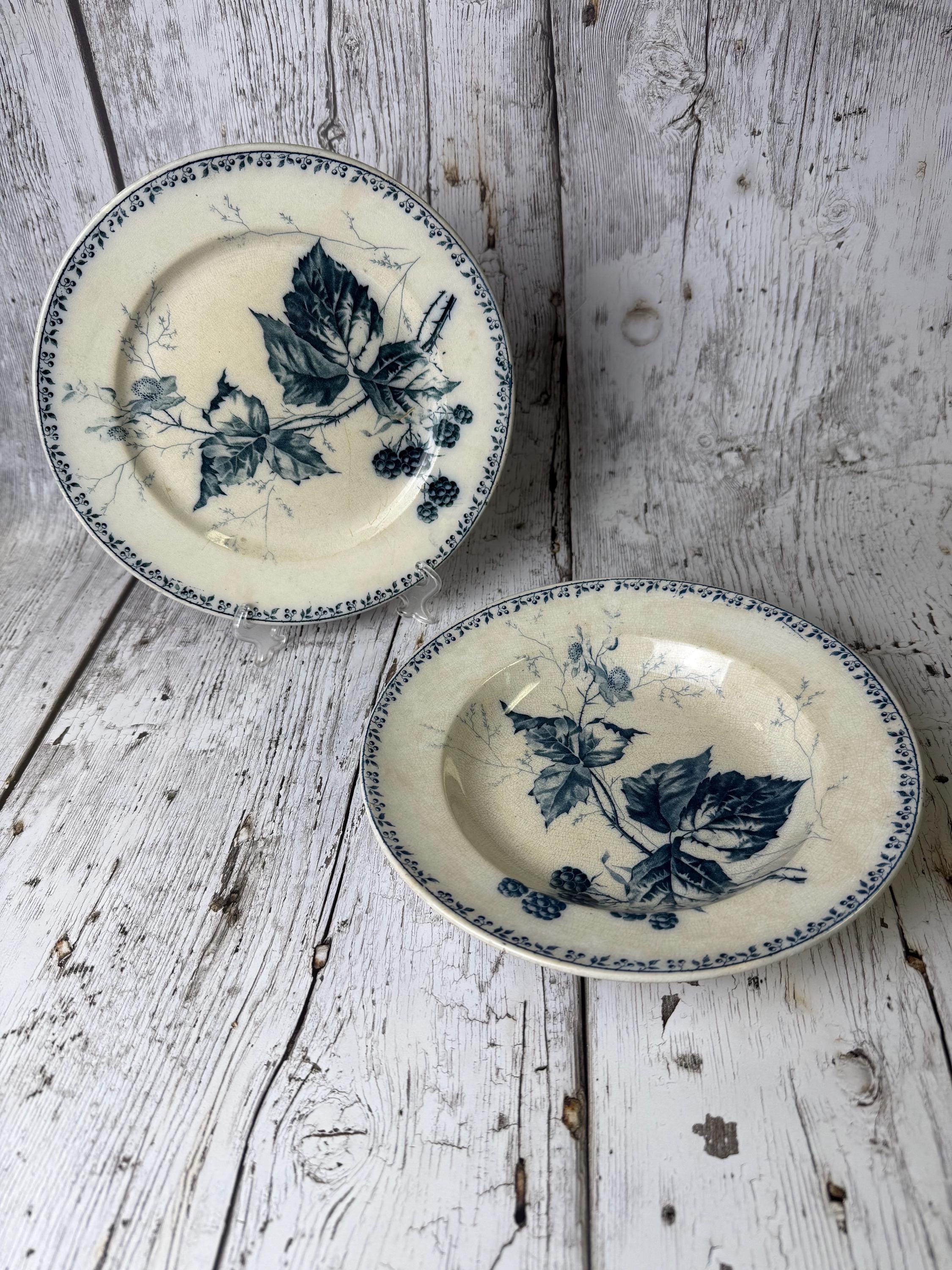 This beautiful matched set includes a plate and shallow bowl from Villeroy & Boch’s beloved “Rubus” pattern, produced in Mettlach, Germany in the late 1800s. The pieces feature exquisite deep blue-black blackberry branches and leaves, framed with a delicate patterned border.