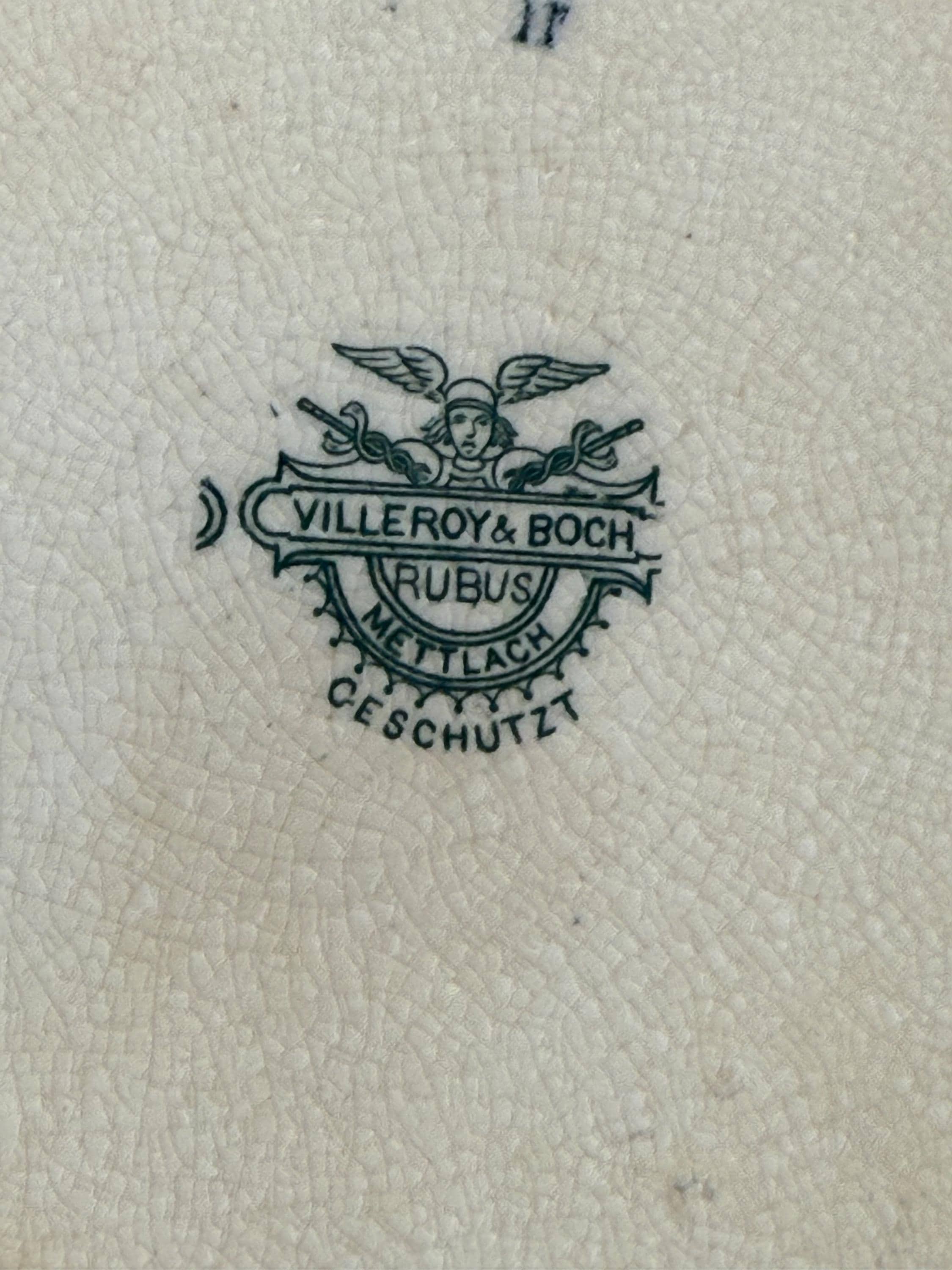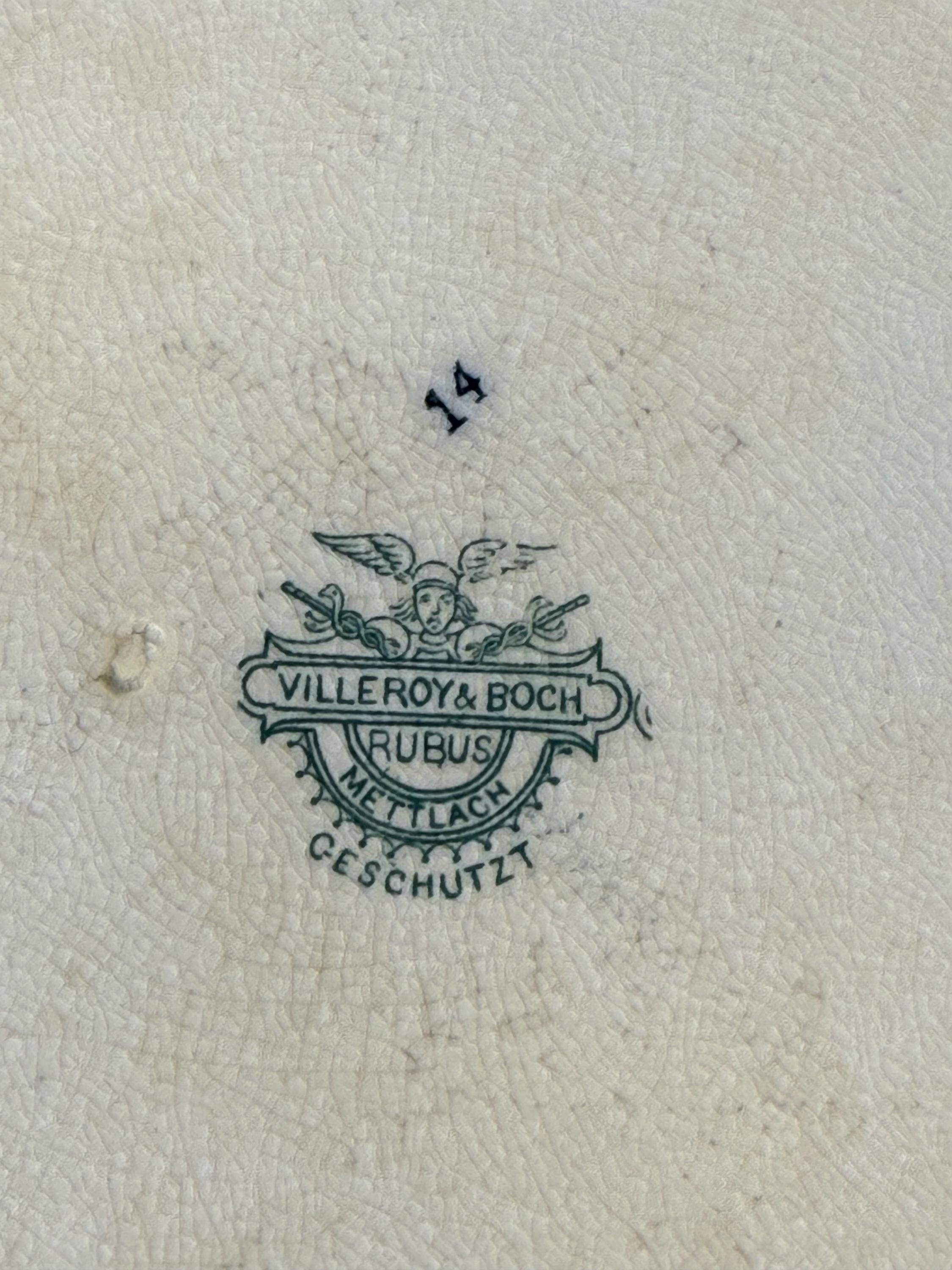 Founded in 1748, Villeroy & Boch is one of Europe’s most respected ceramics manufacturers. The “Rubus” pattern, named for the Latin word for bramble or blackberry, was introduced in the late 19th century and quickly became a customer favorite. The Geschützt mark indicated copyright protection under German law — a sign of how popular and distinctive the pattern was at the time.