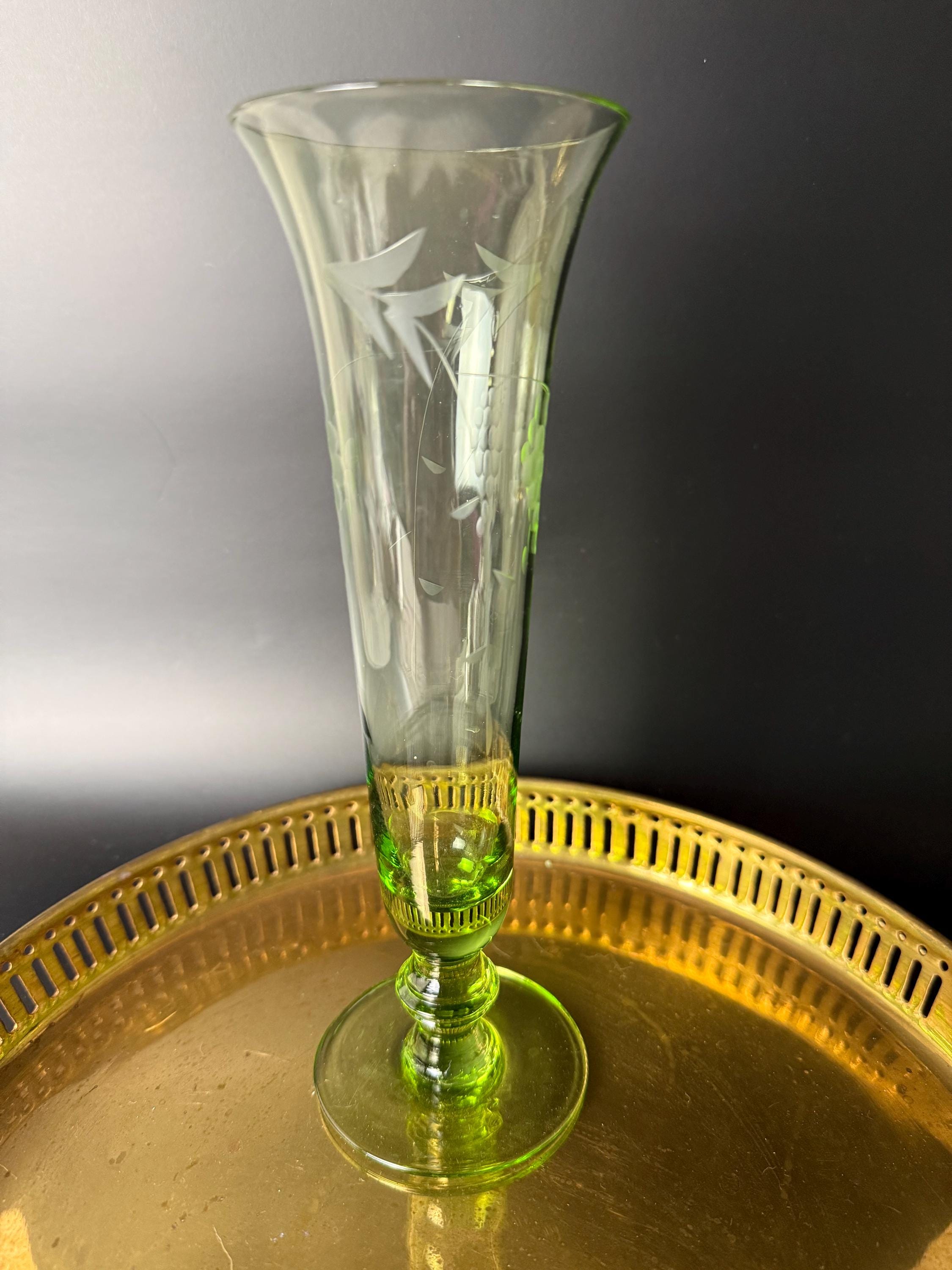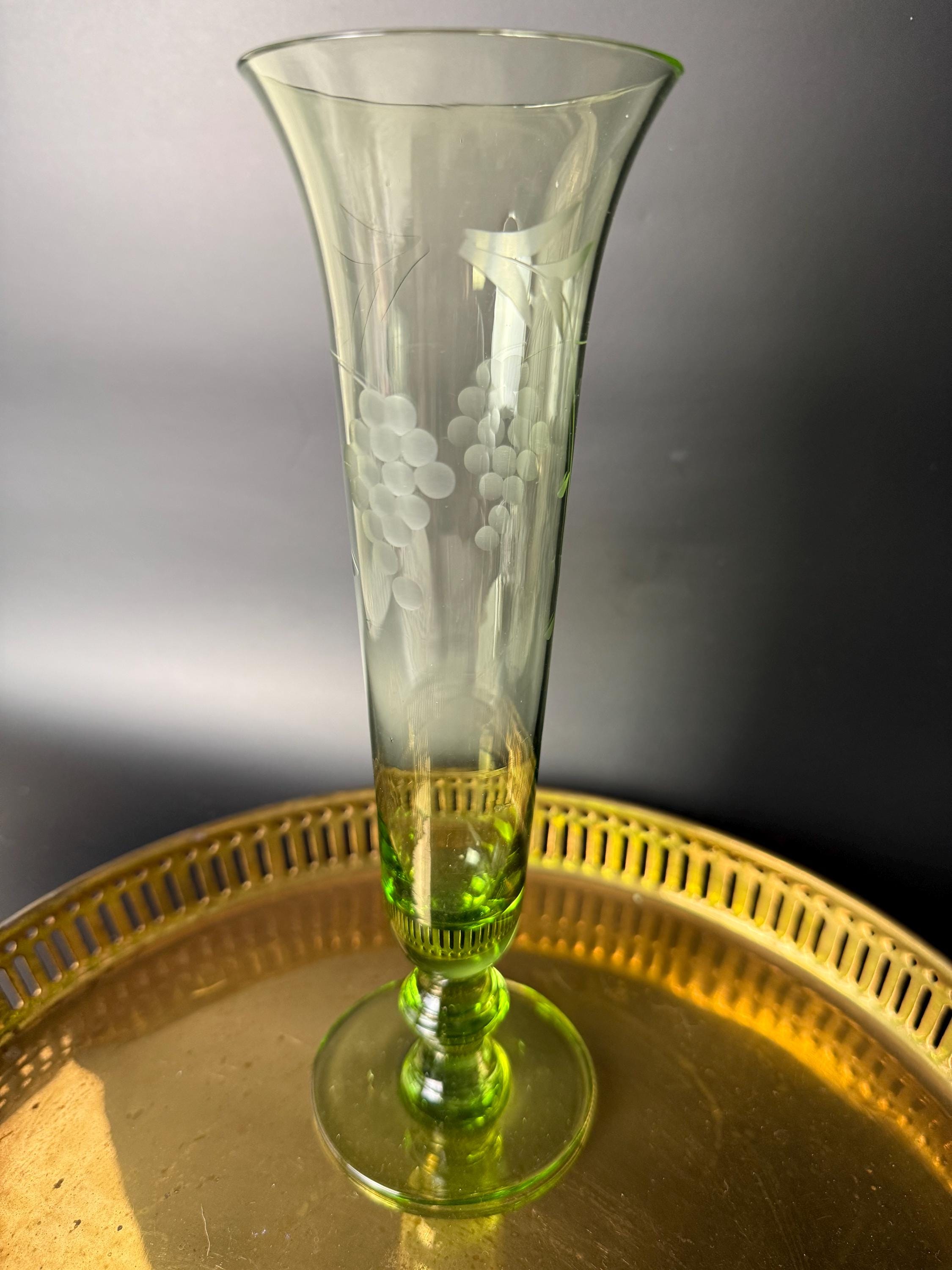 A sweet touch of vintage charm, this green glass bud vase features an etched grapevine motif and a slender flared shape. Perfect for showcasing a single flower or a petite bouquet, it’s a timeless piece that fits beautifully into both classic and modern spaces.