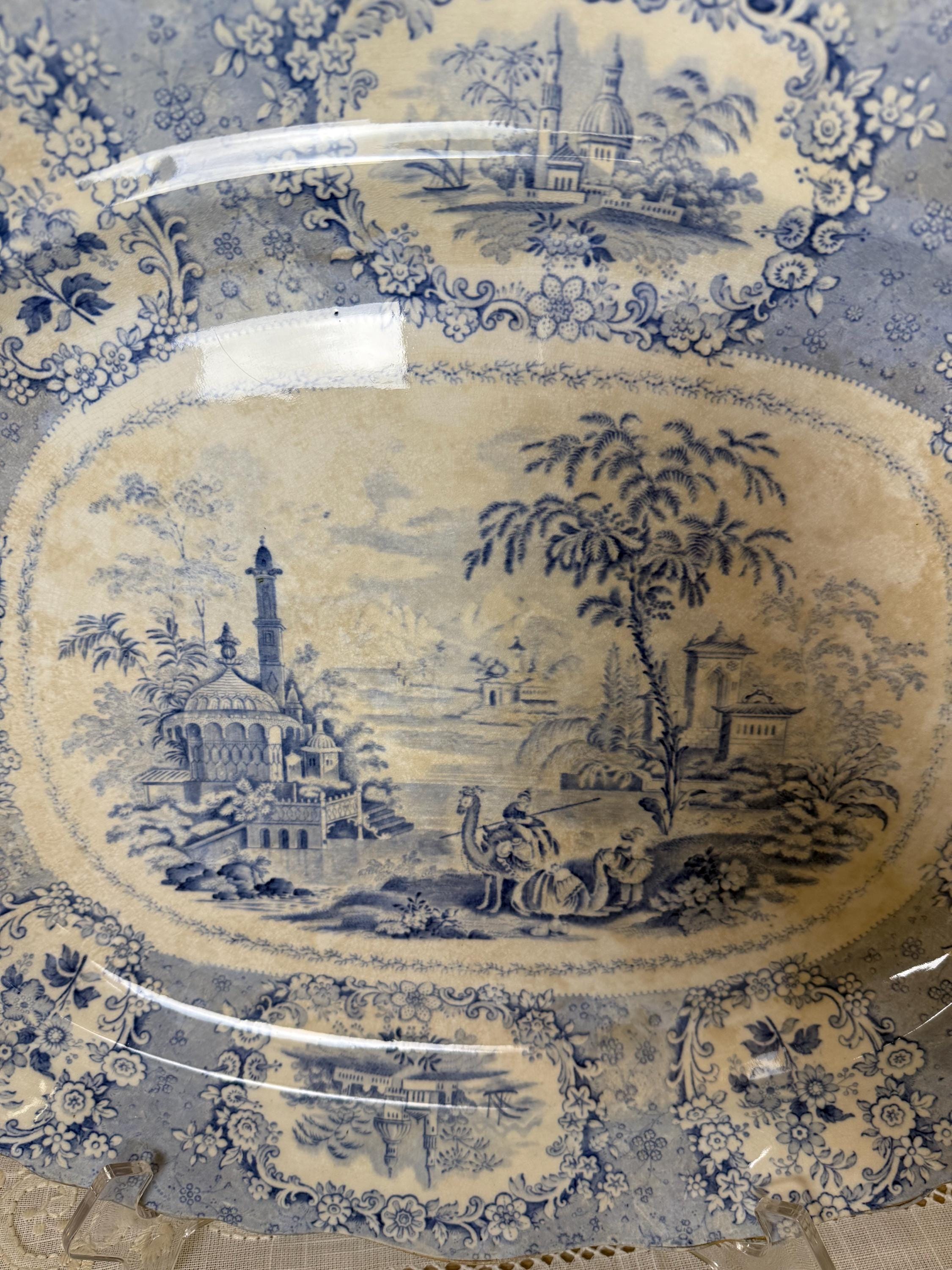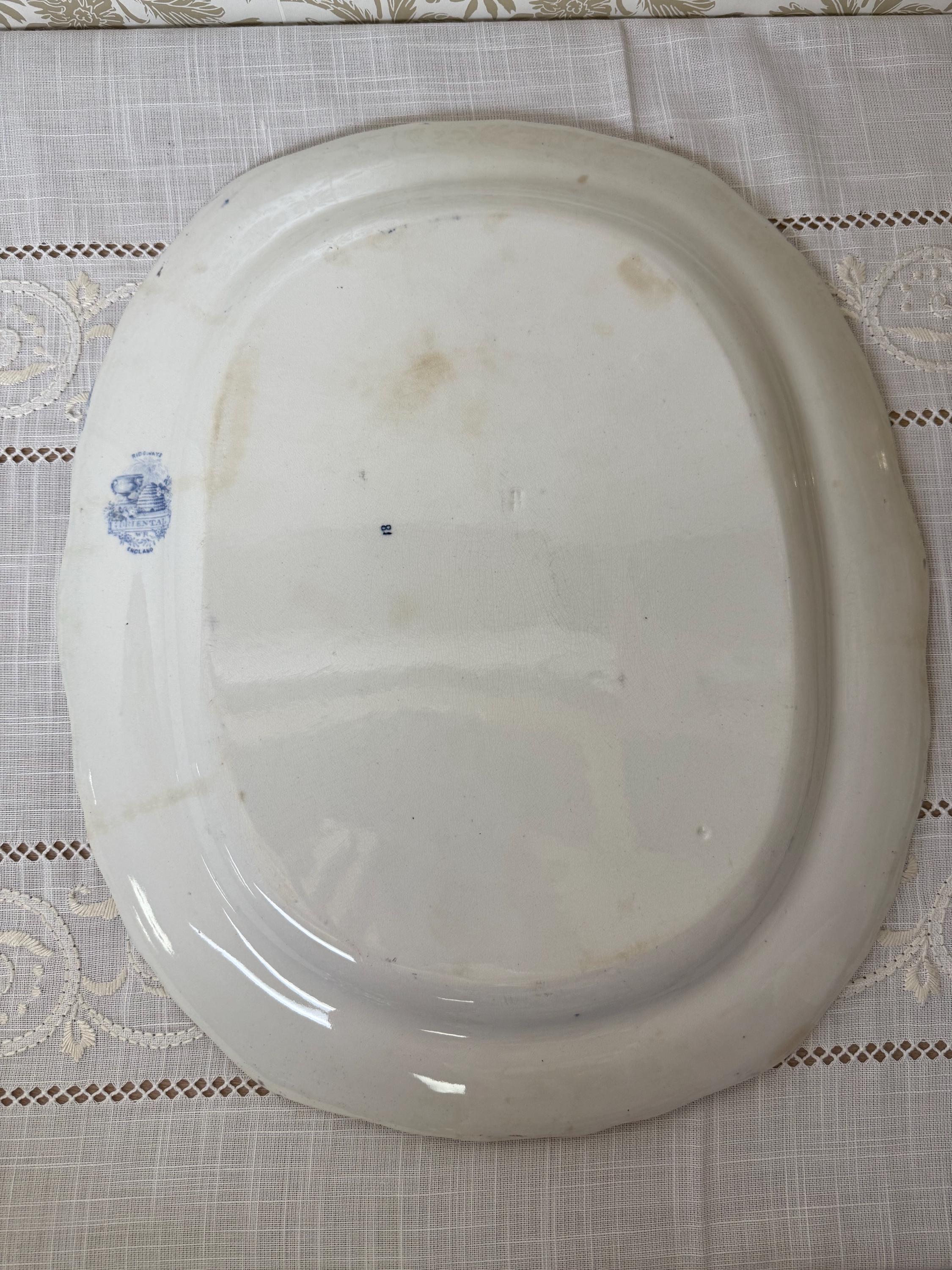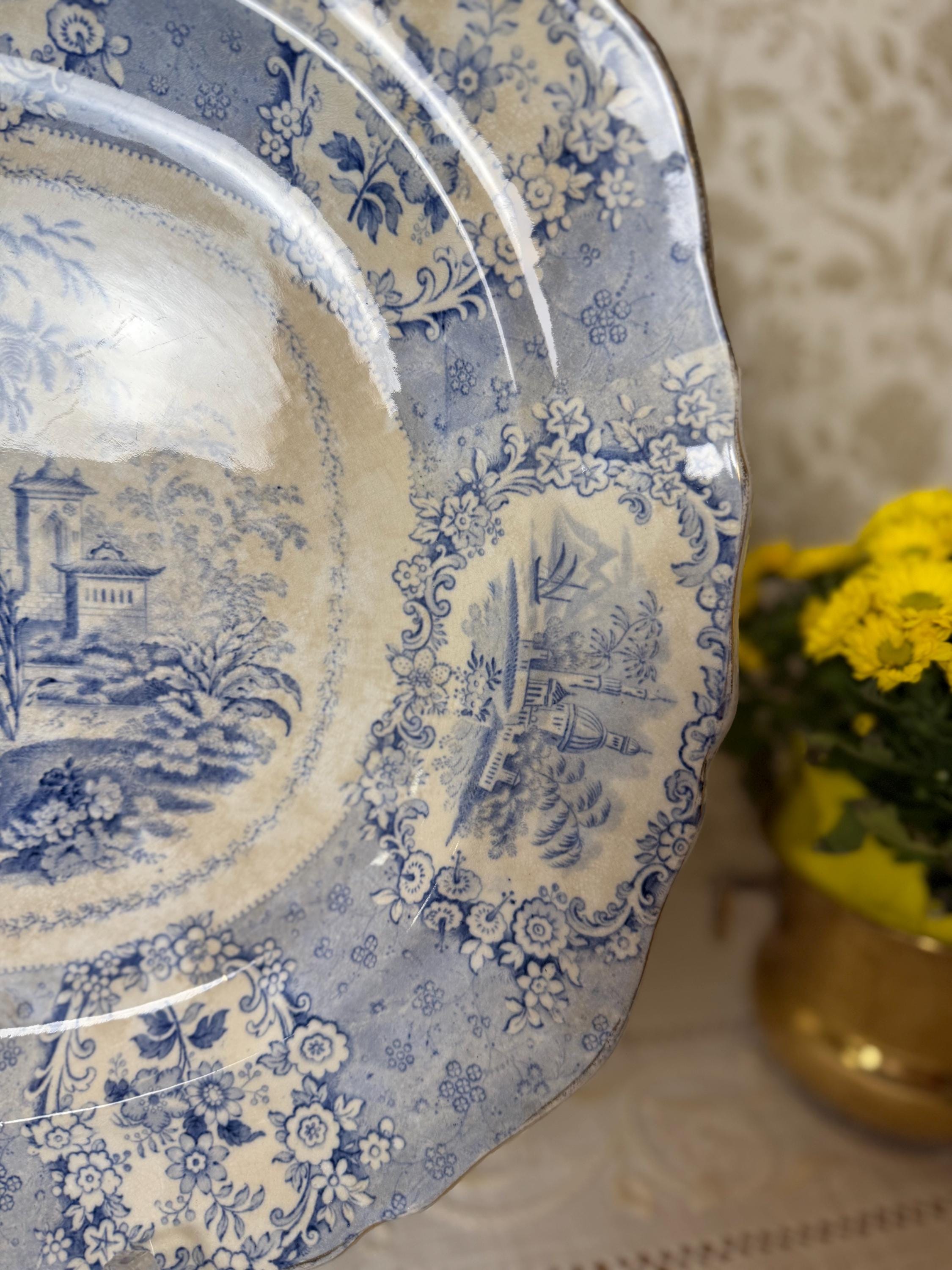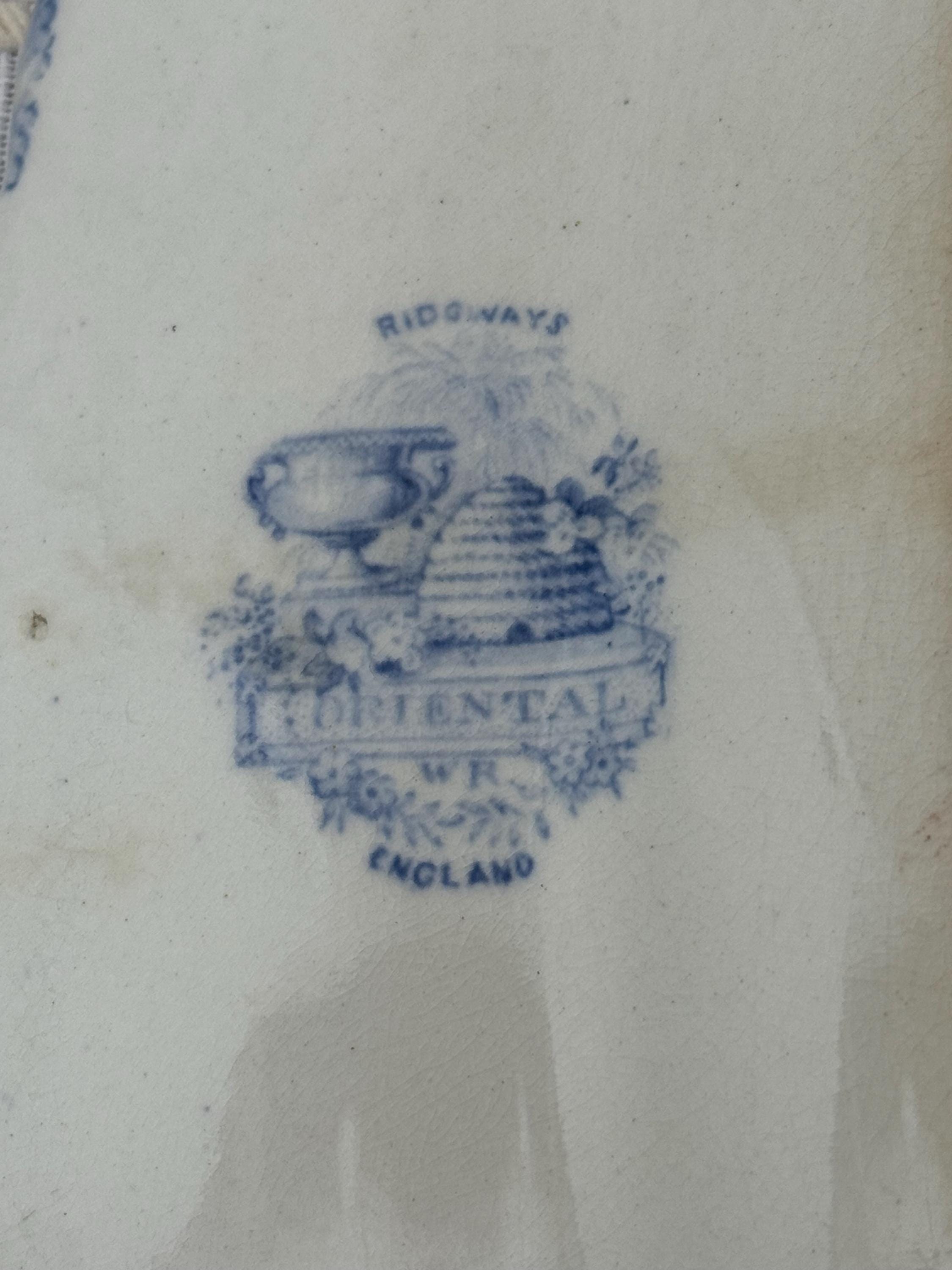 This magnificent extra-large platter showcases Ridgways’ beloved “Oriental” pattern in rich blue-and-white transferware. Measuring an impressive 19” by 16”, it features a sweeping pastoral scene framed with florals and architectural vignettes. The mark on the back — with “Ridgways” and the beehive emblem — dates this piece to the mid-to-late 19th century.