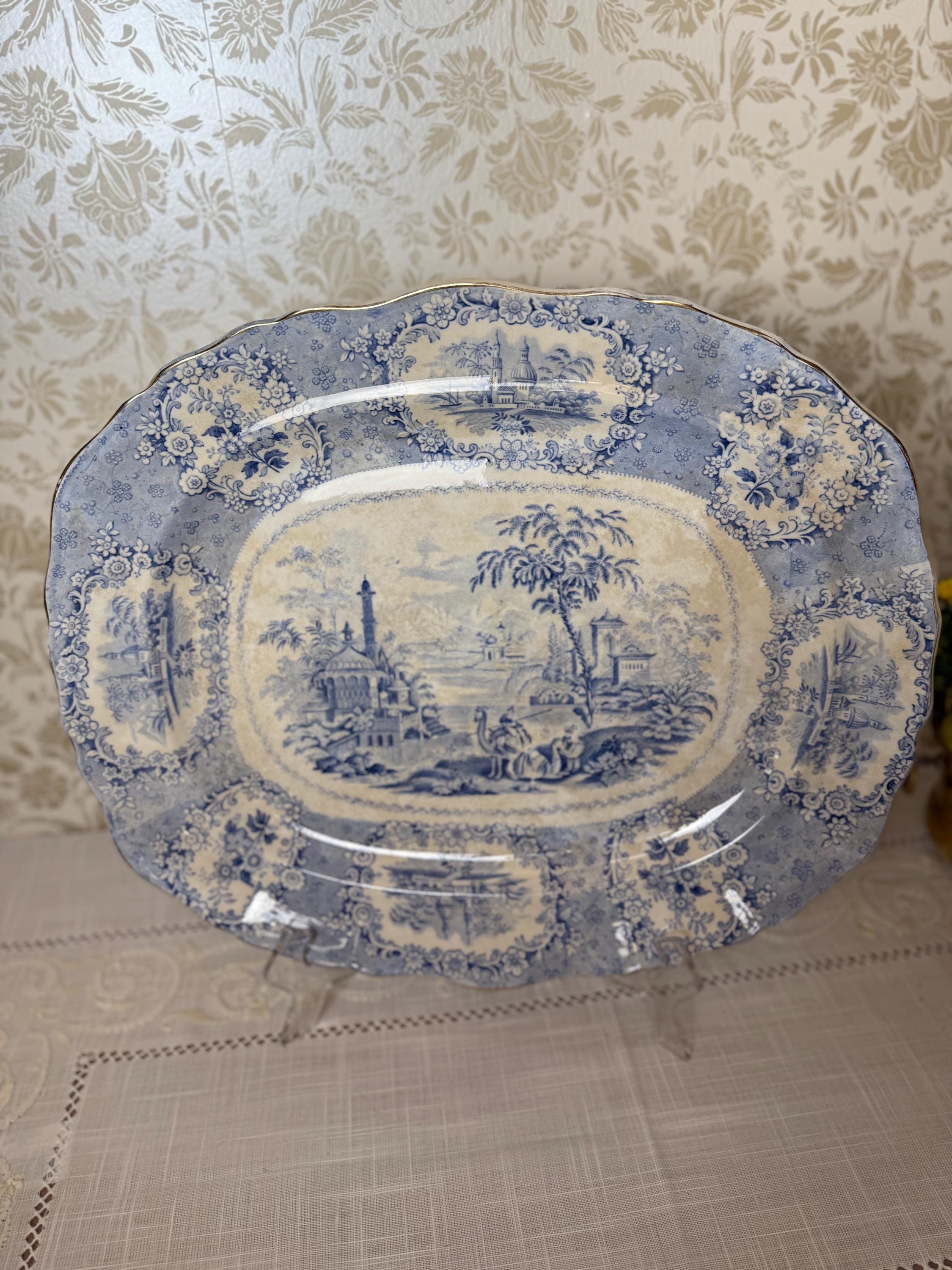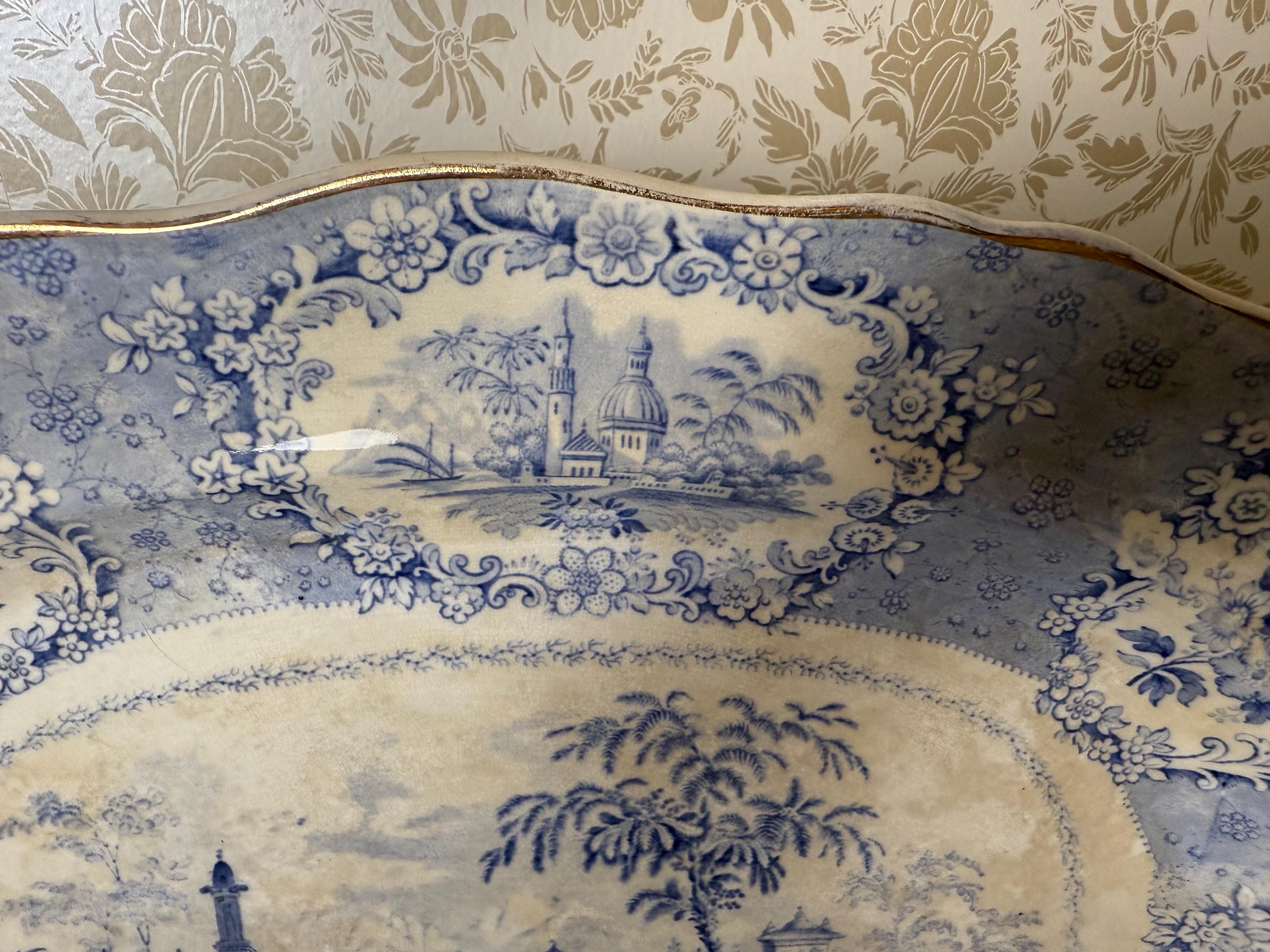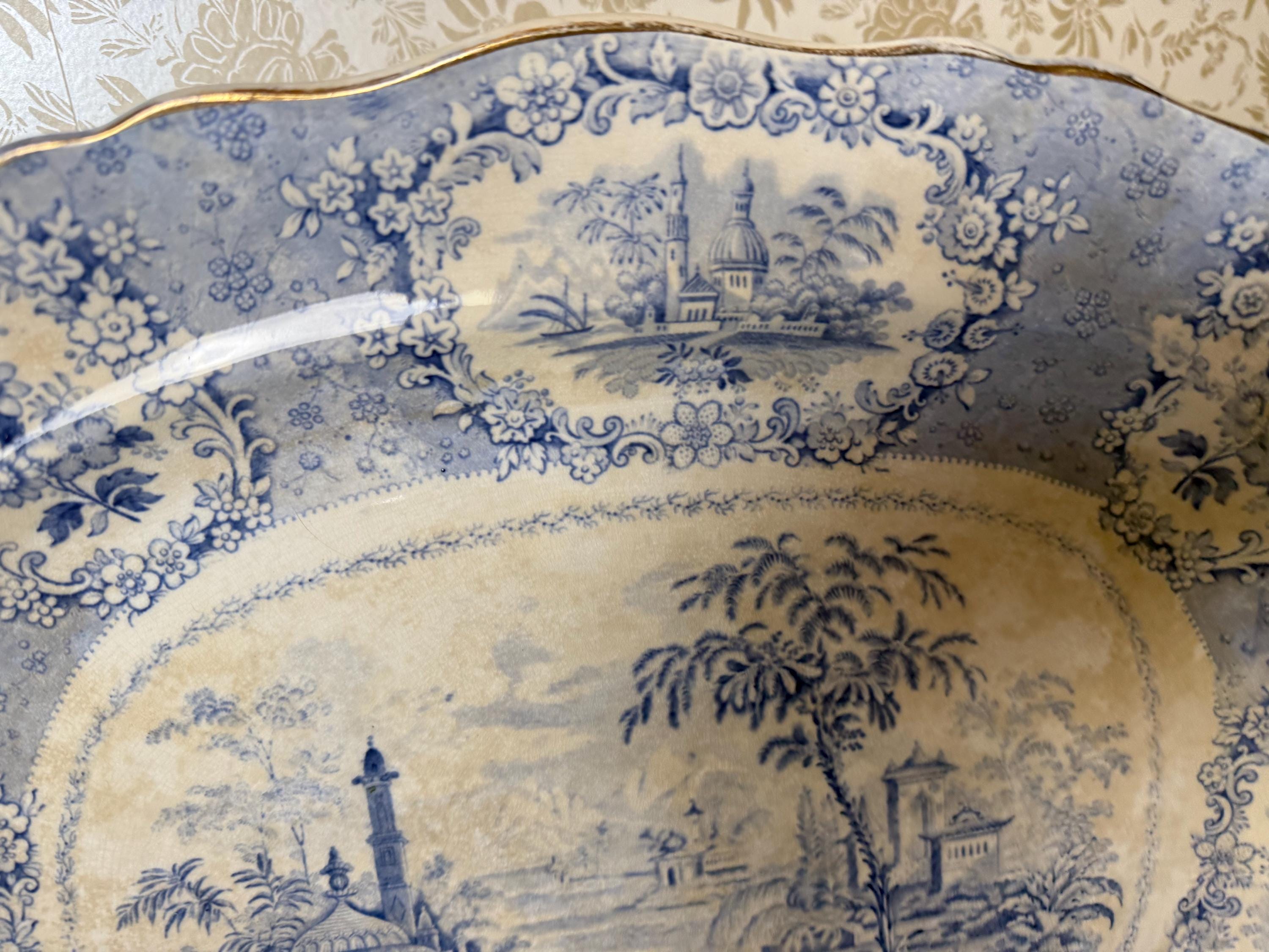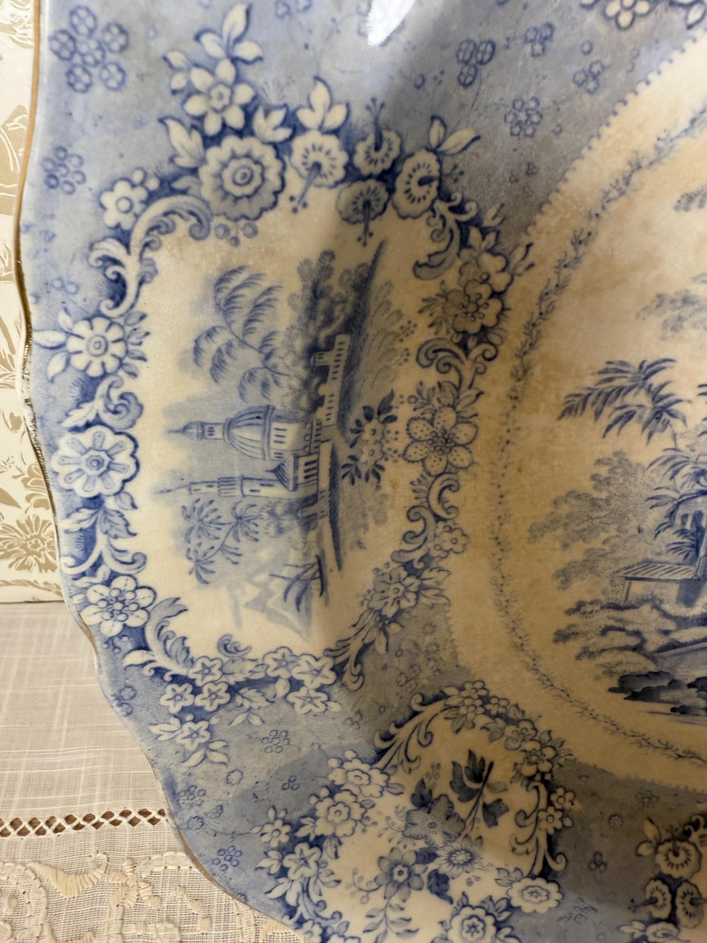 This magnificent extra-large platter showcases Ridgways’ beloved “Oriental” pattern in rich blue-and-white transferware. Measuring an impressive 19” by 16”, it features a sweeping pastoral scene framed with florals and architectural vignettes. The mark on the back — with “Ridgways” and the beehive emblem — dates this piece to the mid-to-late 19th century.
