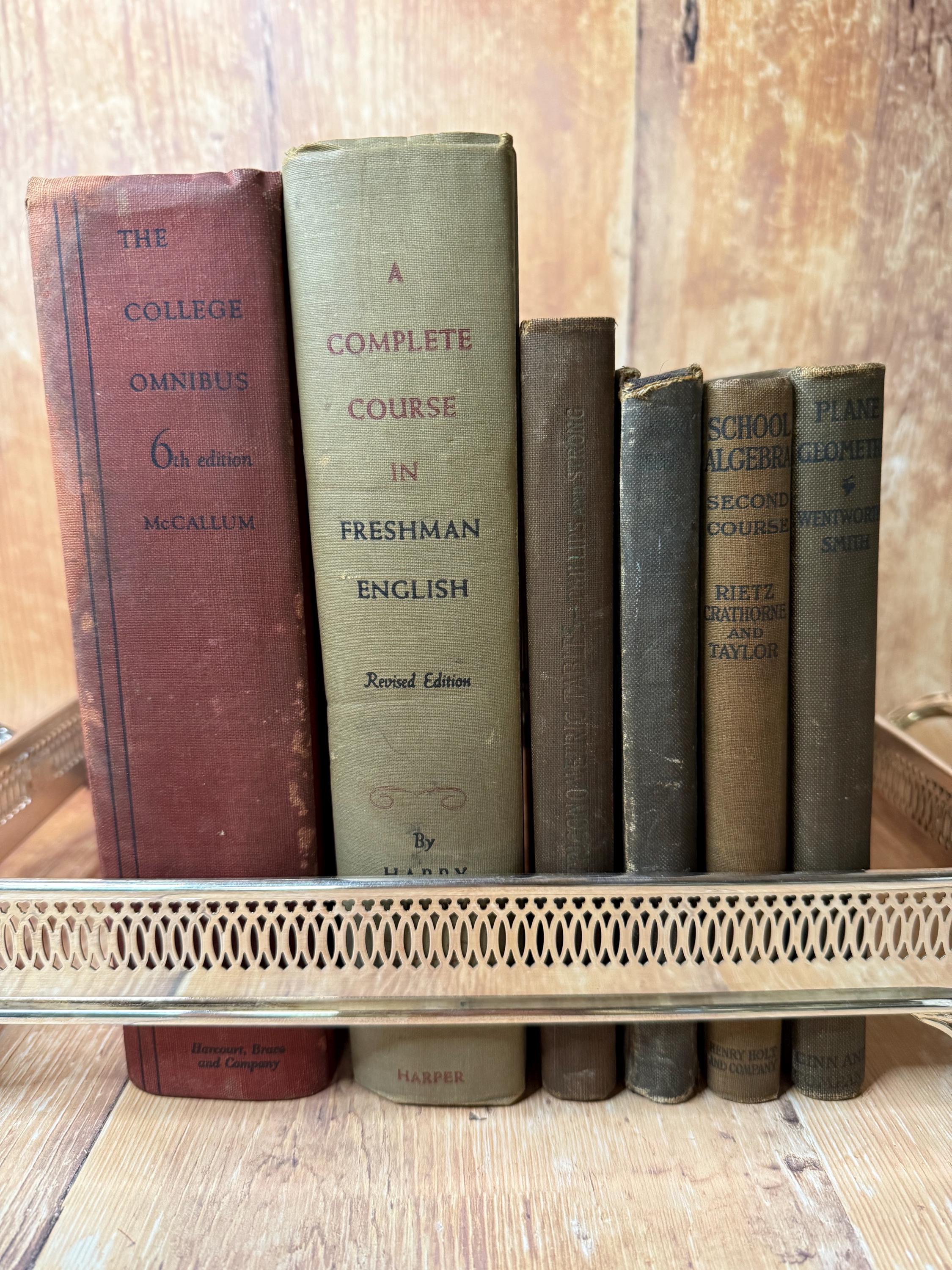 A curated lot of 6 vintage schoolbooks ranging from 1898 to 1947. Subjects include algebra, geometry, trigonometry/logarithmic tables, freshman English, and classic college reading.