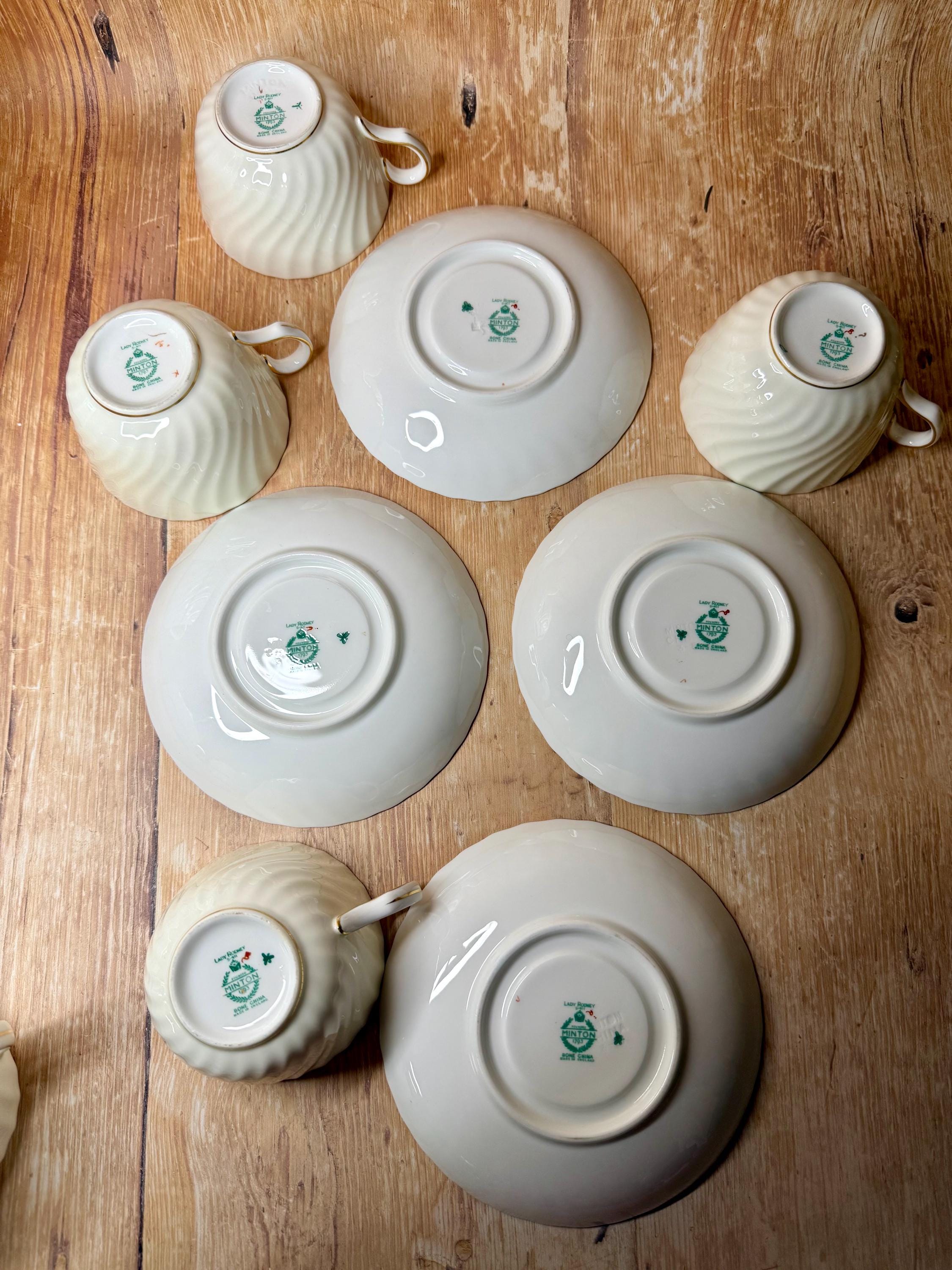 Founded in 1793, Minton was one of Britain’s premier pottery houses, famed for innovation and artistry. The “Lady Rodney” pattern reflects mid-century refinement — balancing traditional floral motifs with modern elegance. Complete tea sets are especially sought after by collectors for both their rarity and beauty.