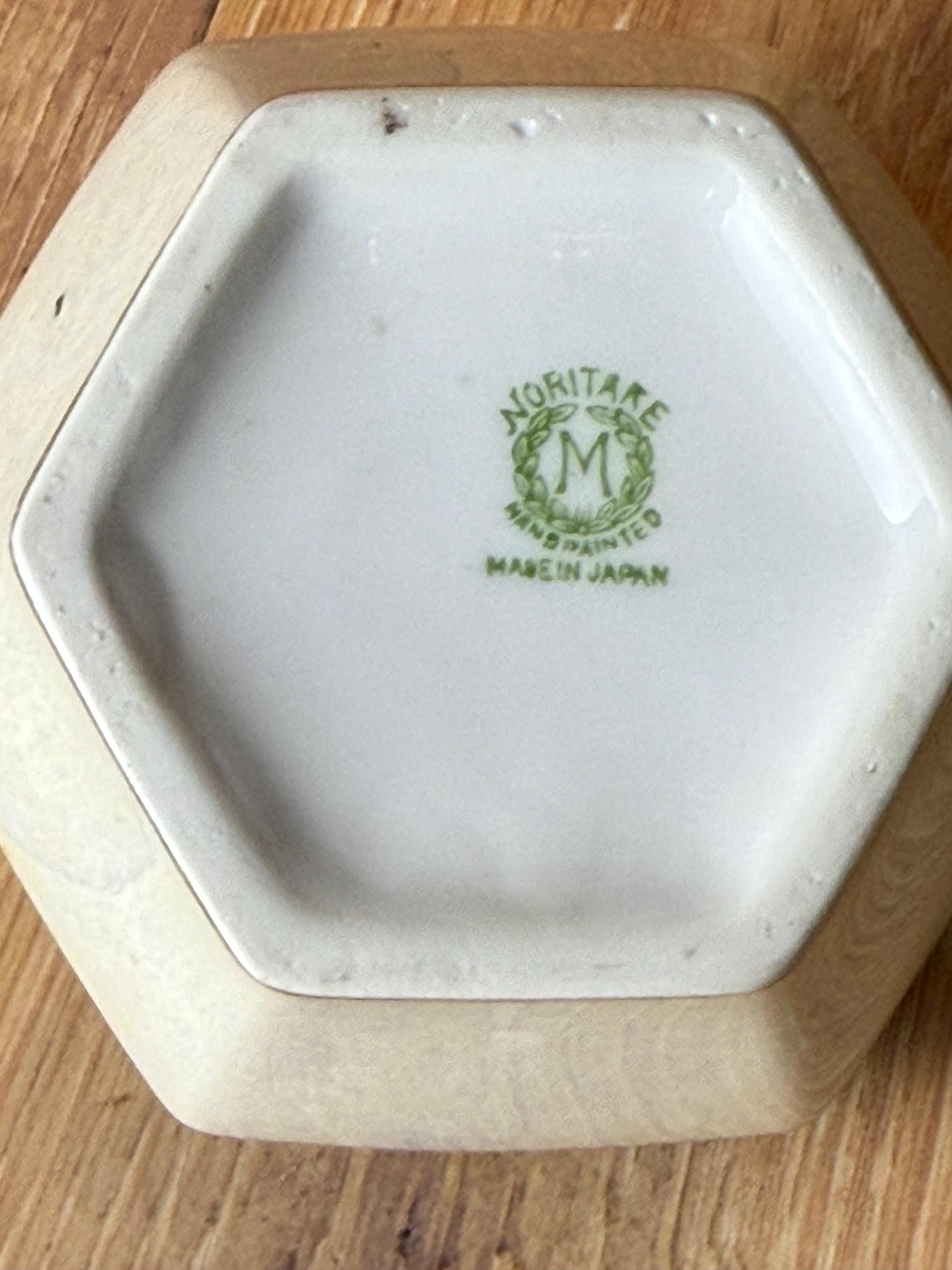 This exquisite Noritake creamer and sugar set captures the artistry and innovation of the Art Deco era. Each piece is hand-painted with cobalt blue and warm peach luster, accented with geometric panels and fine gold trim. The luminous glaze—known as lusterware—creates a soft, iridescent sheen that shifts beautifully in the light. Elegant, refined, and full of vintage glamour, this set is a standout example of Noritake’s craftsmanship from the early 20th century.