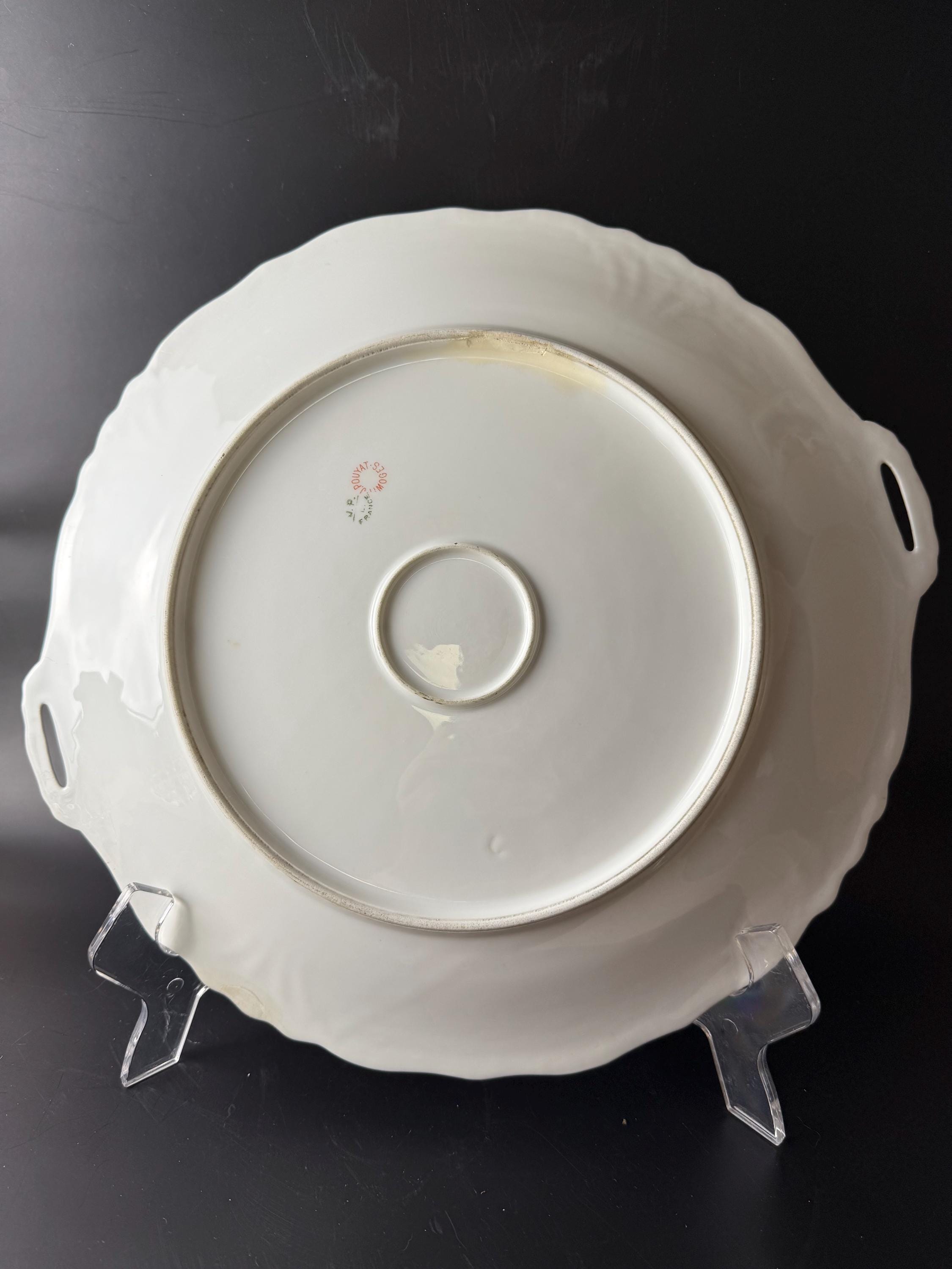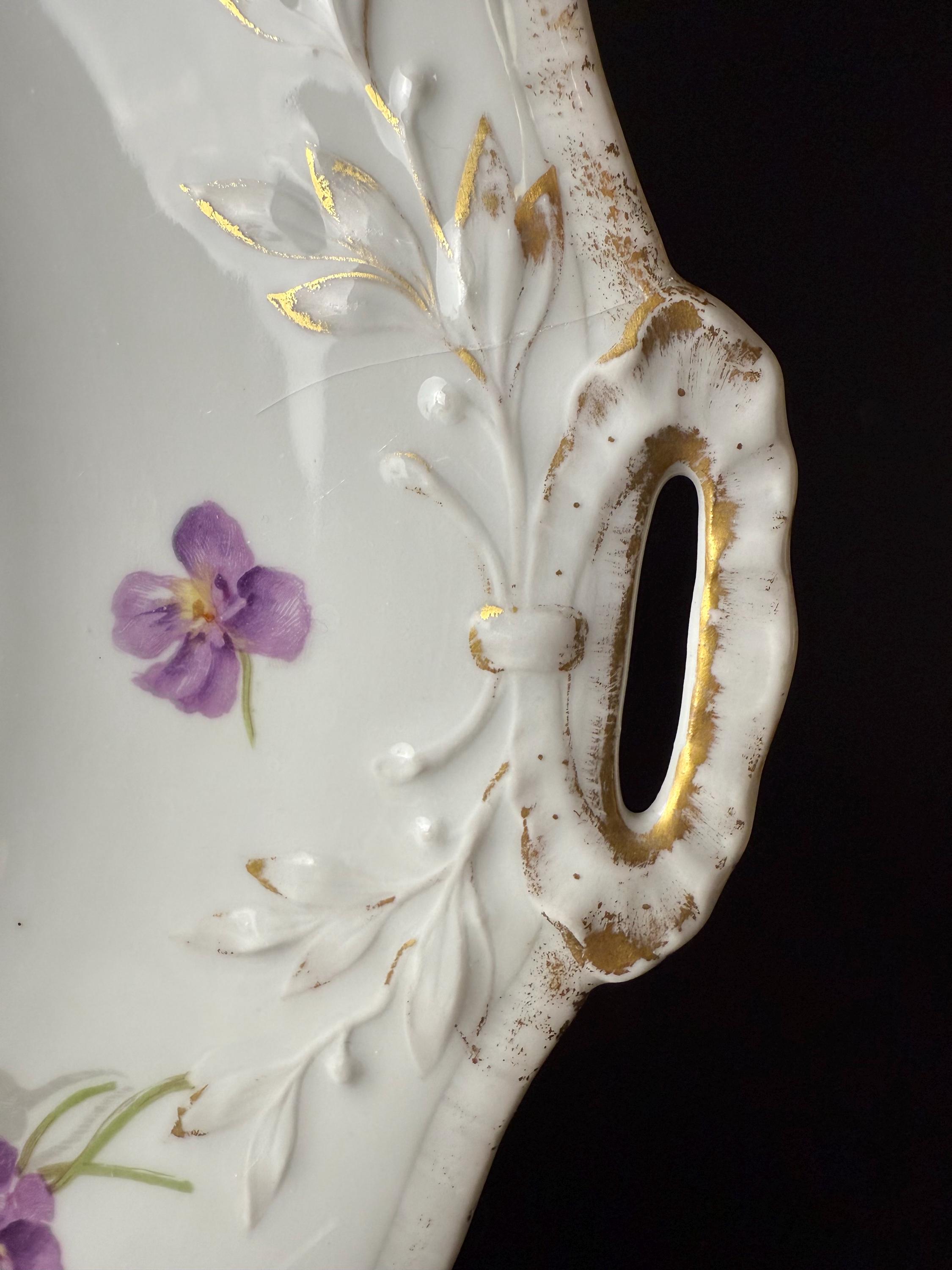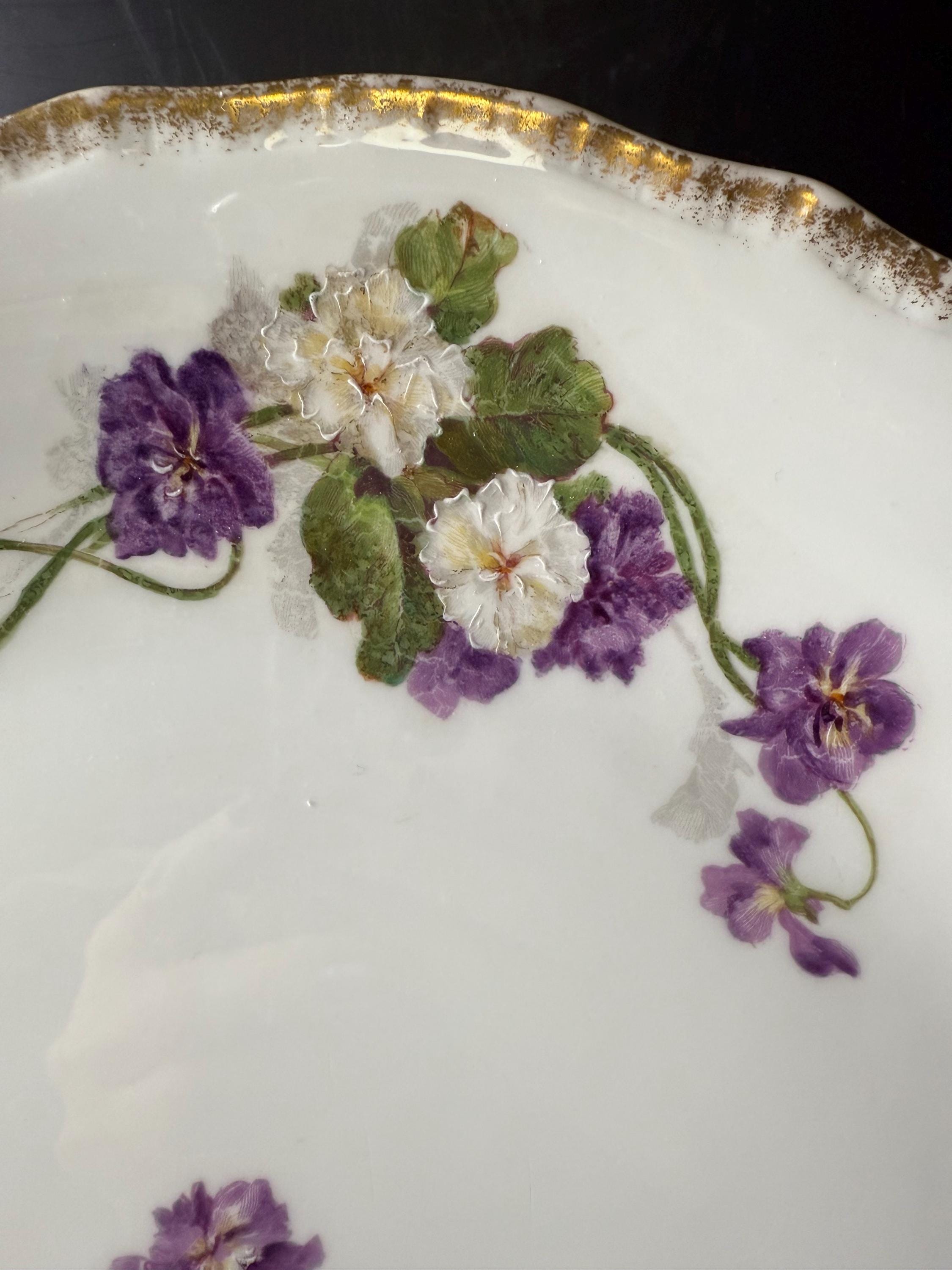 Bring a touch of French elegance to your home with this stunning antique platter from J.P. Limoges, France. Hand-painted with clusters of delicate violets and soft white blossoms, the artistry is highlighted by gilded flourishes and a scalloped, embossed rim. The craftsmanship, graceful handles, and romantic floral design make this a true heirloom piece — perfect for collectors or those who love timeless European beauty.