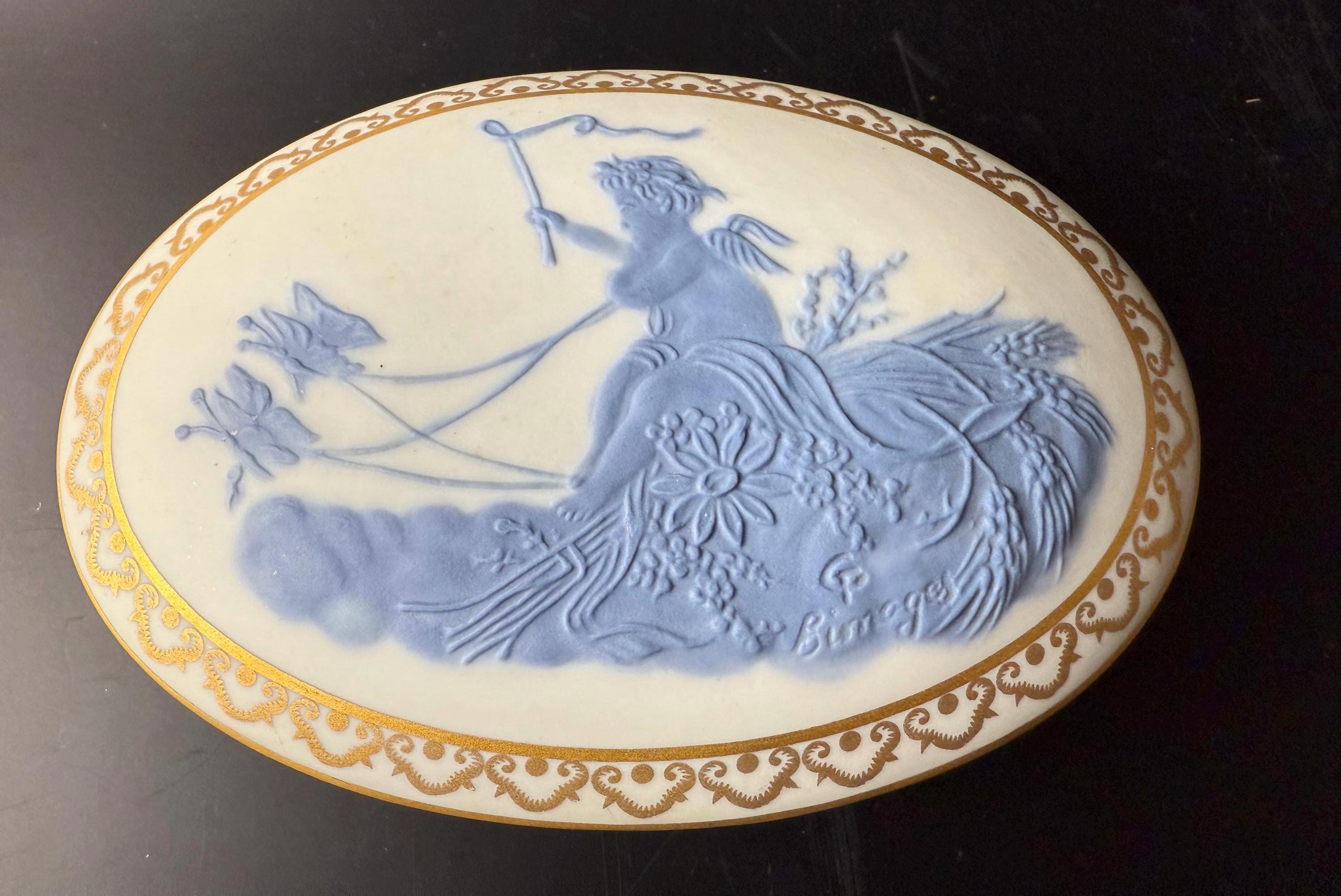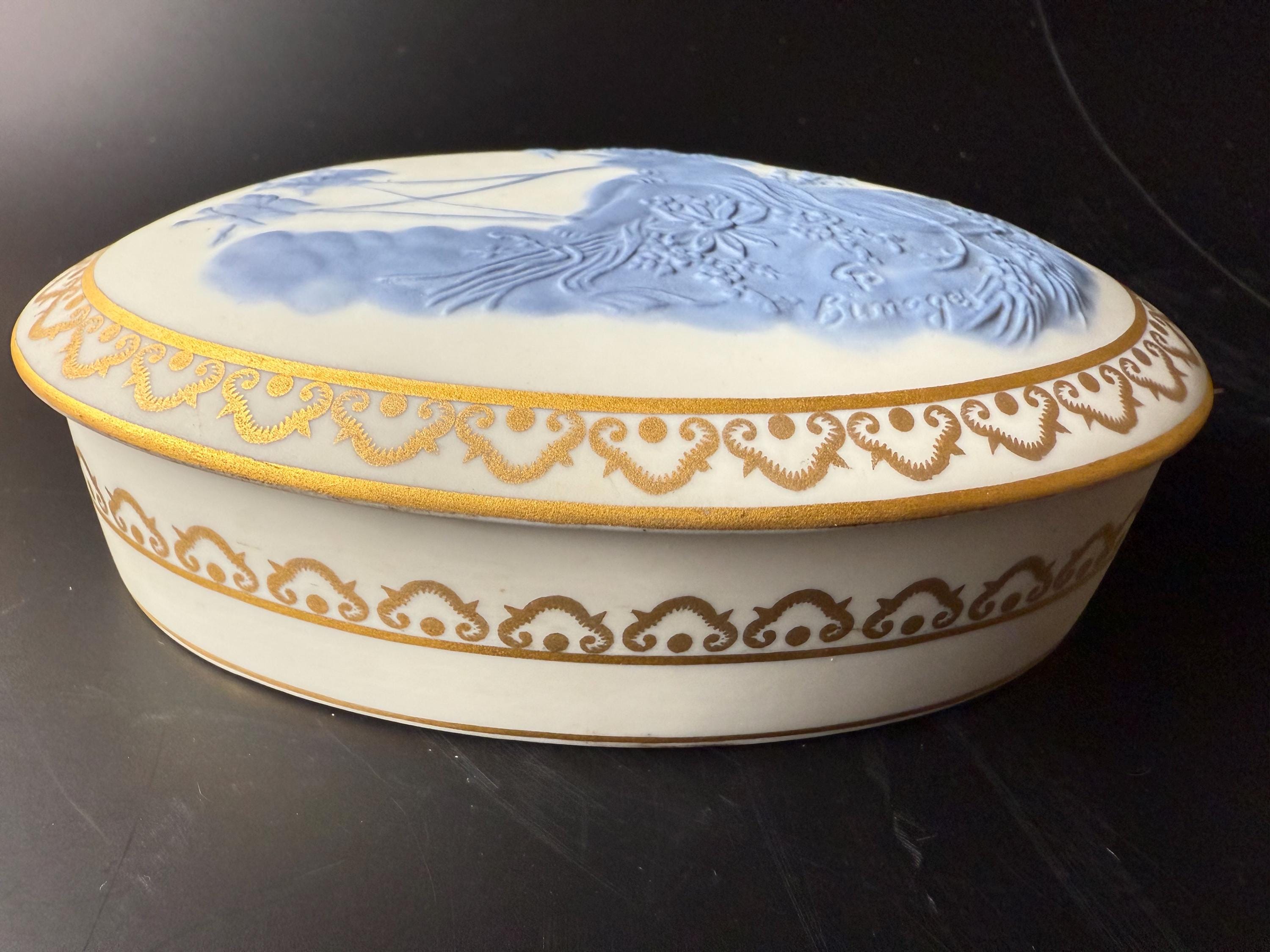 This exquisite Limoges porcelain box by T. Haraud captures the elegance and artistry that made Limoges world-renowned. The lid features a delicate raised blue cameo relief of a classical woman among flowers, framed by a hand-applied matte gold scroll border. The creamy white porcelain base is encircled with matching gold decoration, completing the refined neoclassical look.