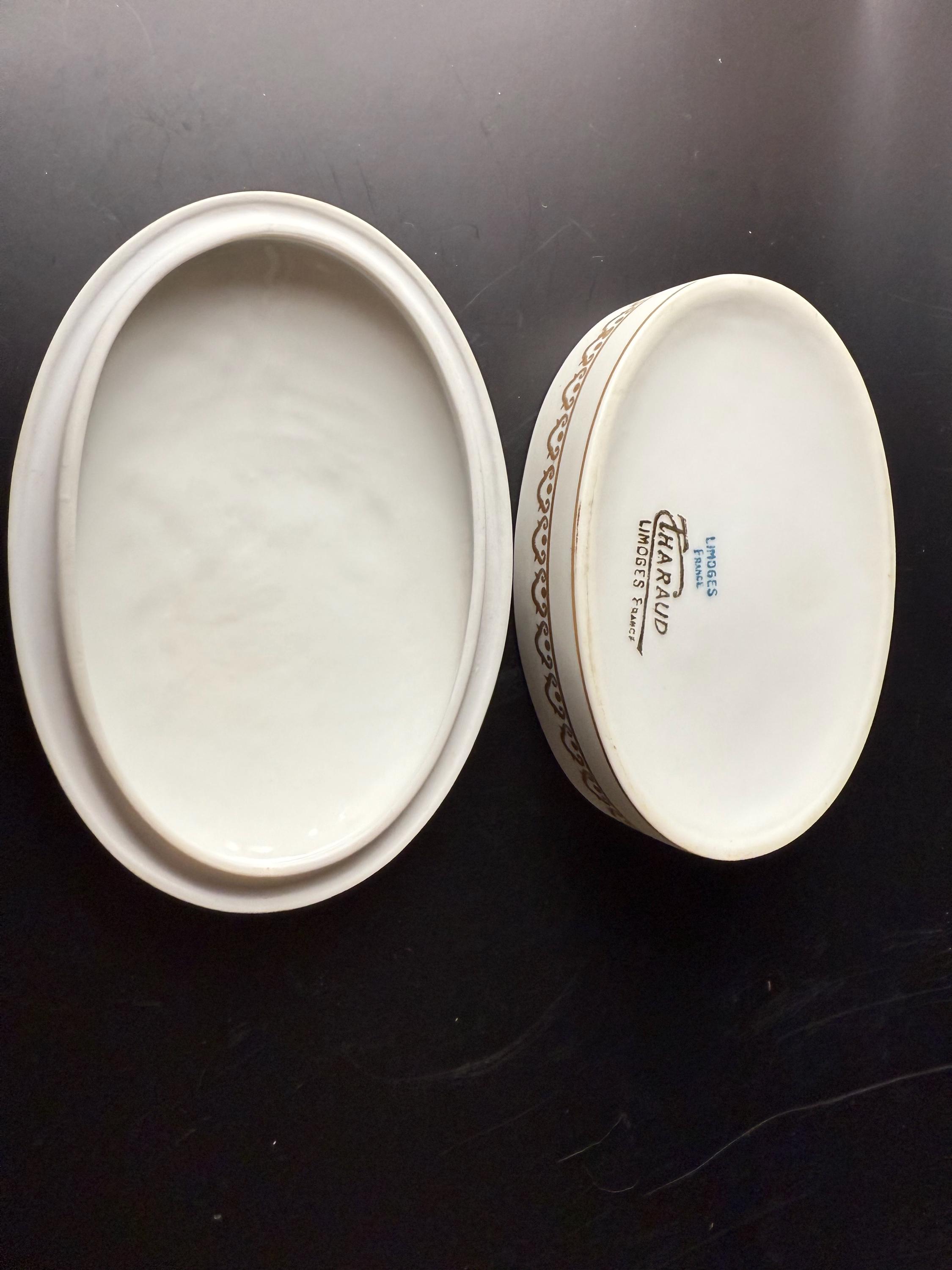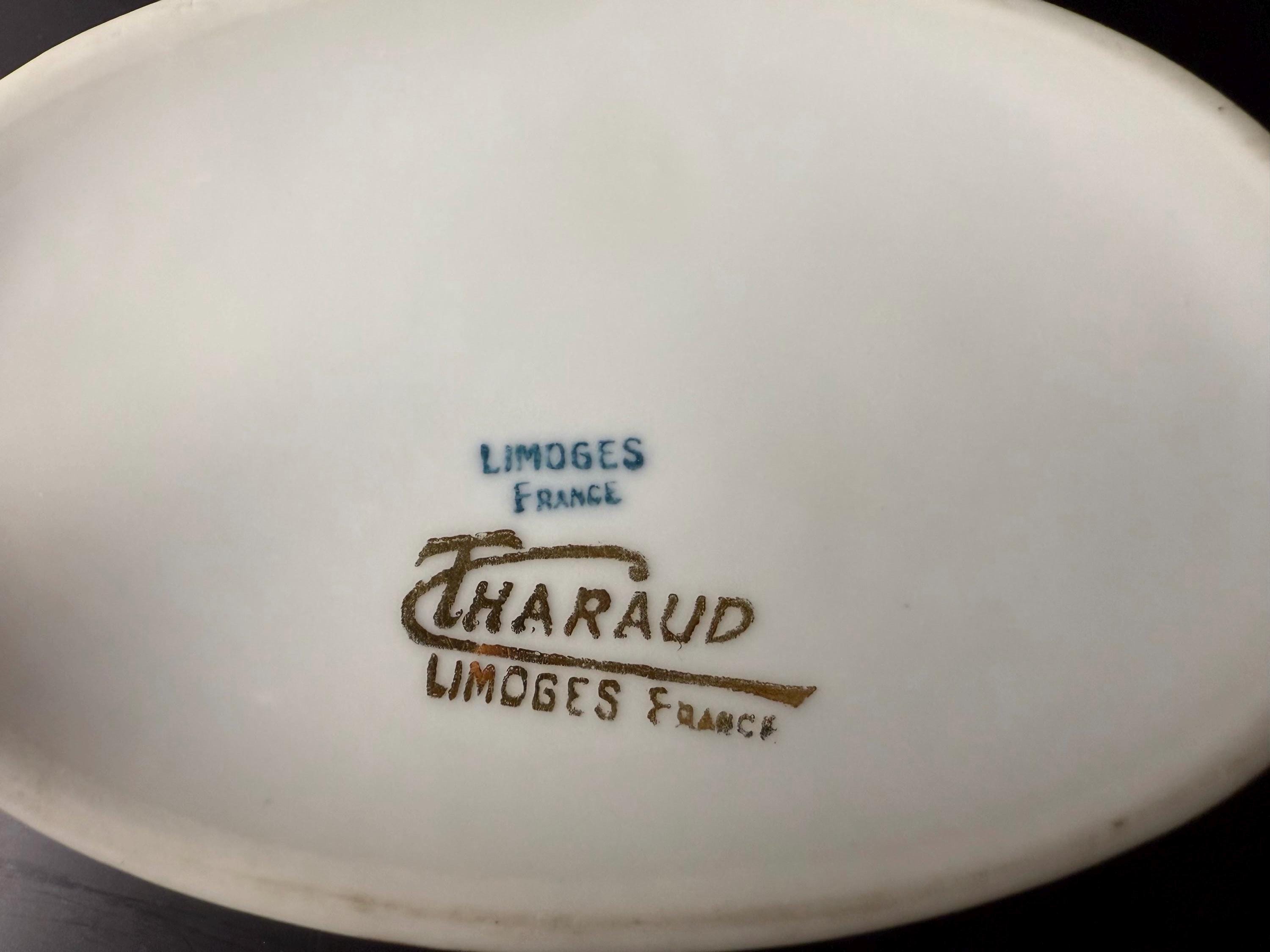 Each Limoges piece was individually crafted and decorated in France, renowned for its purity of porcelain and refined artistry. T. Haraud was among the respected Limoges studios producing fine porcelain in the early to mid-1900s, known for sophisticated gilding and cameo-style reliefs.