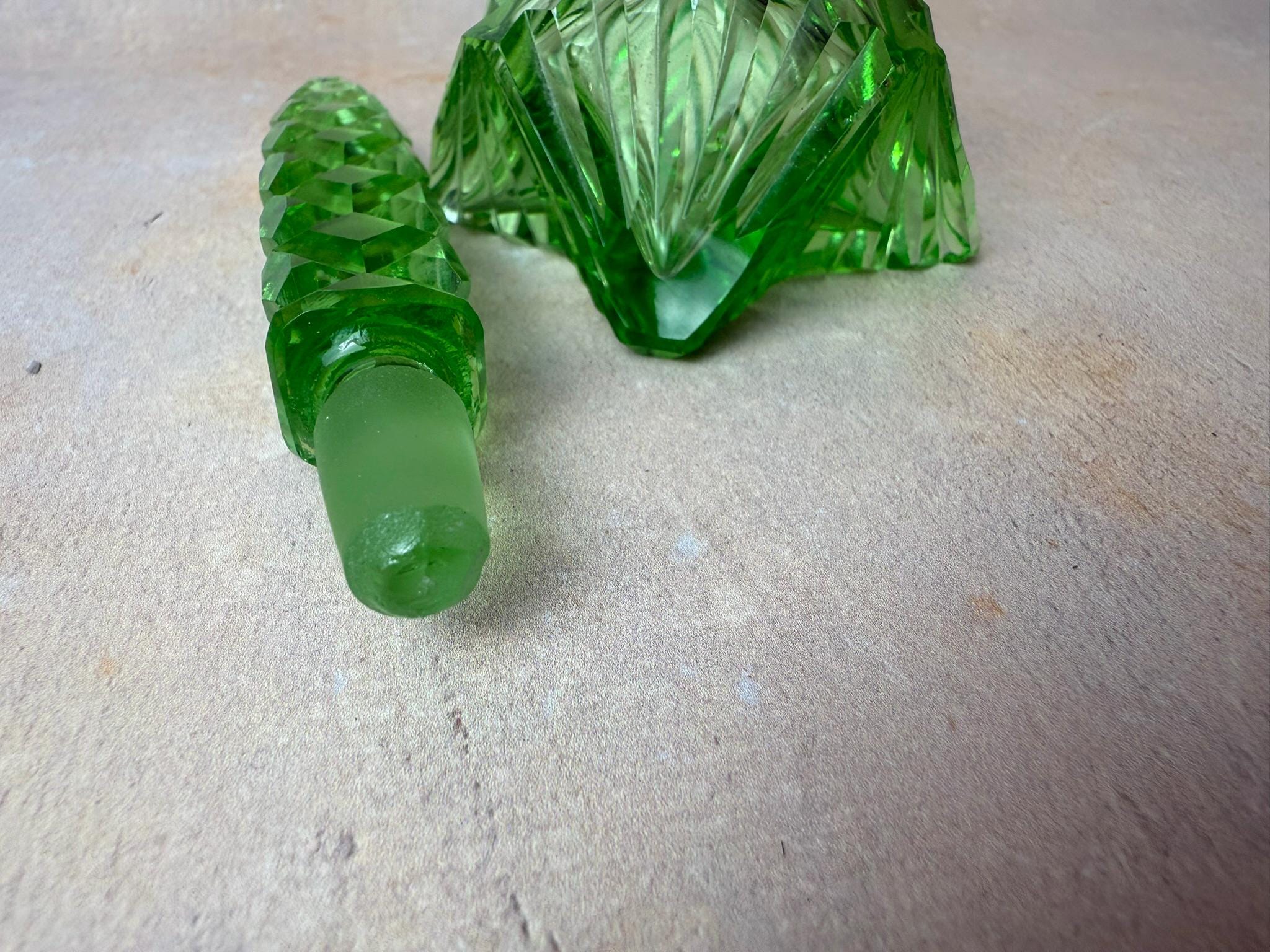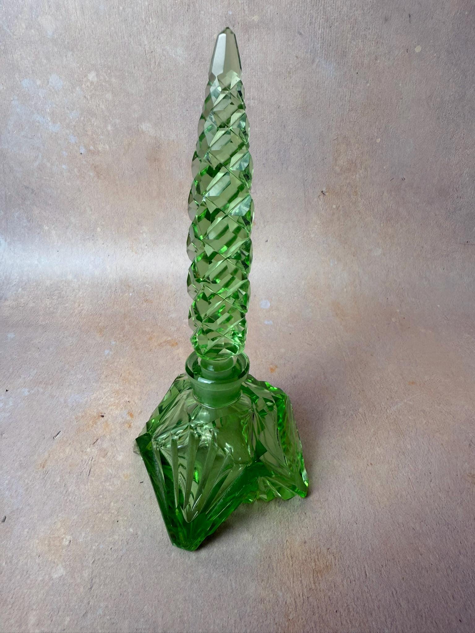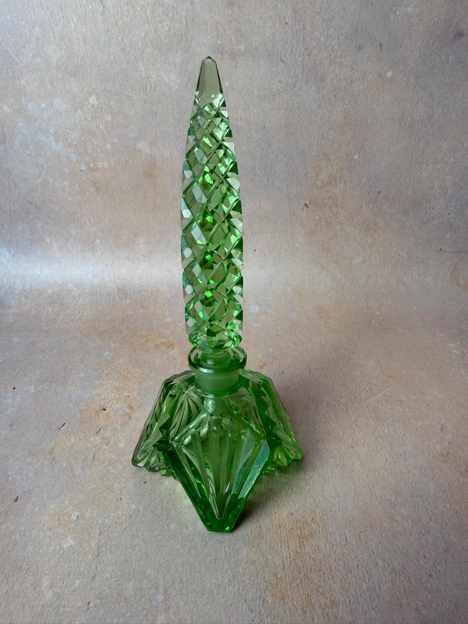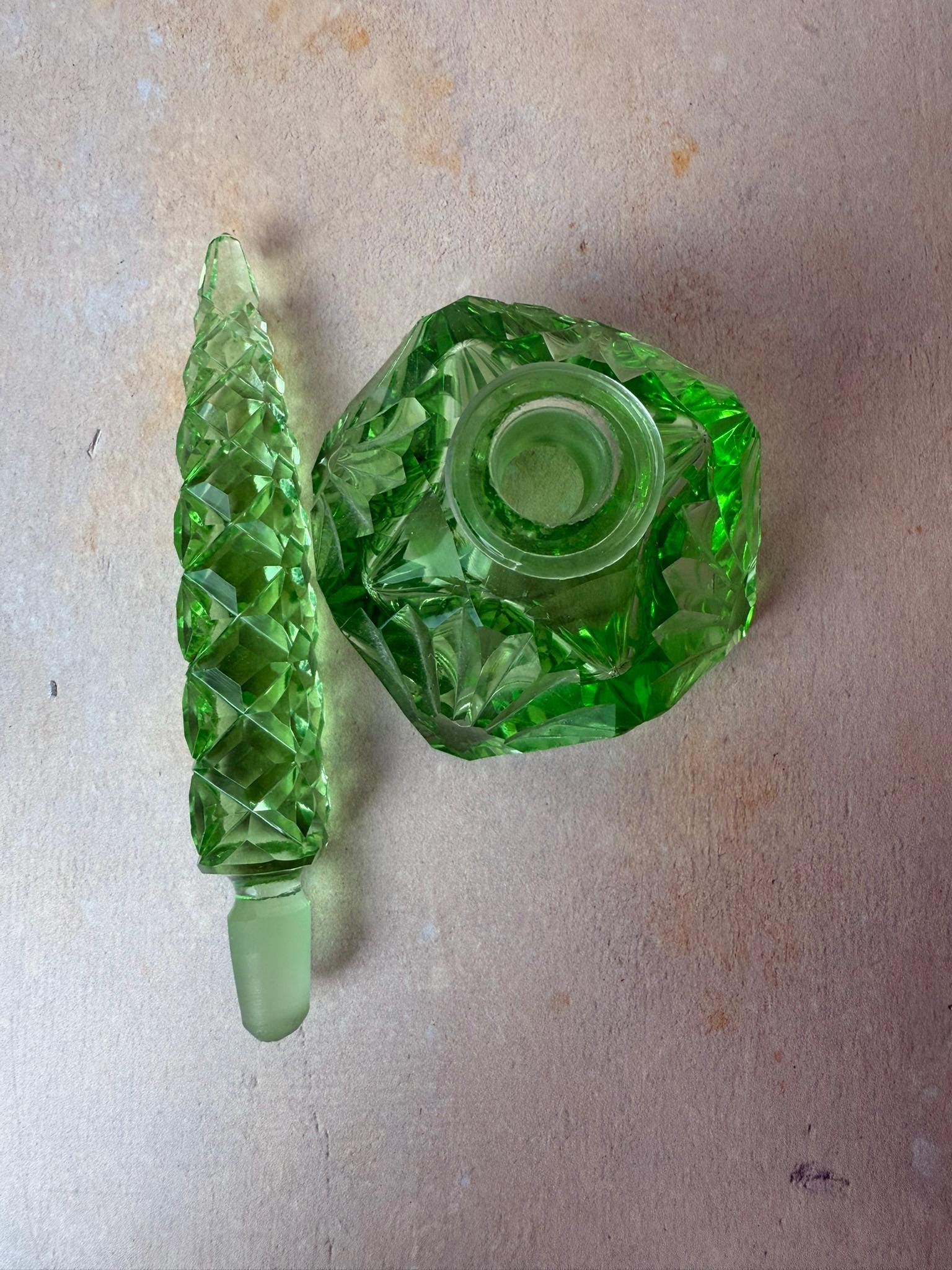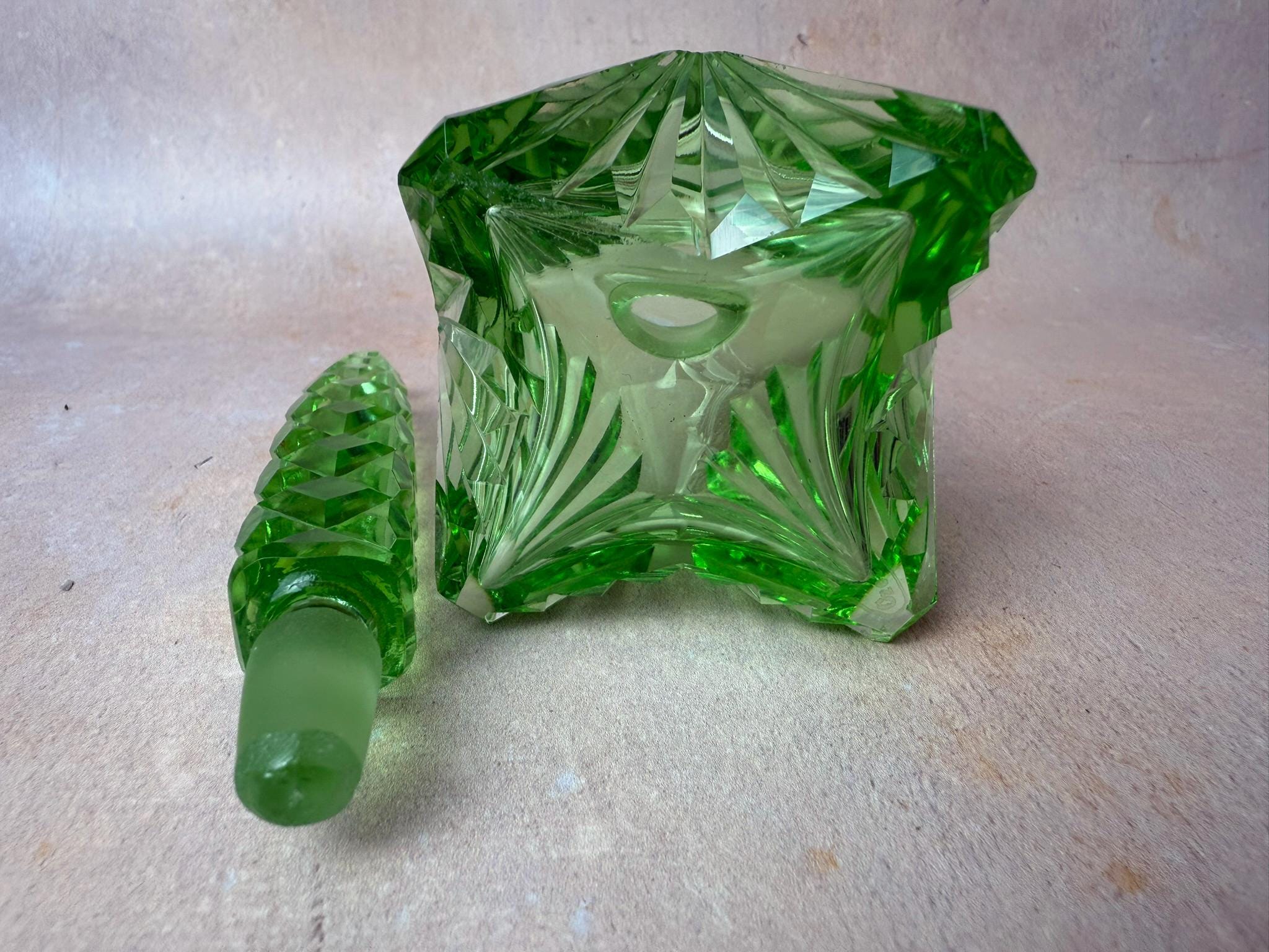 This exquisite Art Deco perfume bottle was hand-cut in Czechoslovakia during the 1920s–1930s and bears the etched “Made in Czechoslovakia” mark on the base. Crafted from glowing uranium glass, it features a bold geometric form with deeply faceted sides and a tall prism-cut stopper that catches and reflects light beautifully.