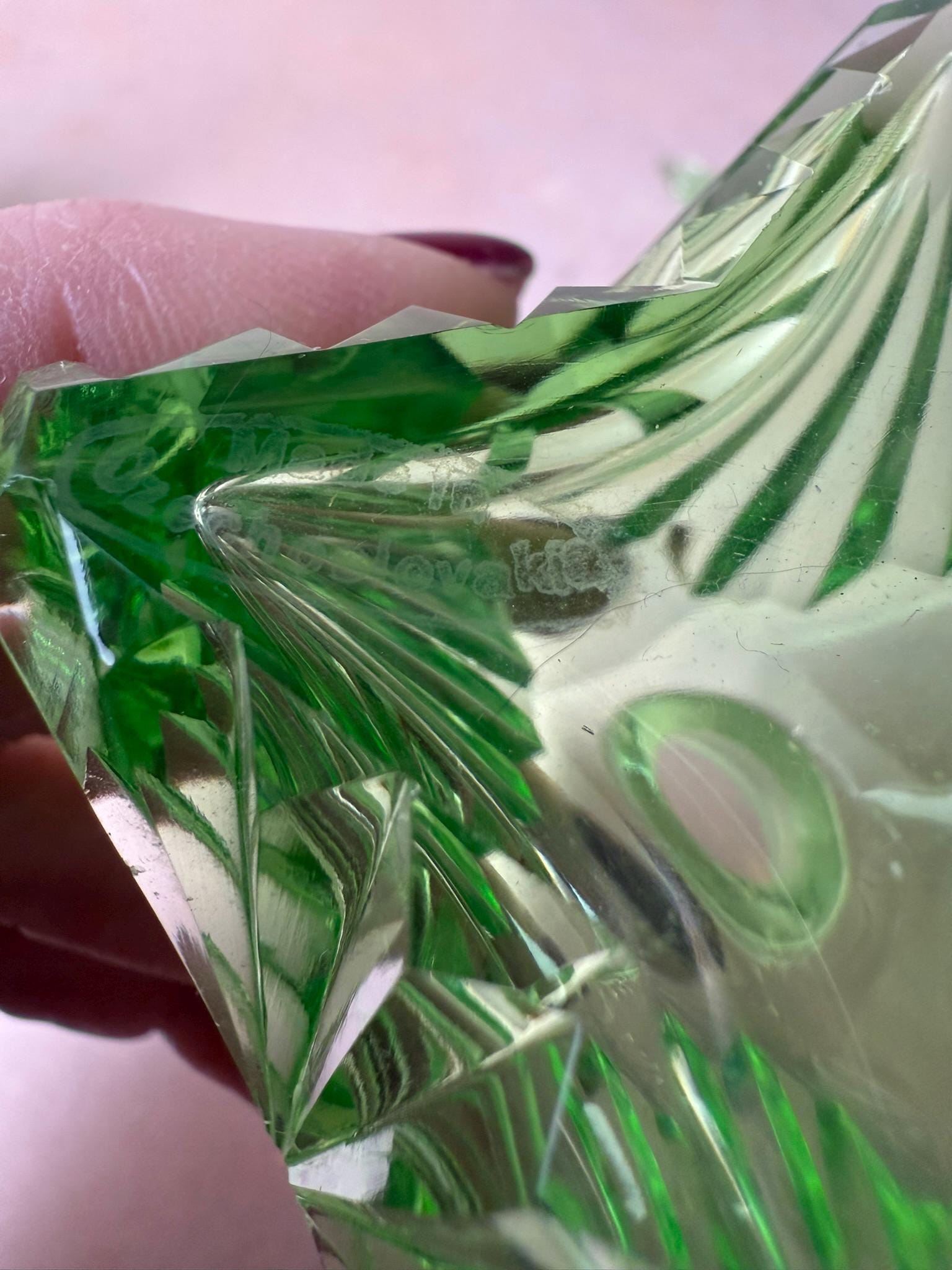 Material: Hand-cut uranium glass (glows bright green under UV)