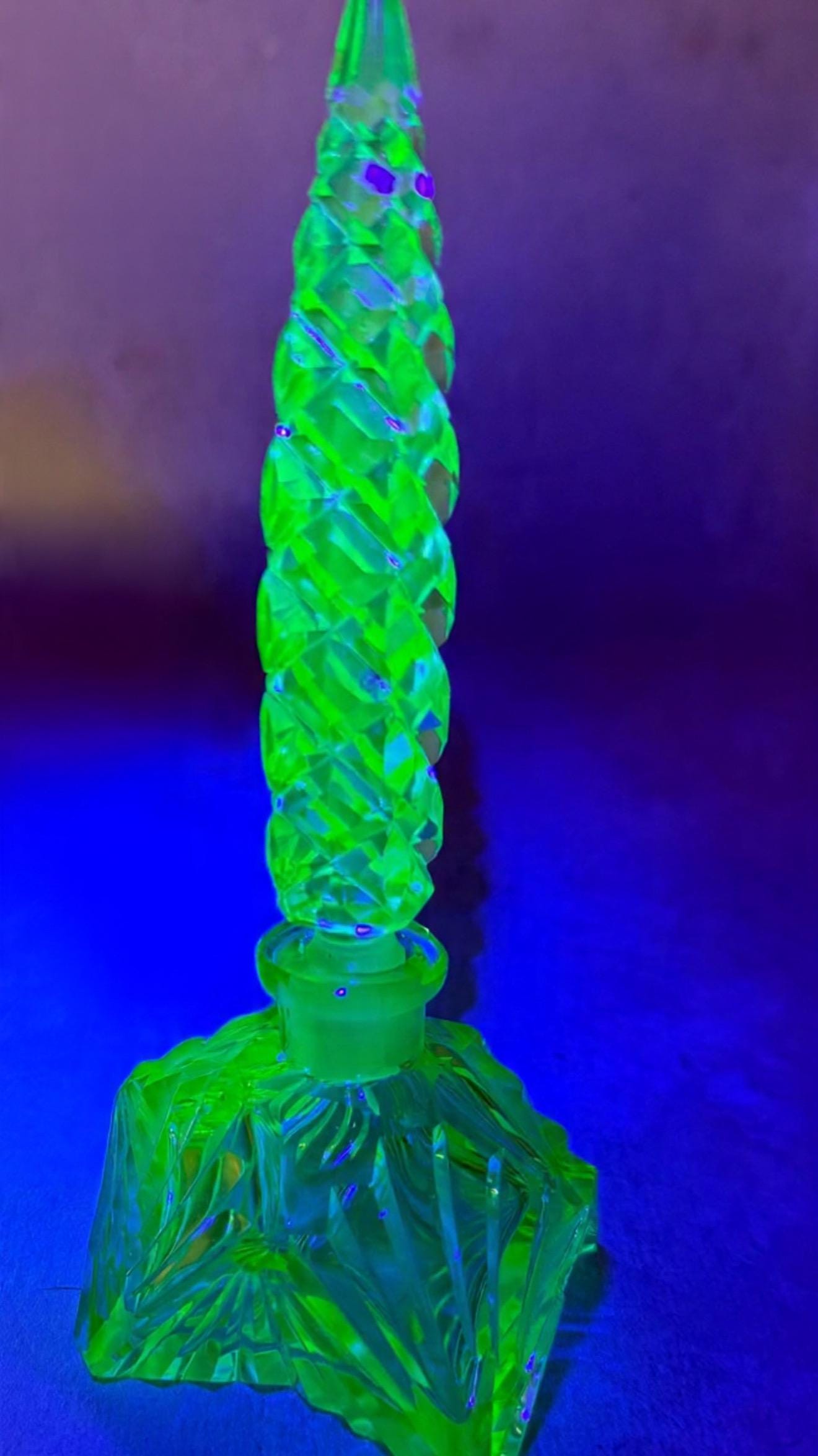 When placed under UV light, the piece emits a brilliant neon green glow — a hallmark of true uranium glass. Perfect for display on a vanity, dresser, or within a glass collection cabinet.