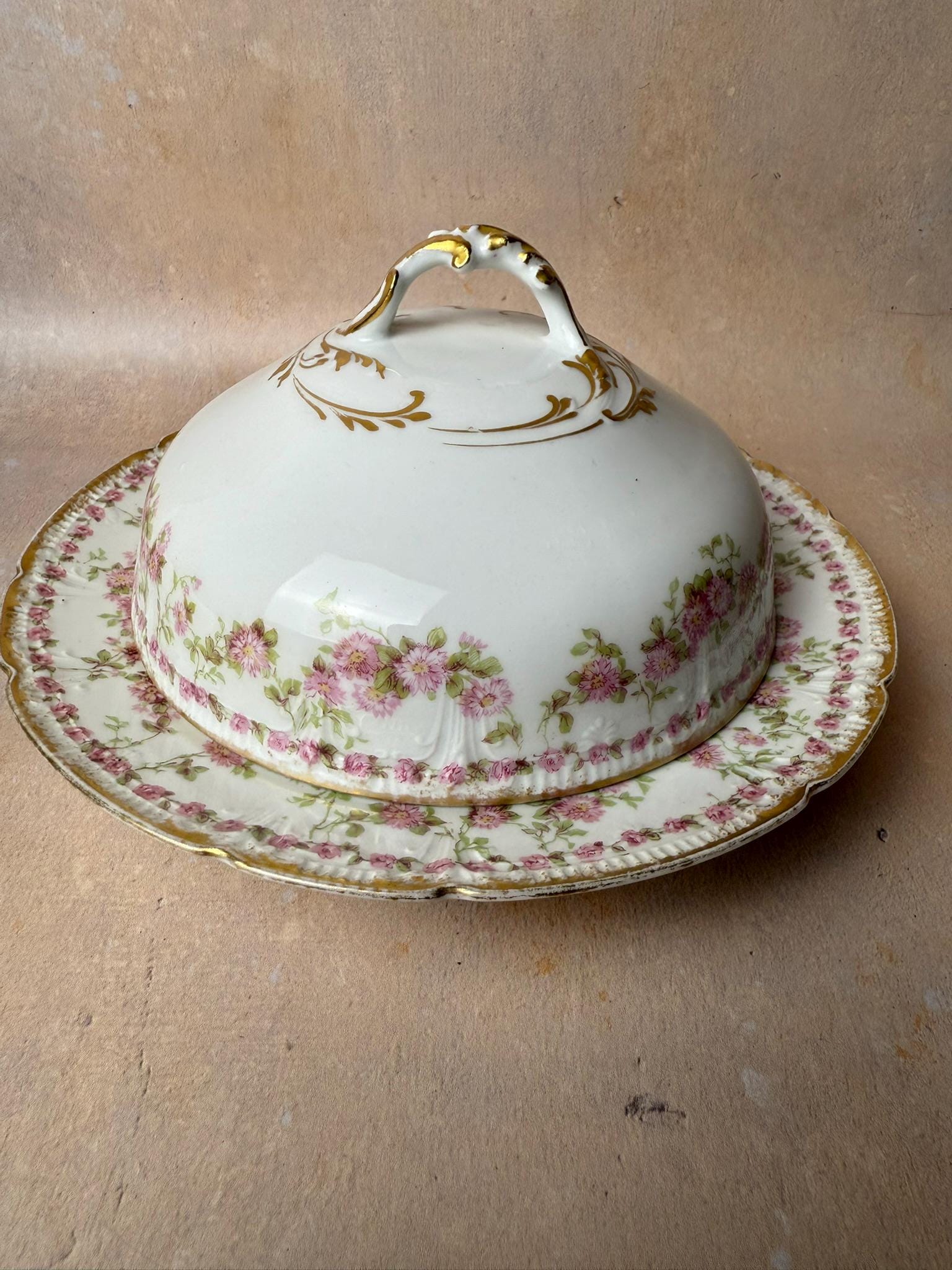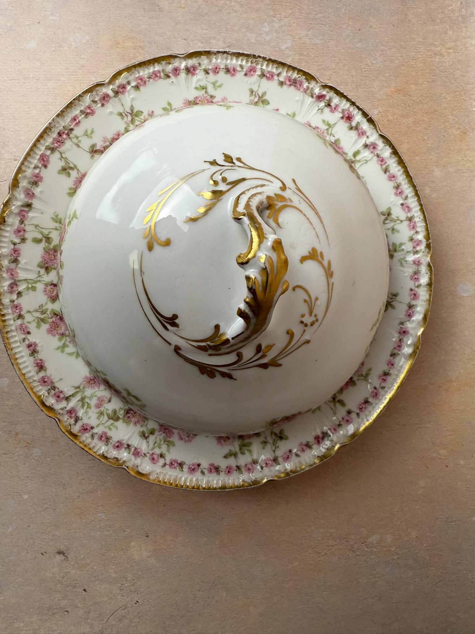 A charming antique Limoges covered butter dish by Charles Field Haviland, France. Soft pink florals and rich gilt details bring timeless French elegance to your table or display.