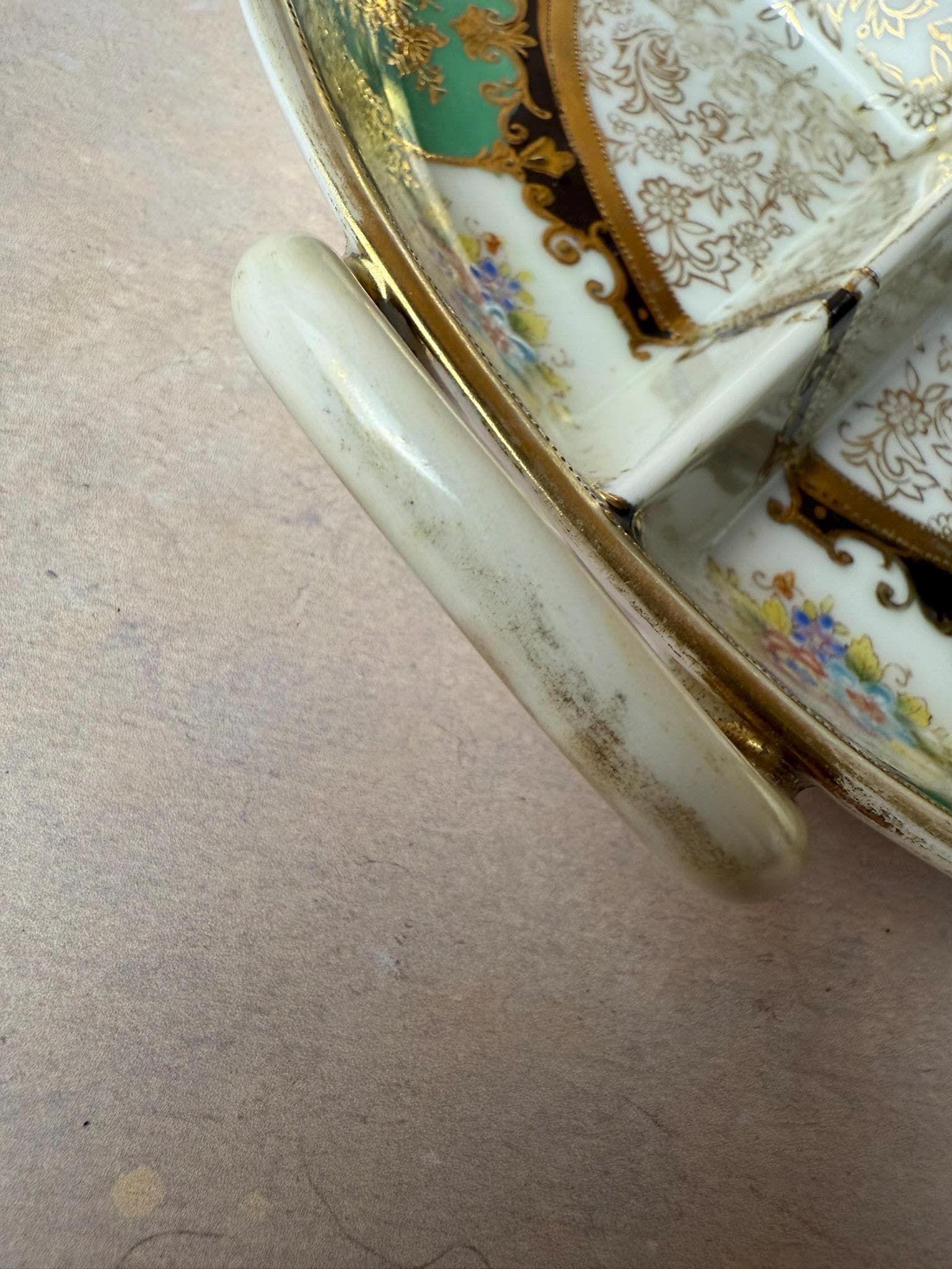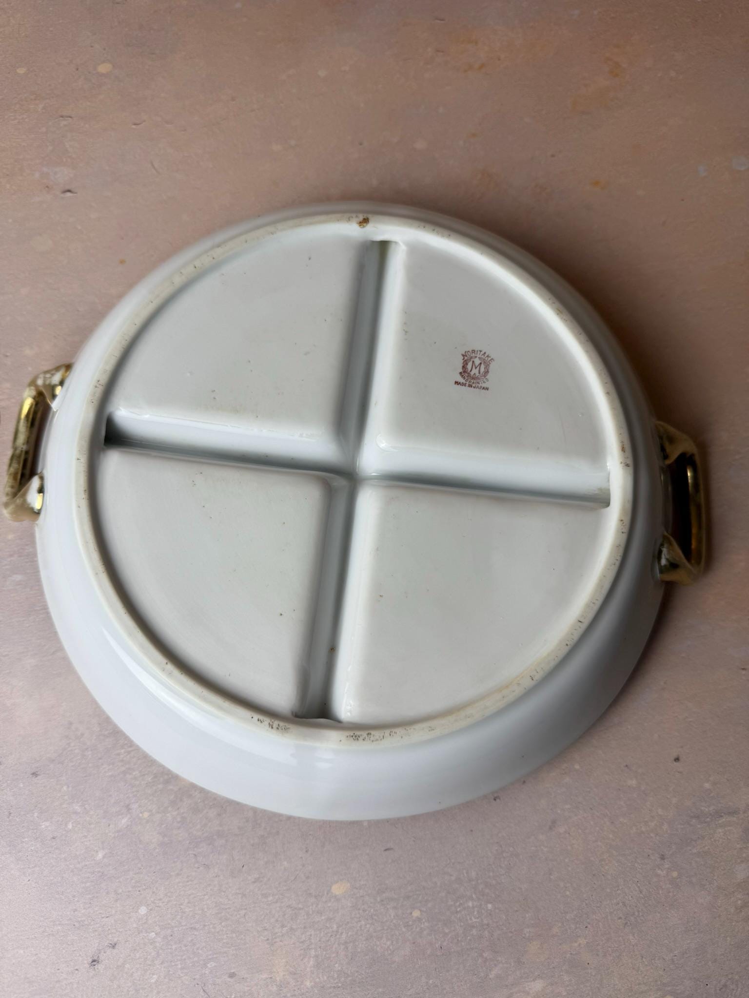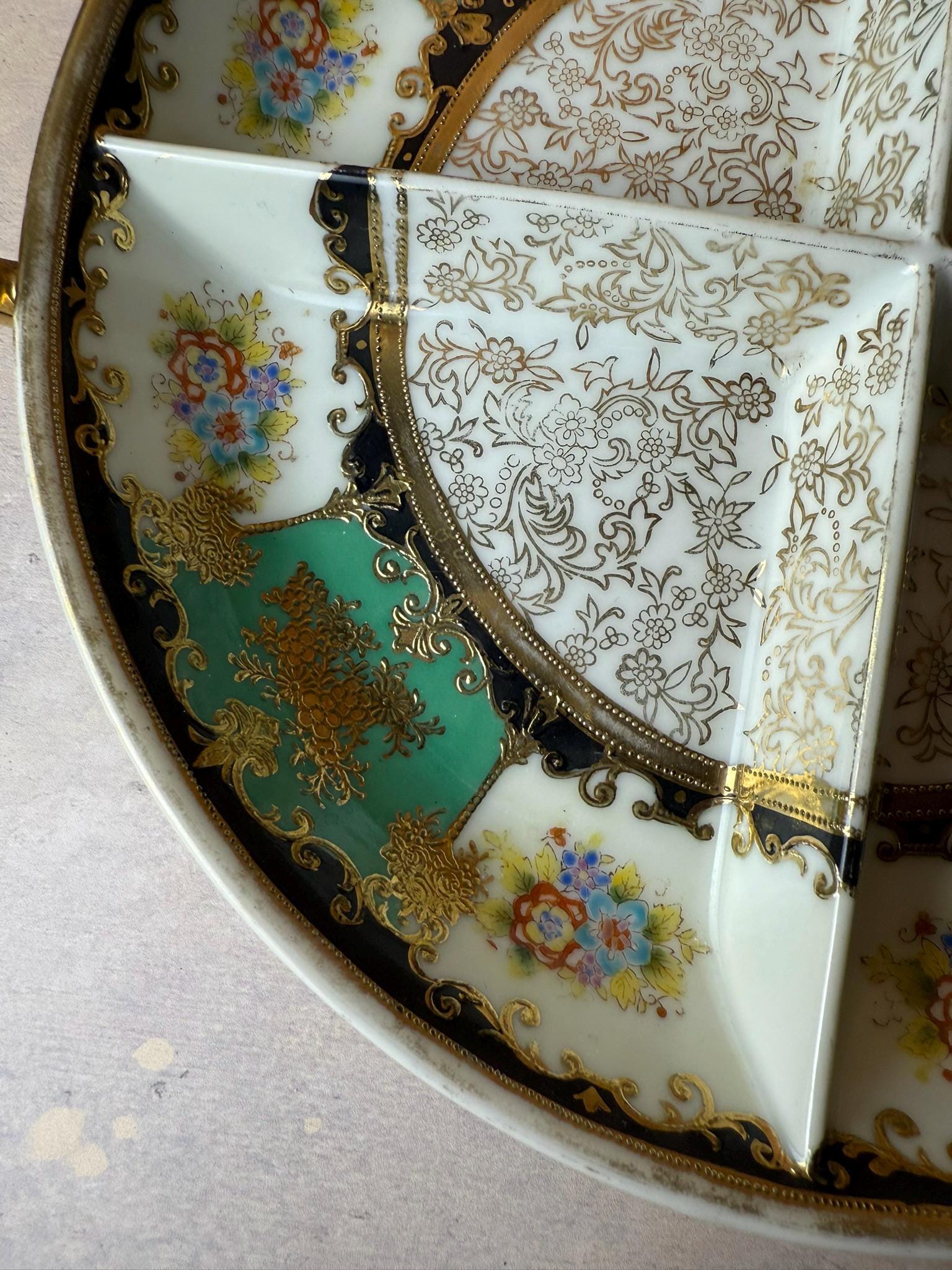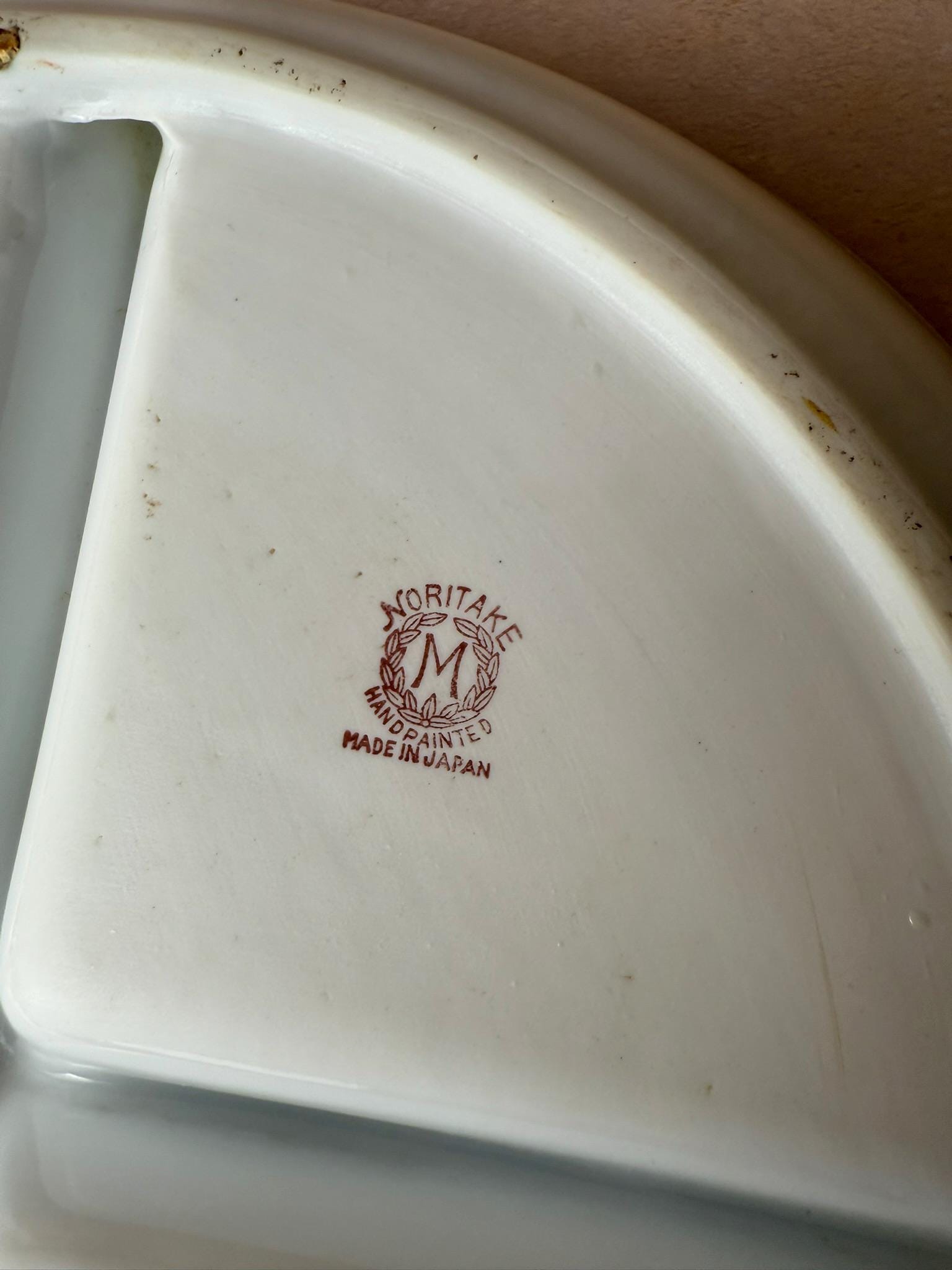 Founded in the early 1900s, Noritake quickly gained worldwide acclaim for its fine porcelain, characterized by intricate hand-painted details and lavish gilding. Their early 20th-century pieces often reflect a cross-cultural blend of Japanese artistry and Western decorative trends — particularly in elaborate serving pieces like this divided tray.