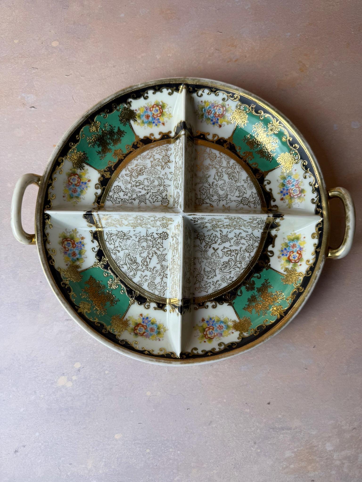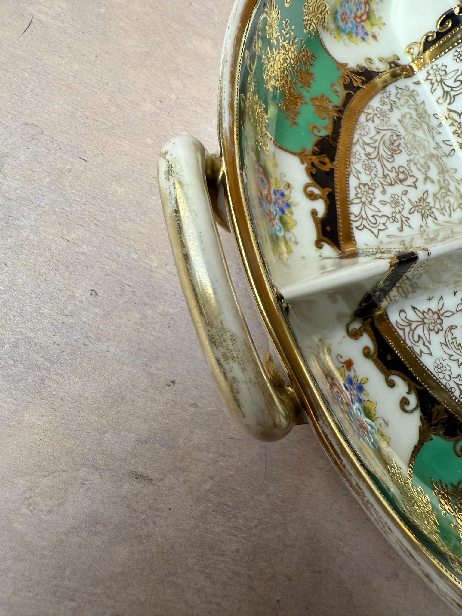 A stunning hand-painted Noritake divided serving dish from the 1920s, featuring rich emerald panels, gilded flourishes, and delicate florals. A true statement piece for entertaining or display.