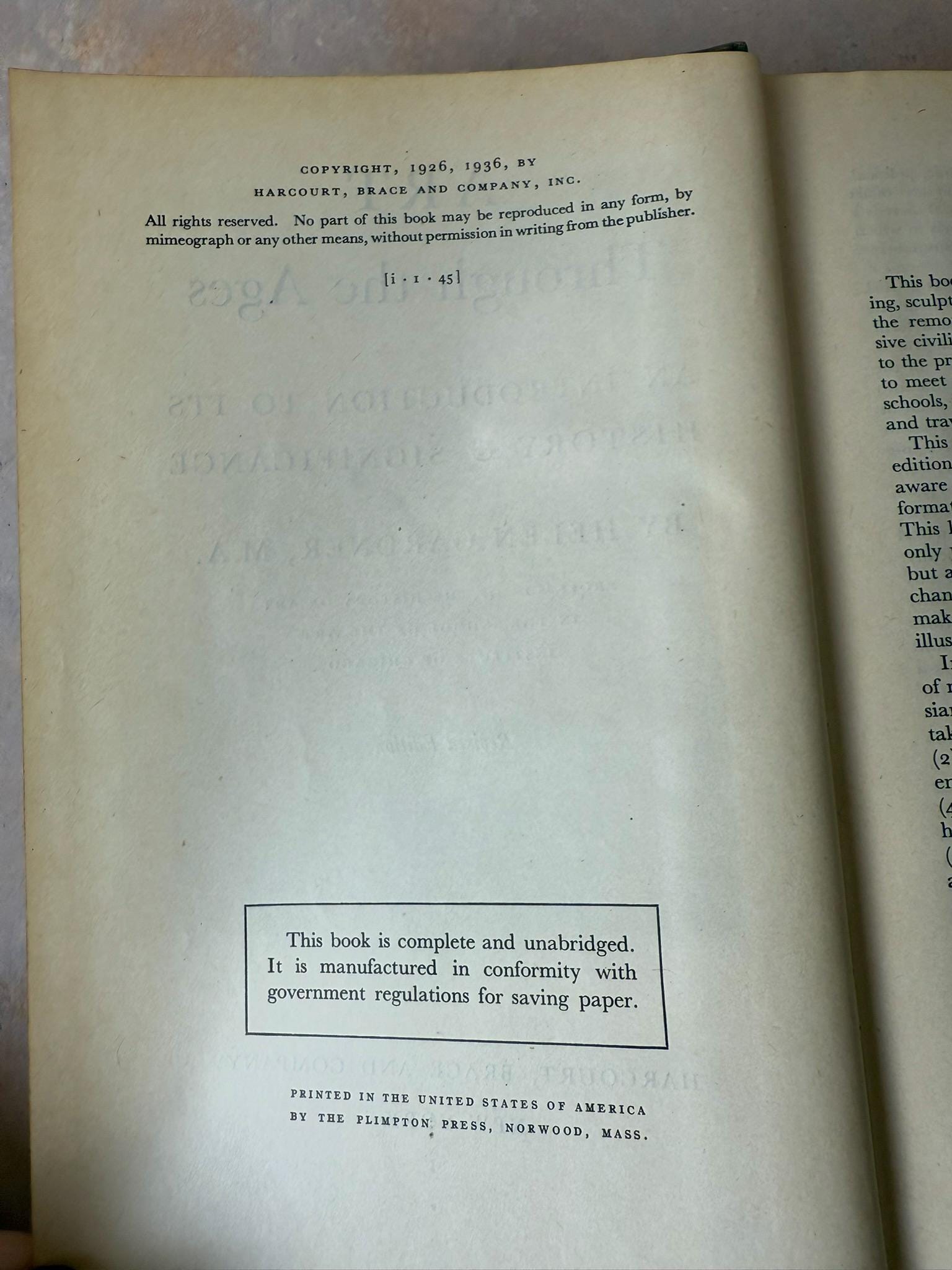 The original 1926 edition was groundbreaking: it was the first single-volume global art history text, used by generations of college and museum students. The 1945 Revised Edition retains Gardner's early writing style and classic illustrations before later academic updates standardized it.