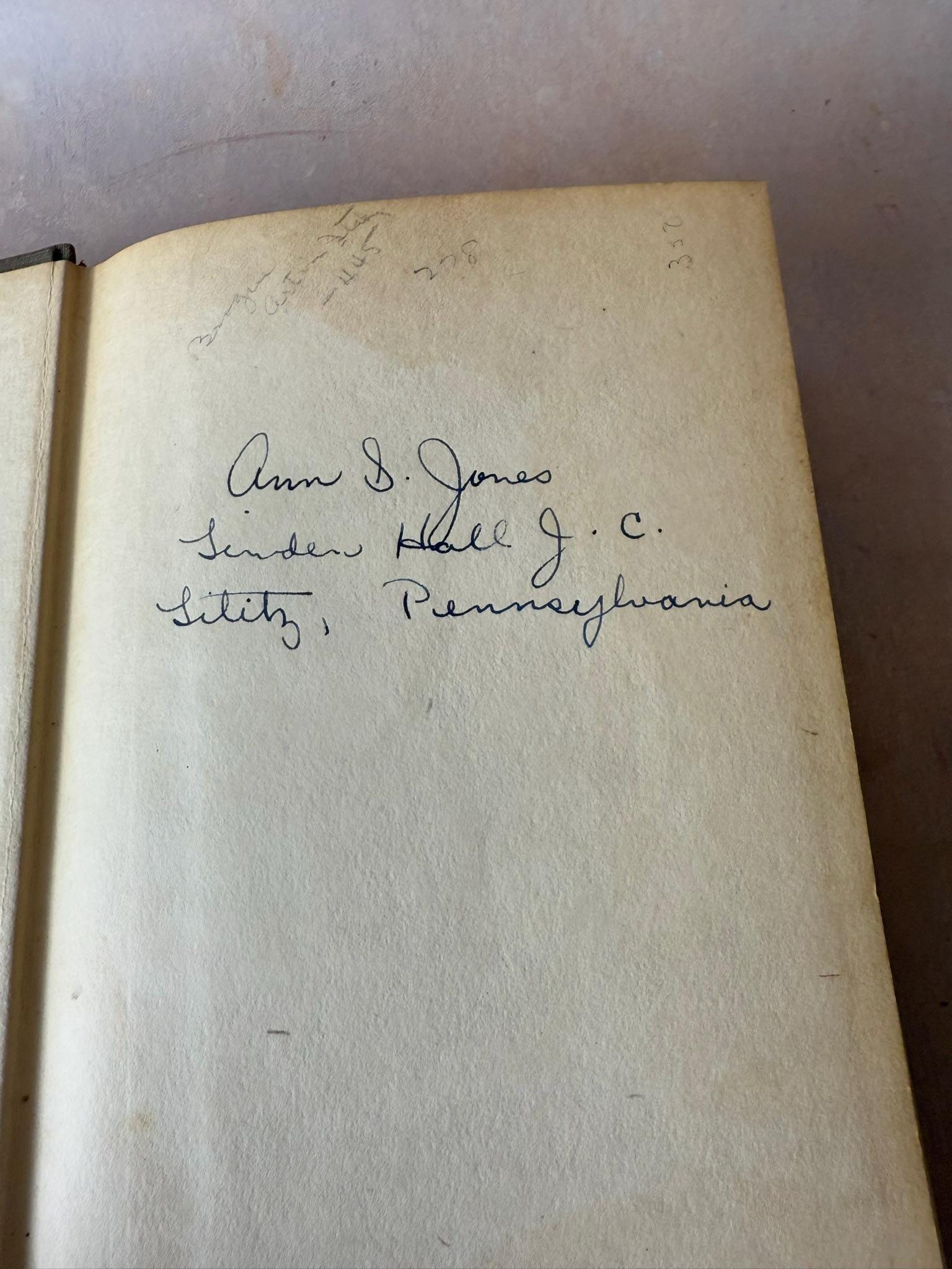 Period handwriting from the former owner — “Ann S. Jones, Linden Hall J.C., Lititz, Pennsylvania” — adds an authentic academic provenance. Linden Hall is one of the oldest girls’ schools in the U.S., adding charm and a story for collectors. Also has "Robby" written on the side pages.