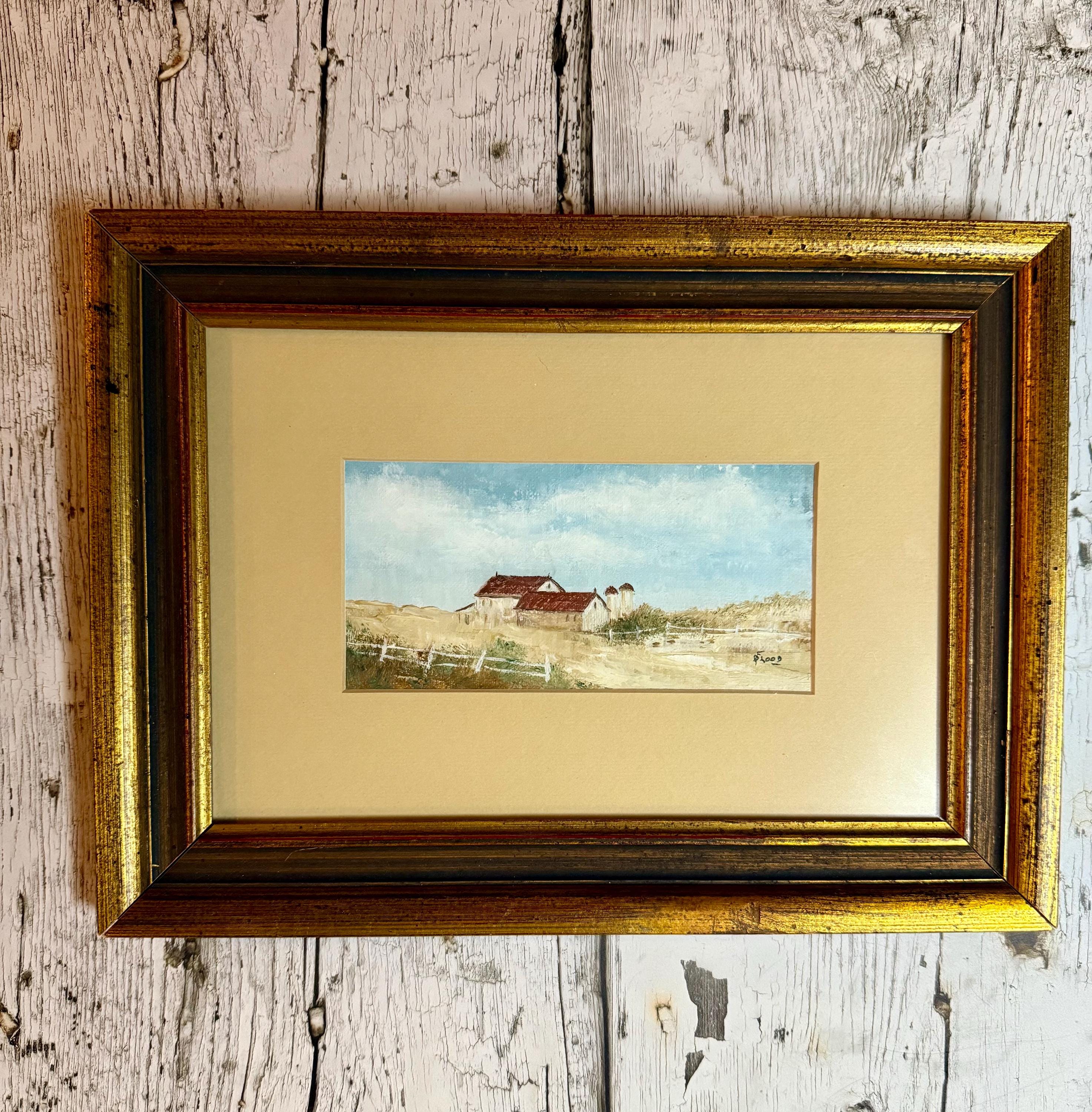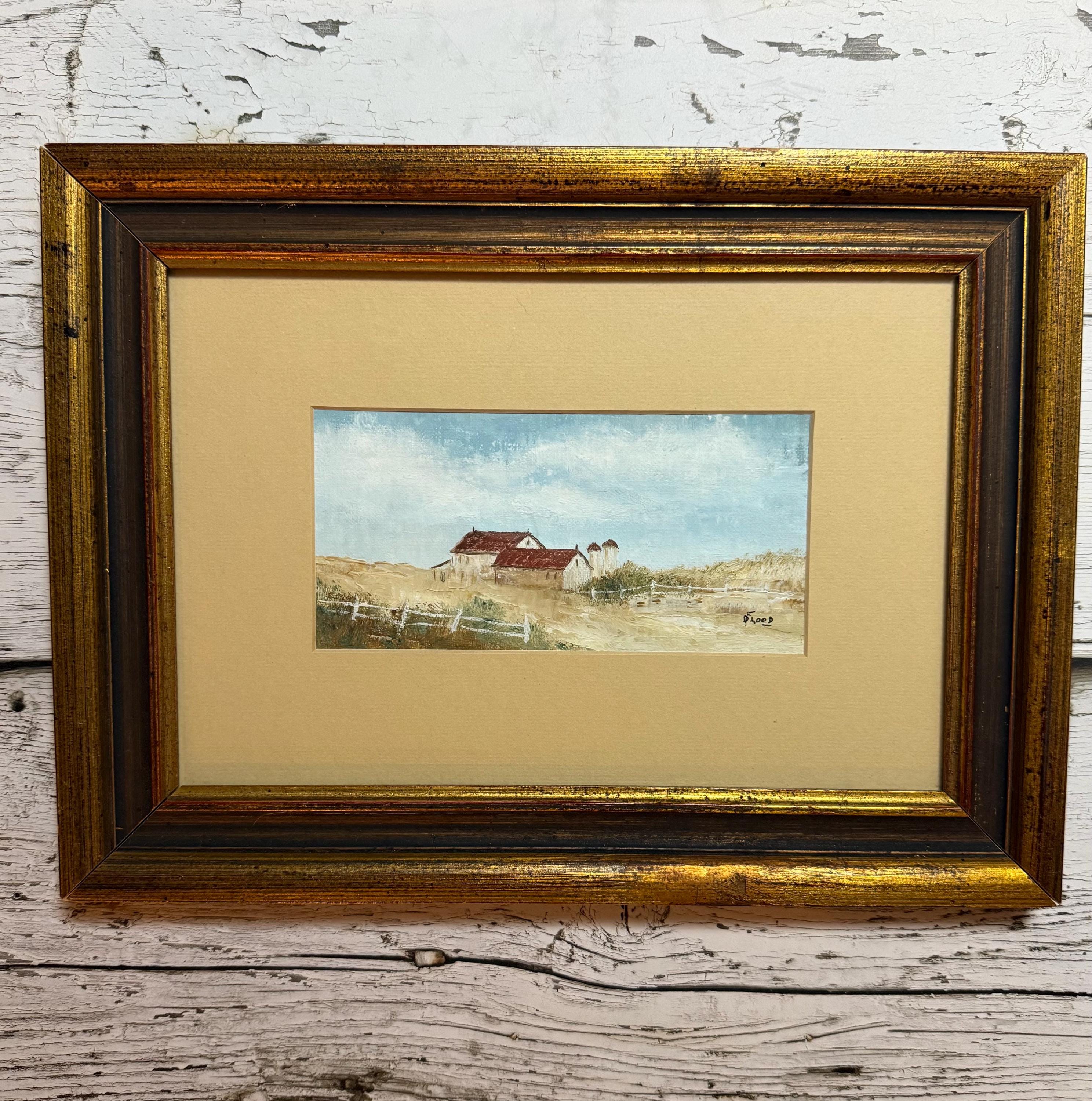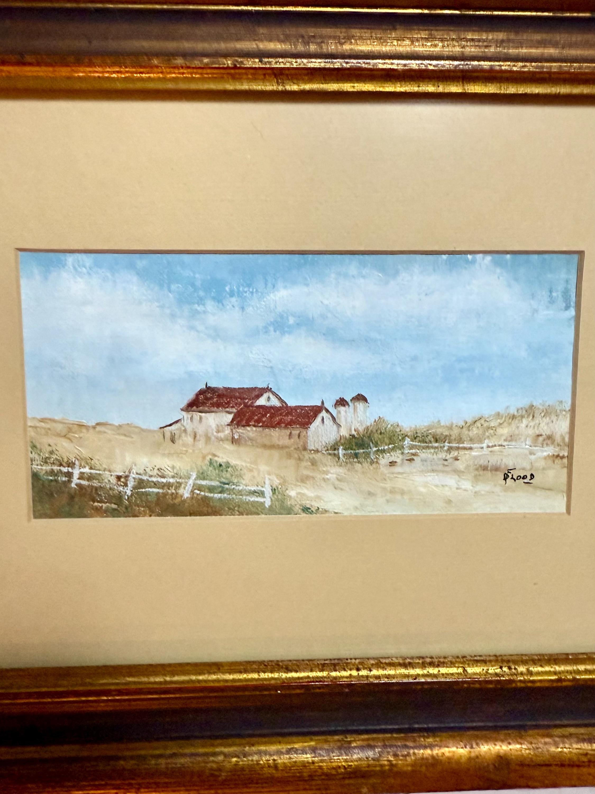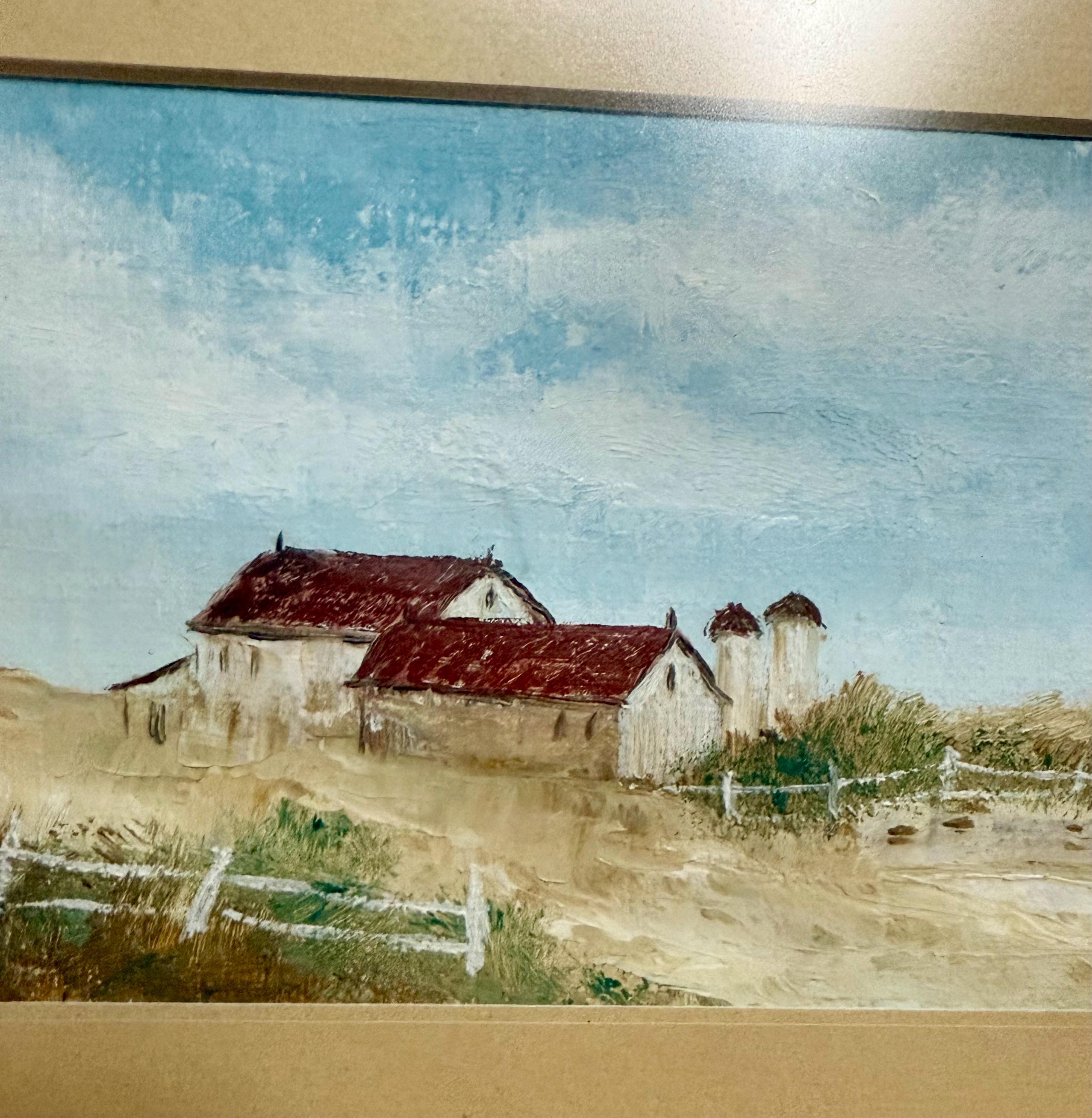 Bring a touch of Americana charm to your space with this beautifully framed original oil painting by listed artist Dorothea R. Flood. Capturing a peaceful rural farm landscape with red-roofed barns and silos under a vivid sky, this piece is rich with texture, depth, and warmth. Housed in its original wood and gilt frame with a double mat, it’s ready to hang and enjoy.