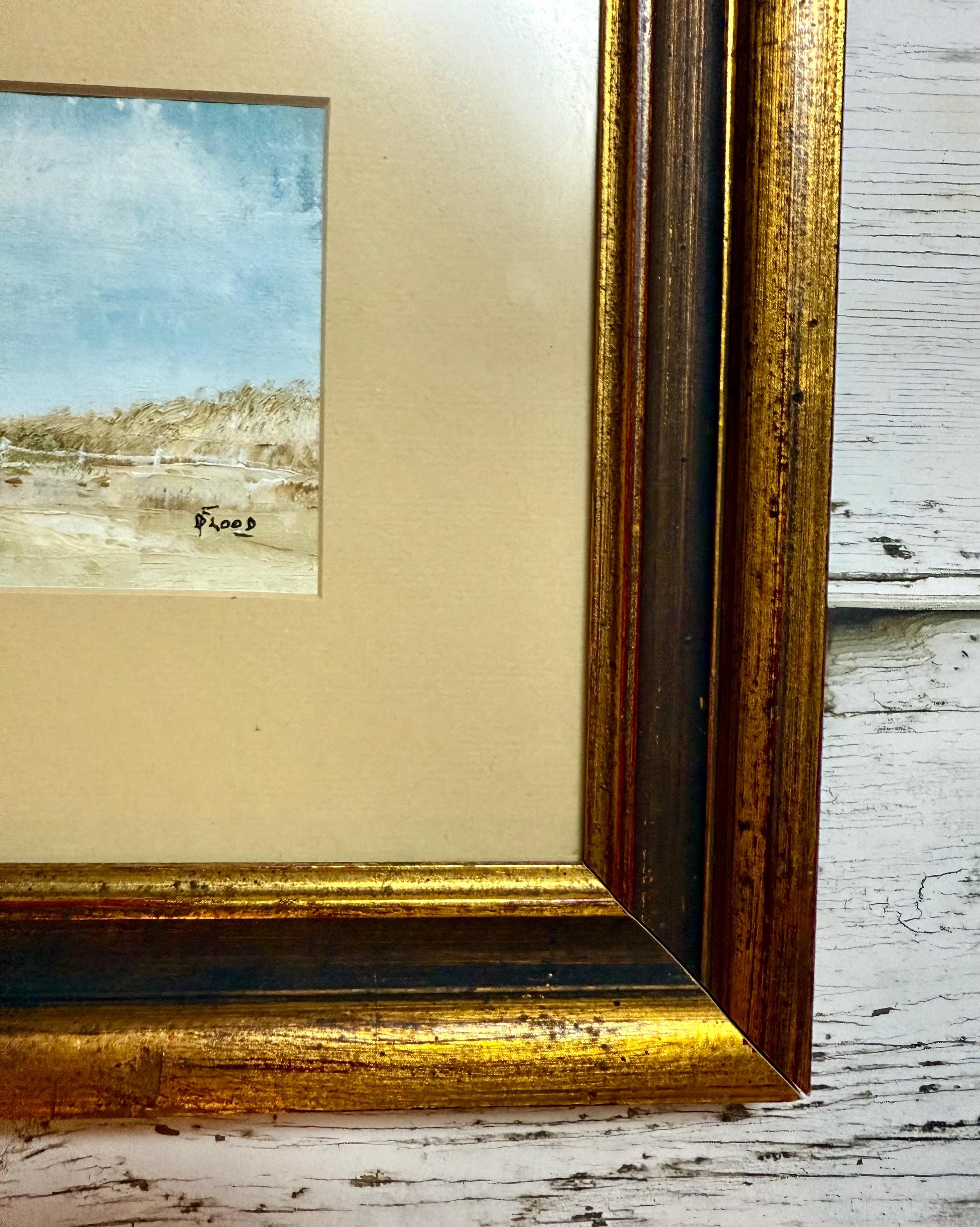 I was immediately drawn to the pastoral serenity in this painting—the textured brushwork, the dreamy blue sky, and the way the barn roofs glow with rustic red. It feels like a memory of a slower, simpler time. Dorothea R. Flood’s signature is clearly visible, adding a special touch of authenticity. I knew it would be a meaningful find for someone who appreciates traditional landscapes or mid-century Americana.