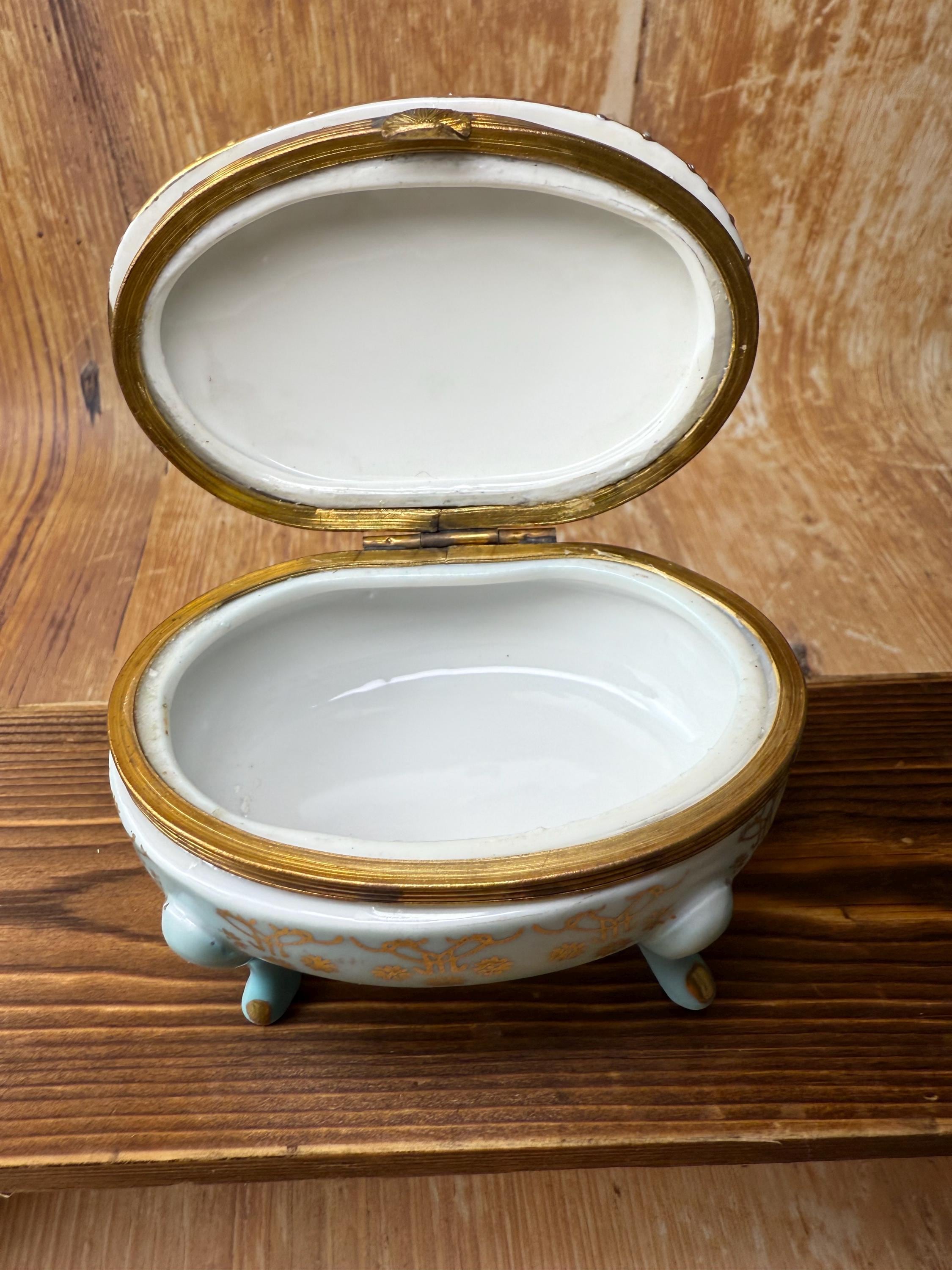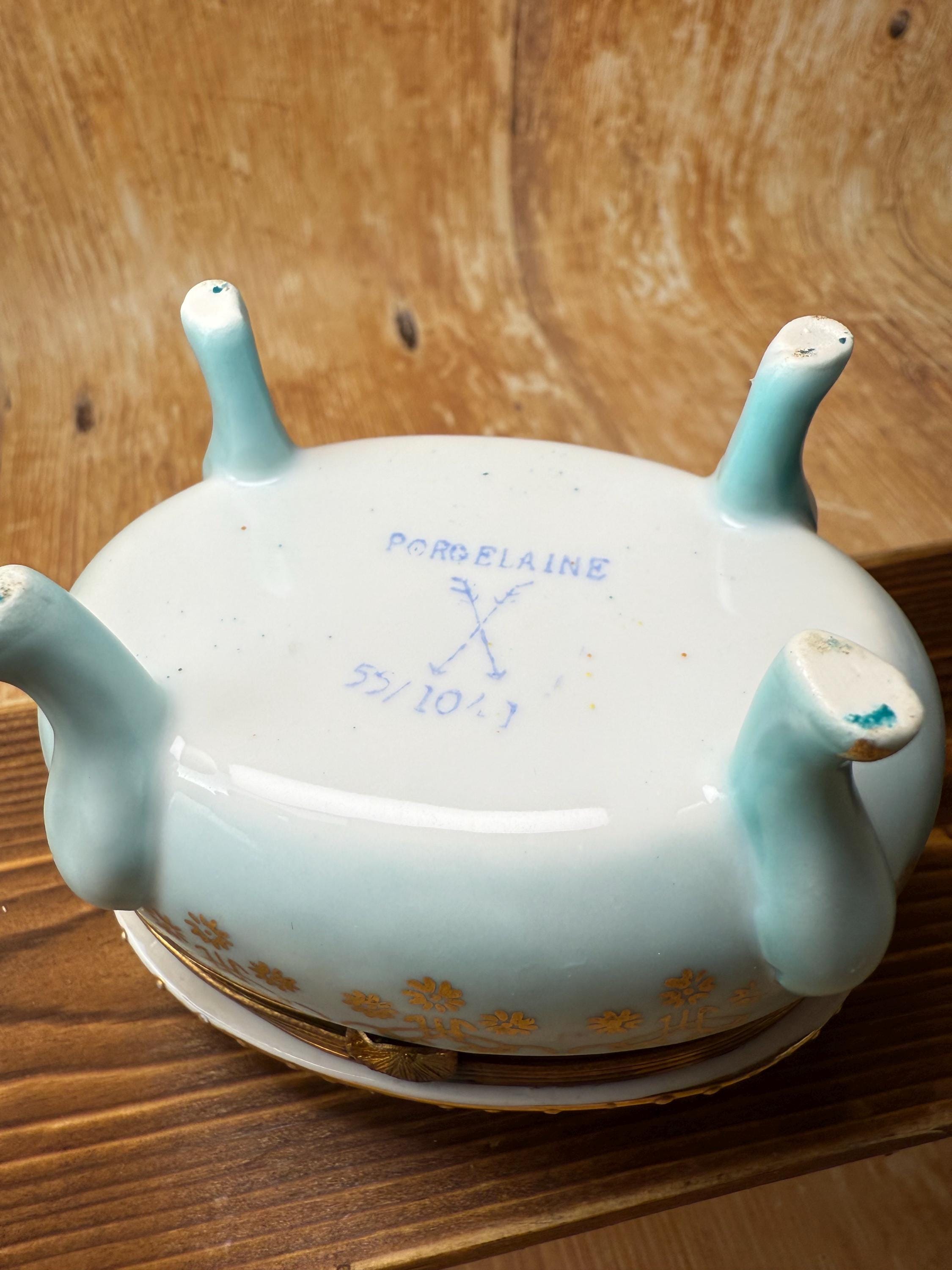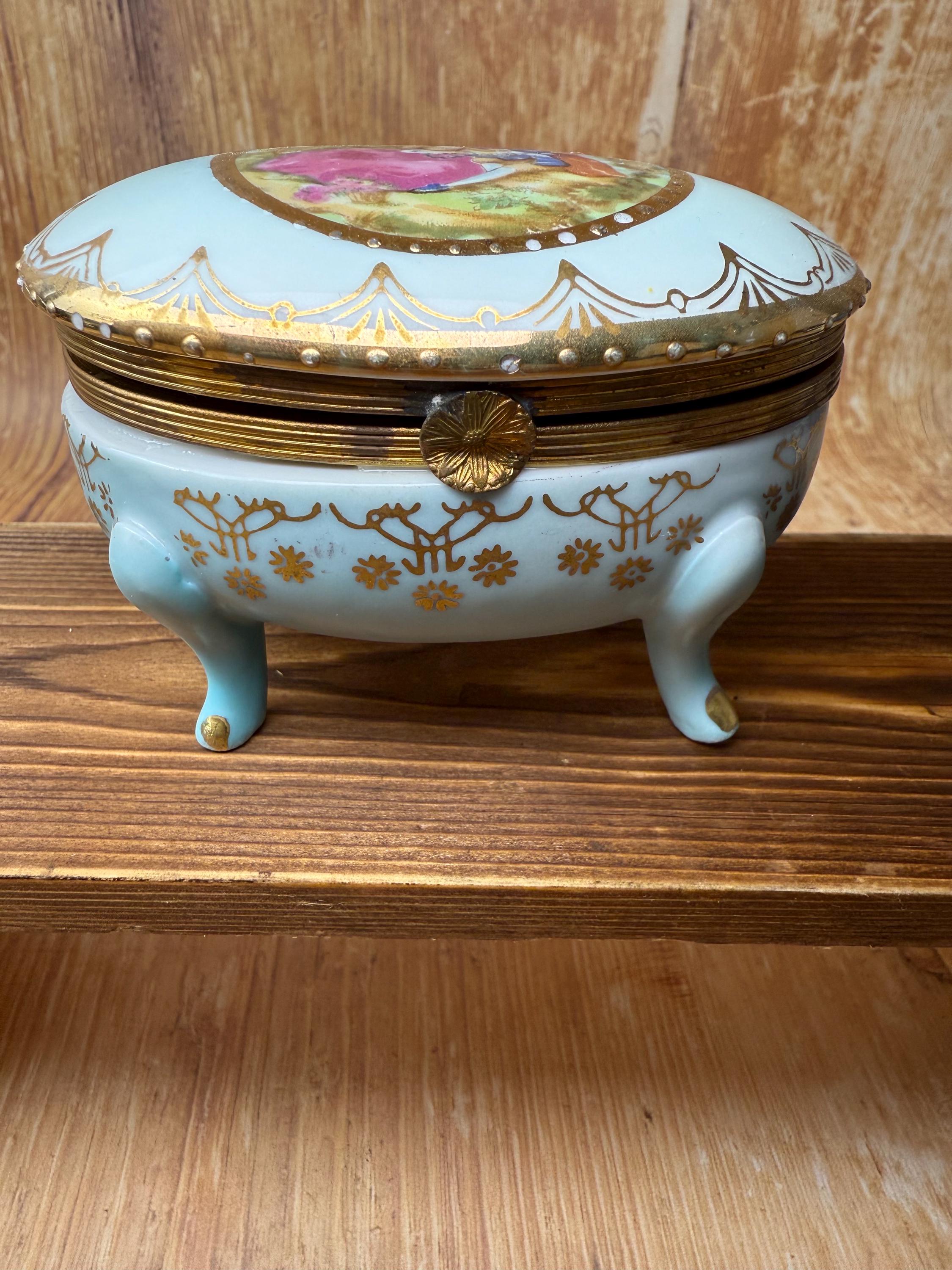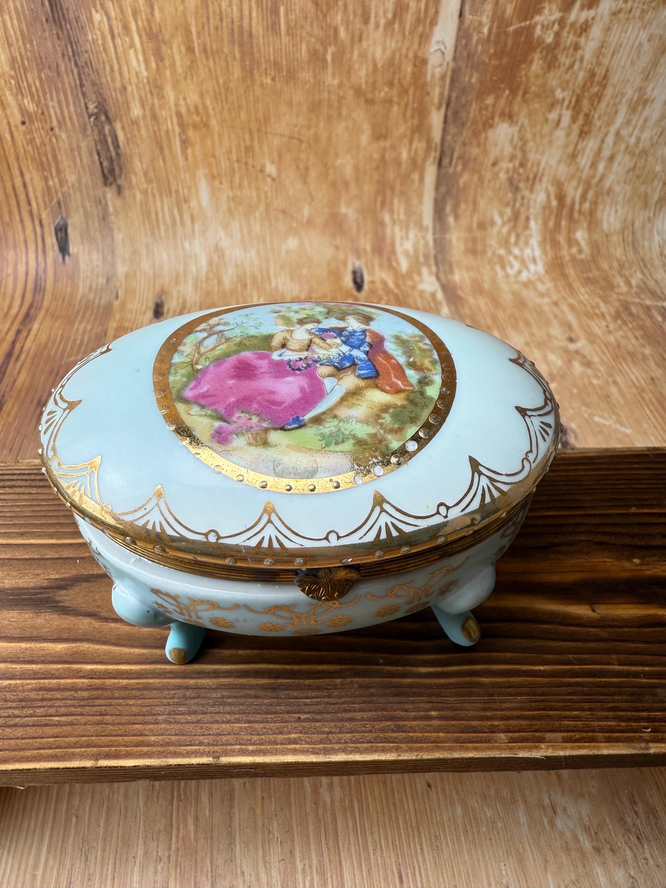 This oval porcelain trinket box is a dreamy pastel blue with a romantic countryside courting scene framed in gold on the domed lid. Condition is gently vintage with a bit of expected wear on the gold accents and feet, but the piece displays beautifully. The footed base gives it a sweet, elevated silhouette, and the interior is bright white and clean—perfect for jewelry, small keepsakes, or turning into an instant ready-to-give gift. The “Porcelaine” blue stamp with crossed branches suggests mid-century European decorative production, adding a little collecting charm. Soft, feminine, and gift-ready—ideal for birthdays, bridesmaids, or “just because” surprises.