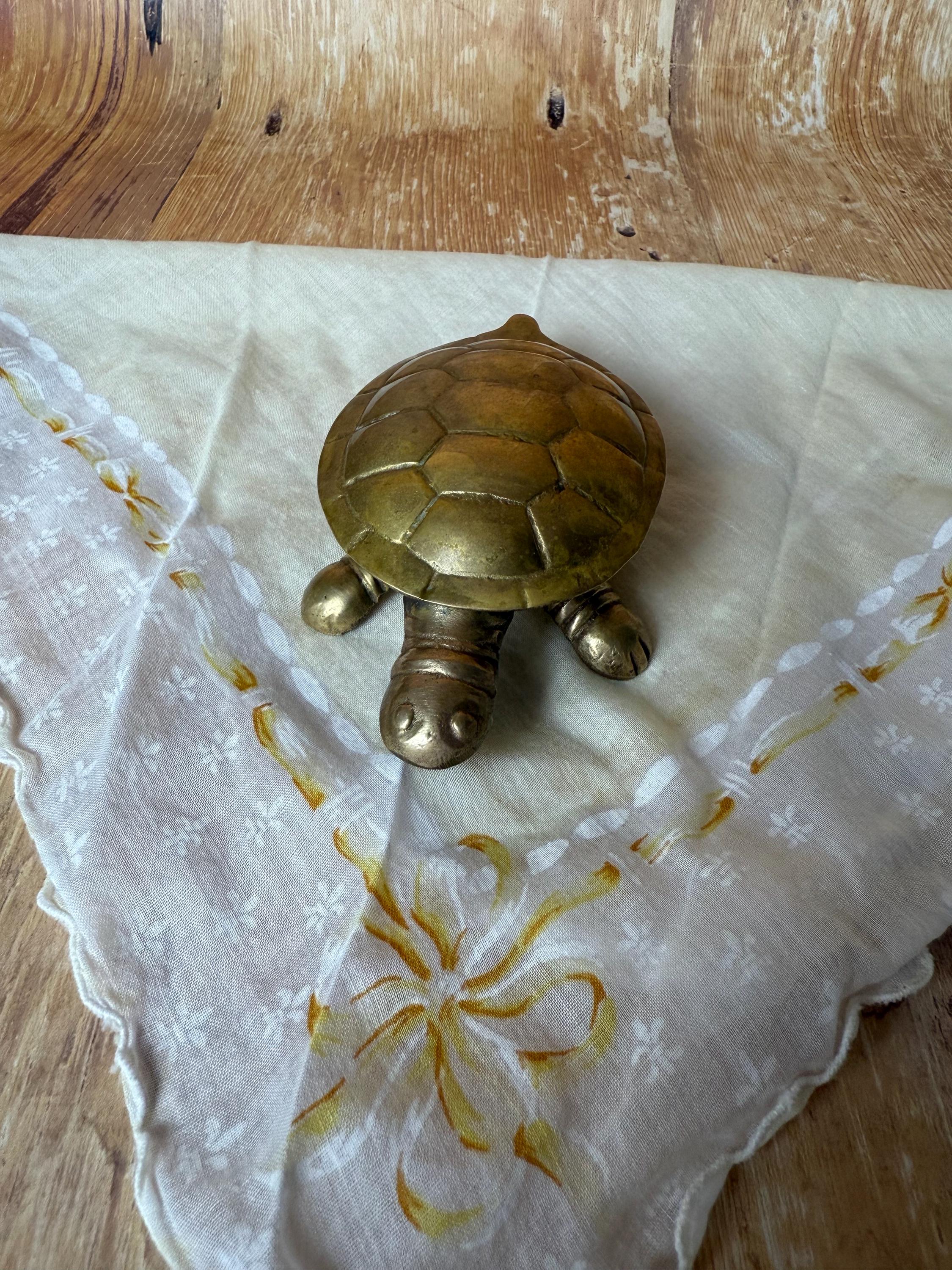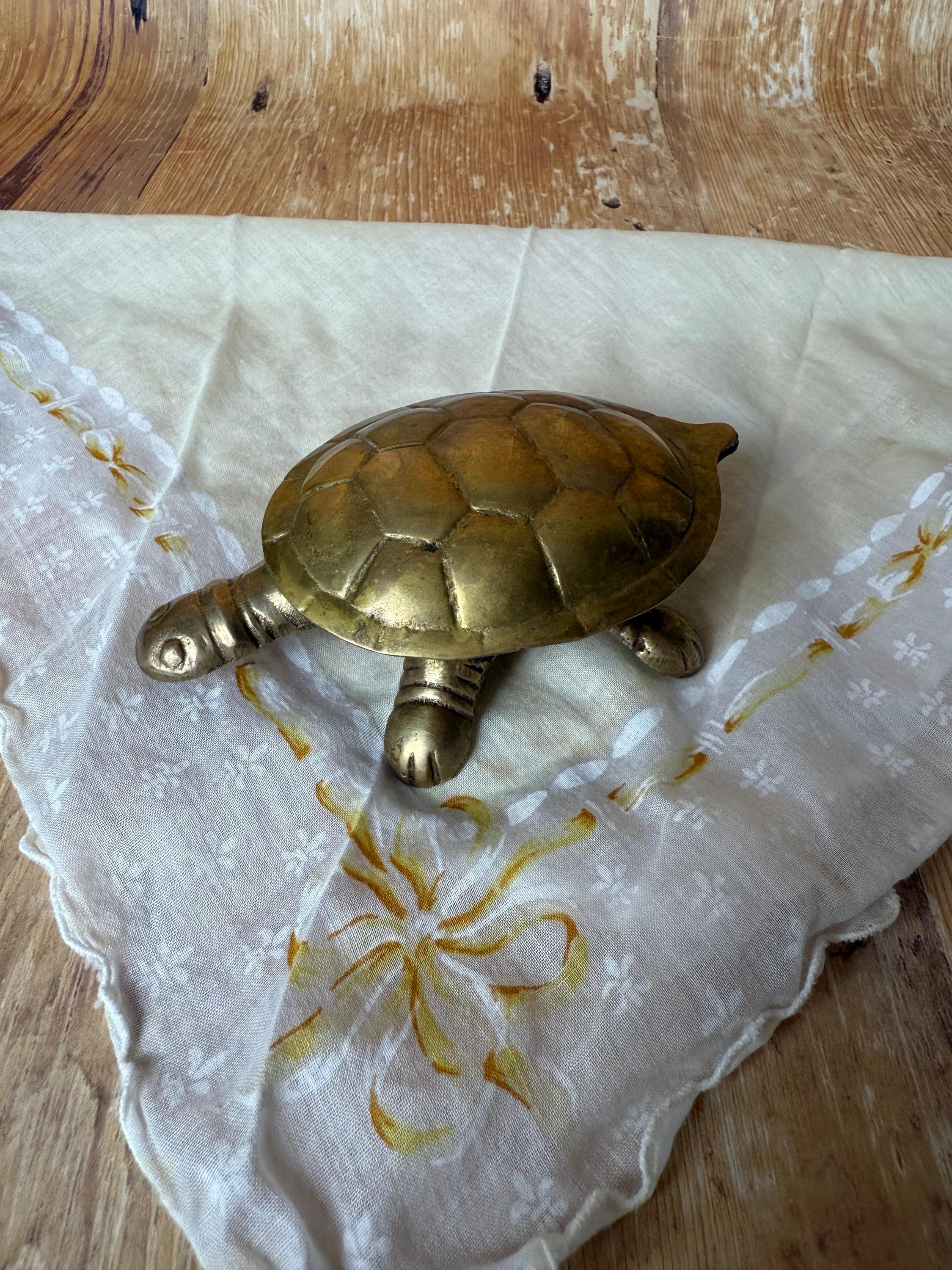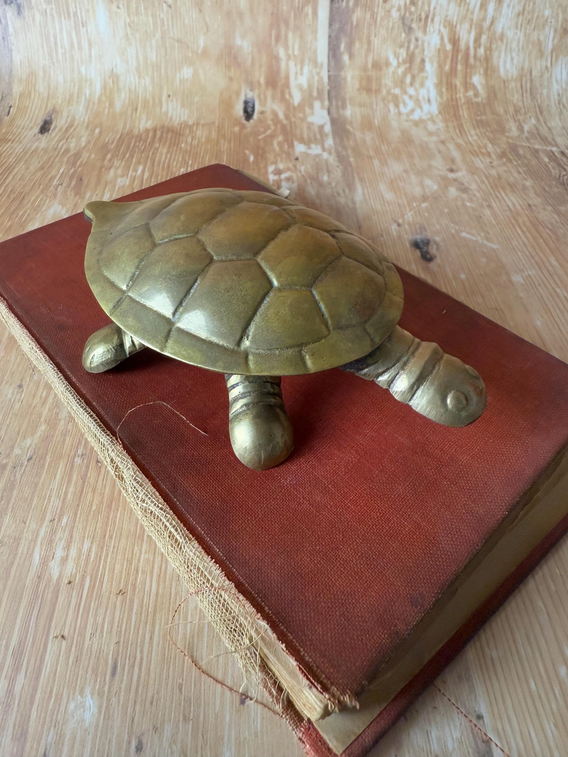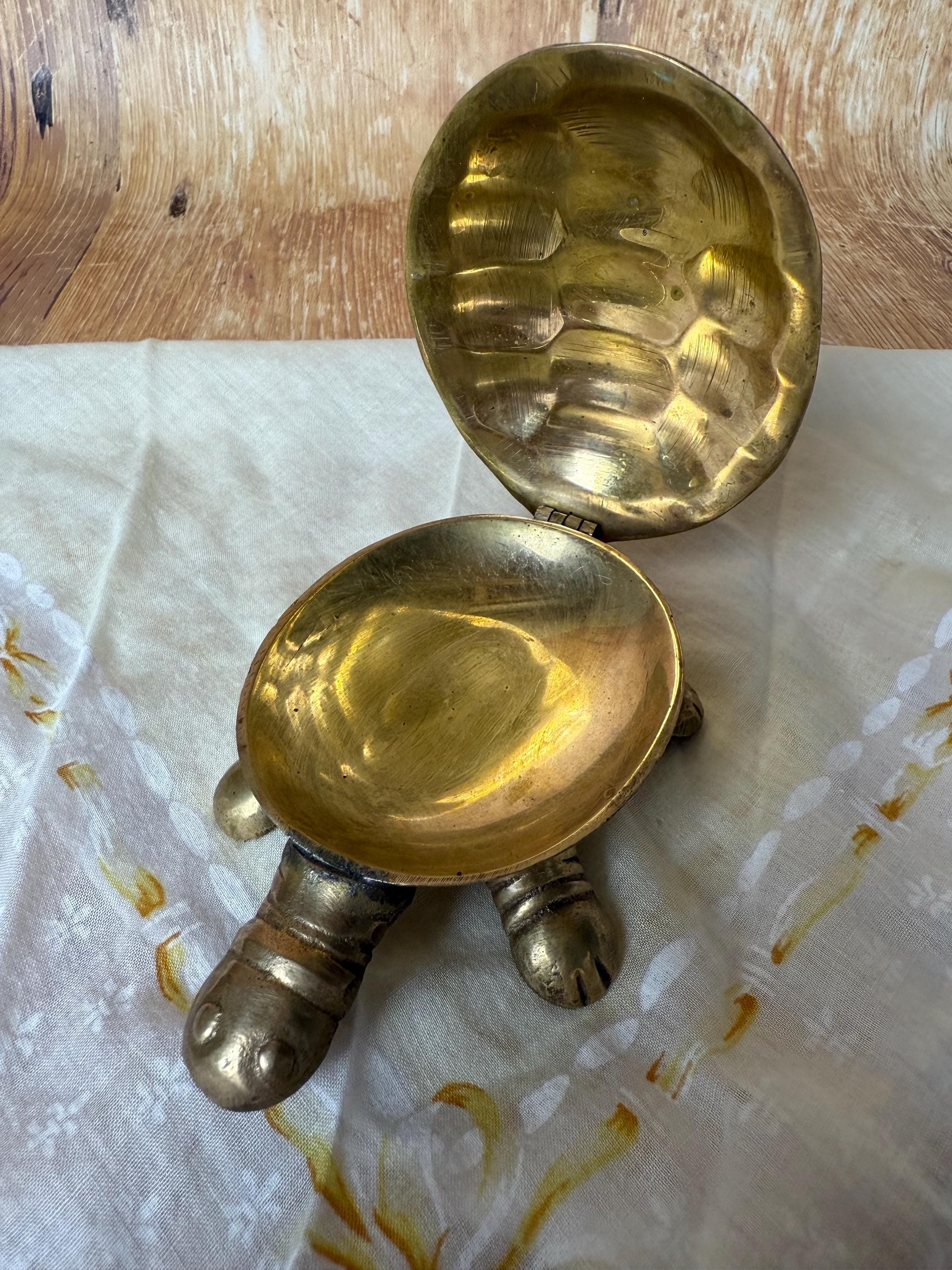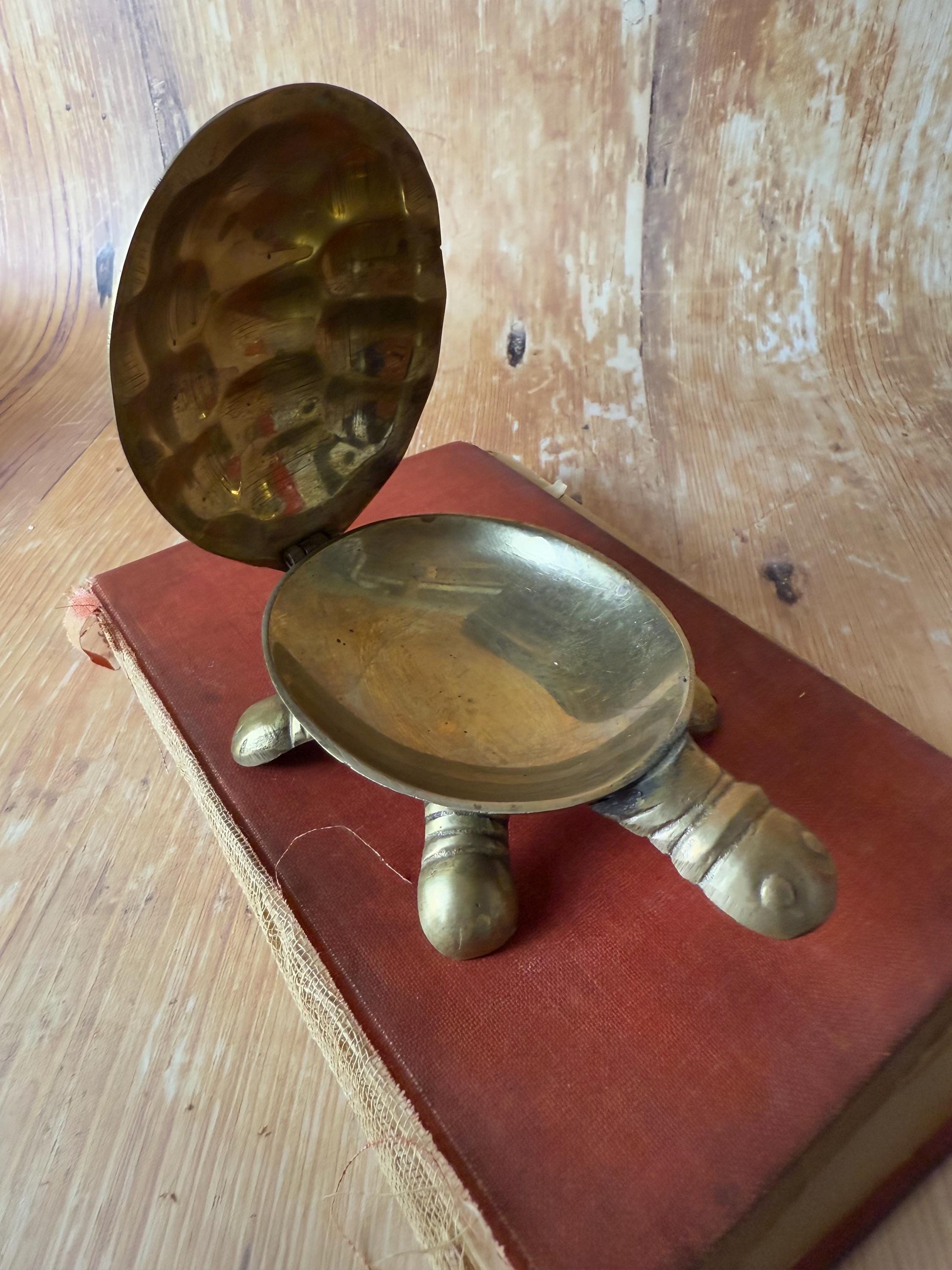A whimsical little treasure! This solid brass turtle measures 5” long and features a hinged shell that opens to reveal a hidden compartment. Perfect for storing rings, keepsakes, or simply displayed as a charming decorative accent. Nicely aged with a warm patina.