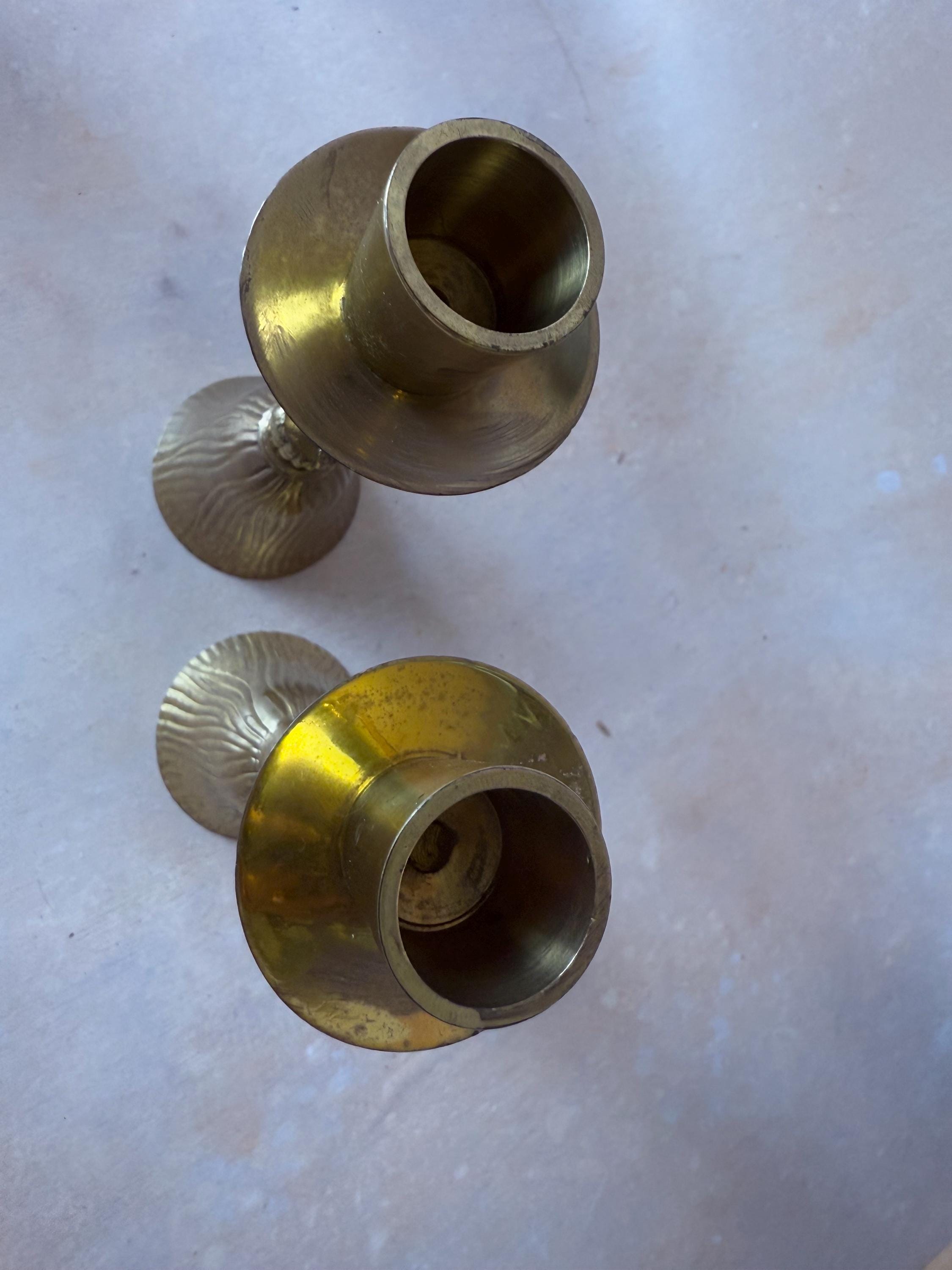 Infuse your home with a touch of mid-century Italian elegance. This stunning pair of vintage brass candlestick holders features twisted stems and beautifully ribbed, bell-shaped bases that evoke the glamorous “Hollywood Regency” era. With their warm golden patina and sculptural silhouette, these candleholders bring a sense of drama, sophistication, and vintage charm to any room.