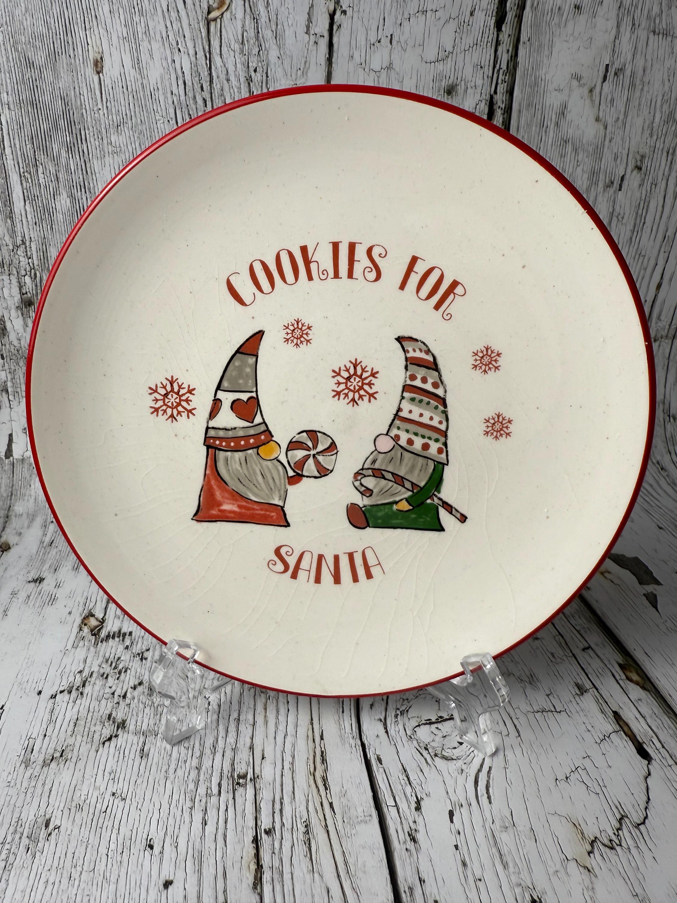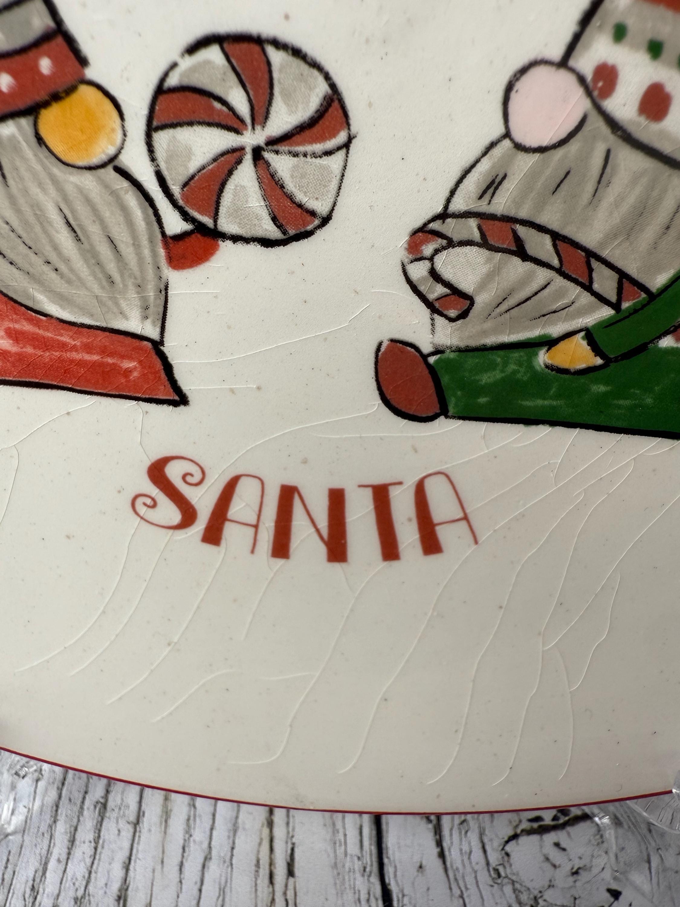 Start a sweet tradition with this charming holiday plate designed for the jolliest guest of all—Santa himself! Featuring two festive gnomes exchanging candy canes beneath snowflakes, this whimsical “Cookies for Santa” plate is sure to add extra magic to your Christmas Eve ritual. With its warm red rim and playful lettering, it’s perfect for little hands and holiday hearts alike.