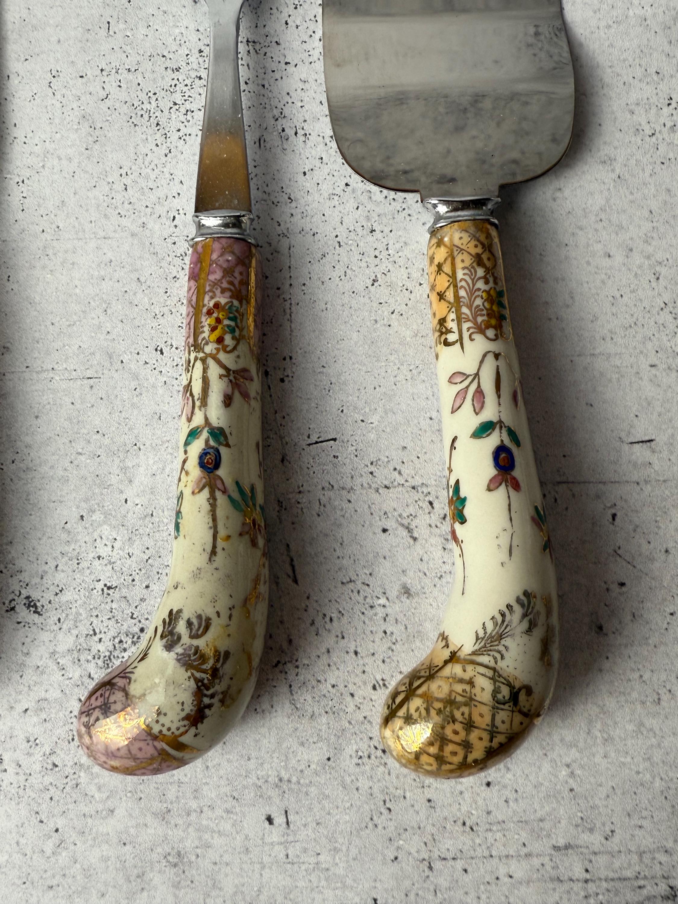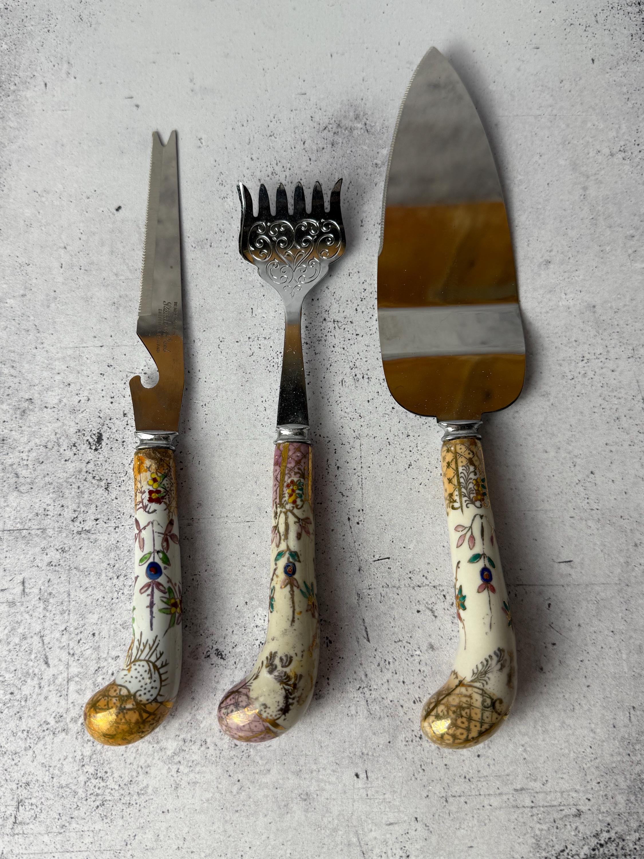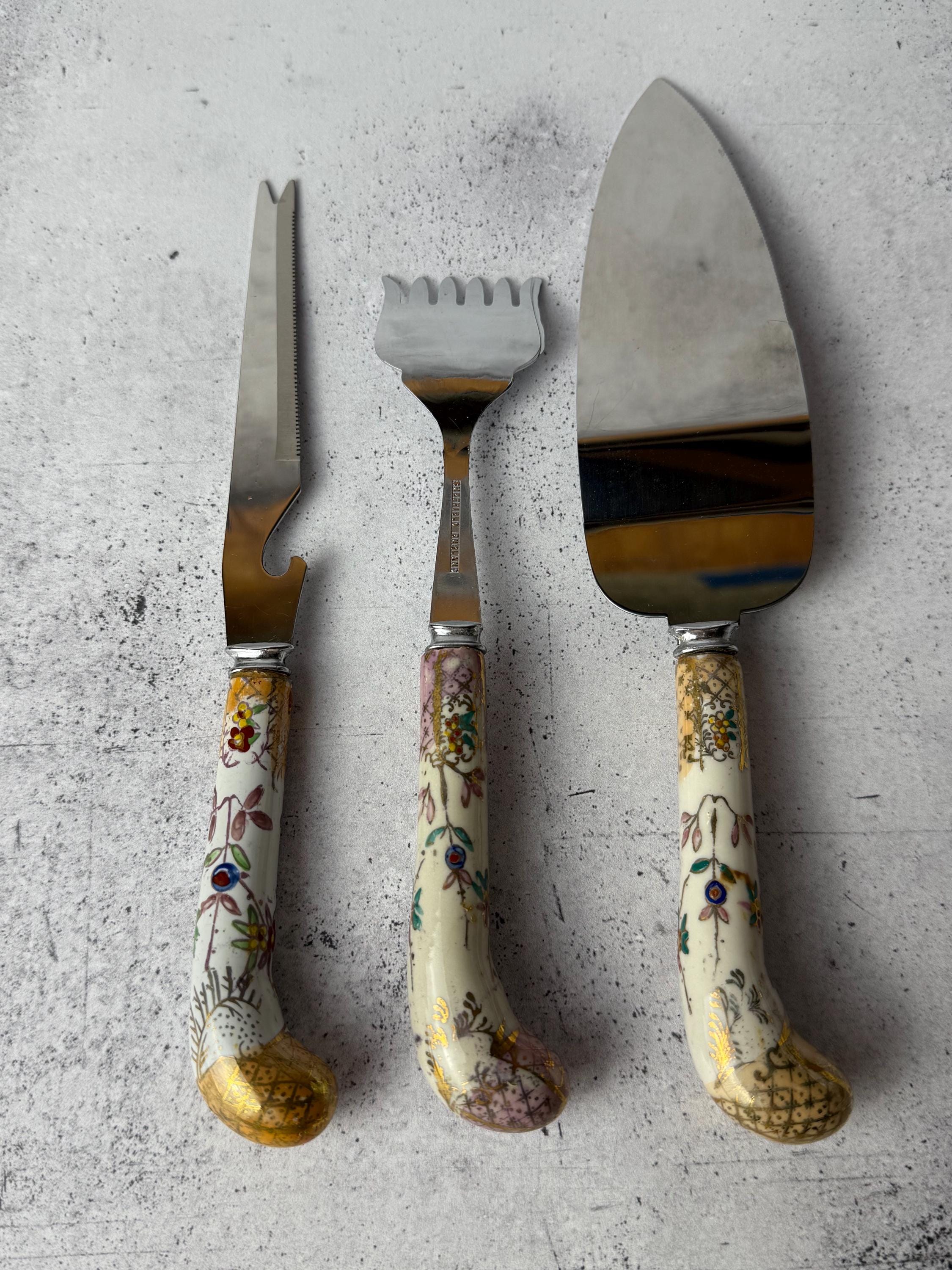 This elegant vintage serving set from Sheffield, England, features three beautifully crafted utensils with curved porcelain handles hand-painted in a delicate floral and gilt pattern. The set includes a cheese knife, a dessert fork, and a pie or cake server — perfect for entertaining with an English countryside flair.