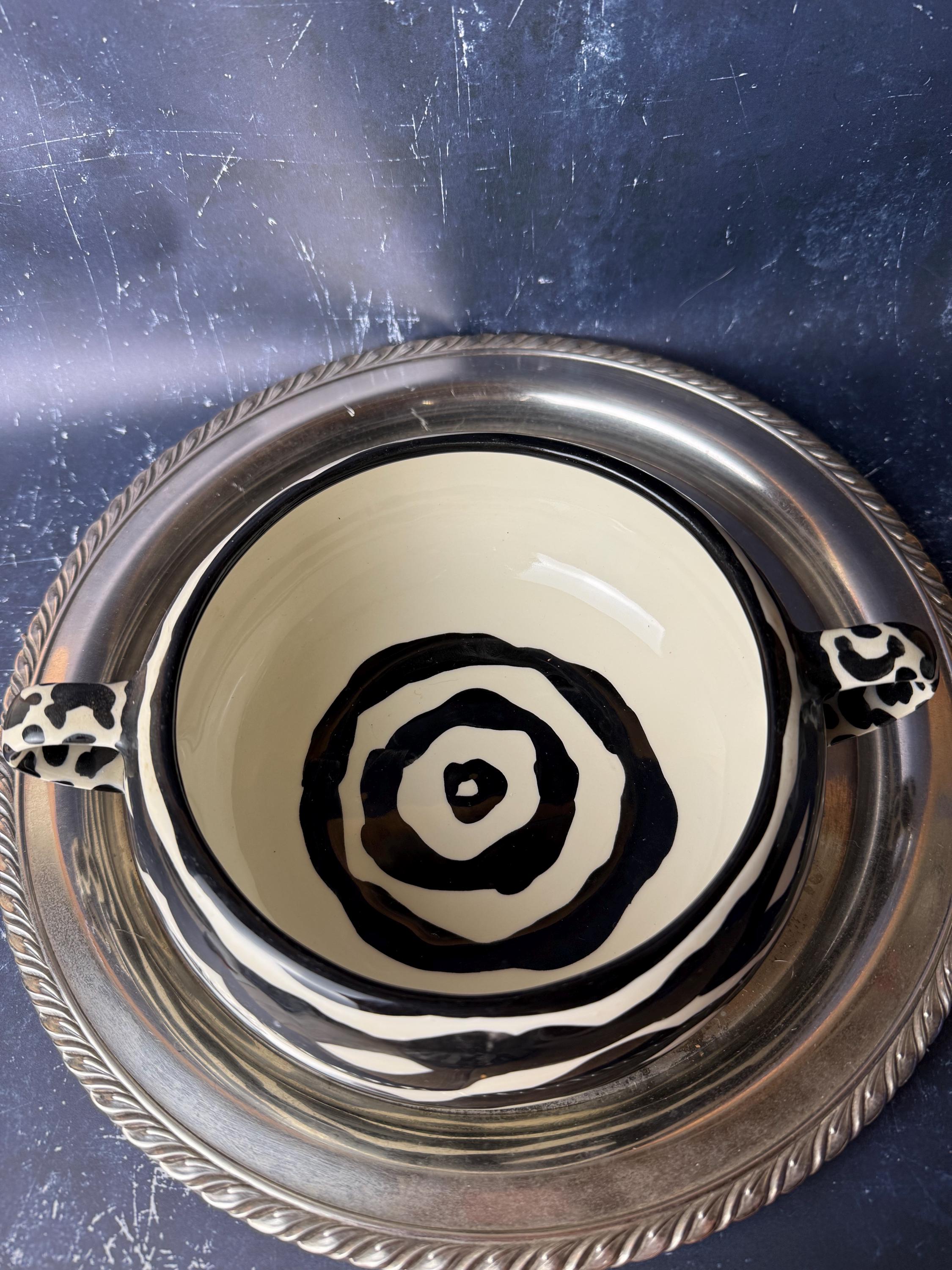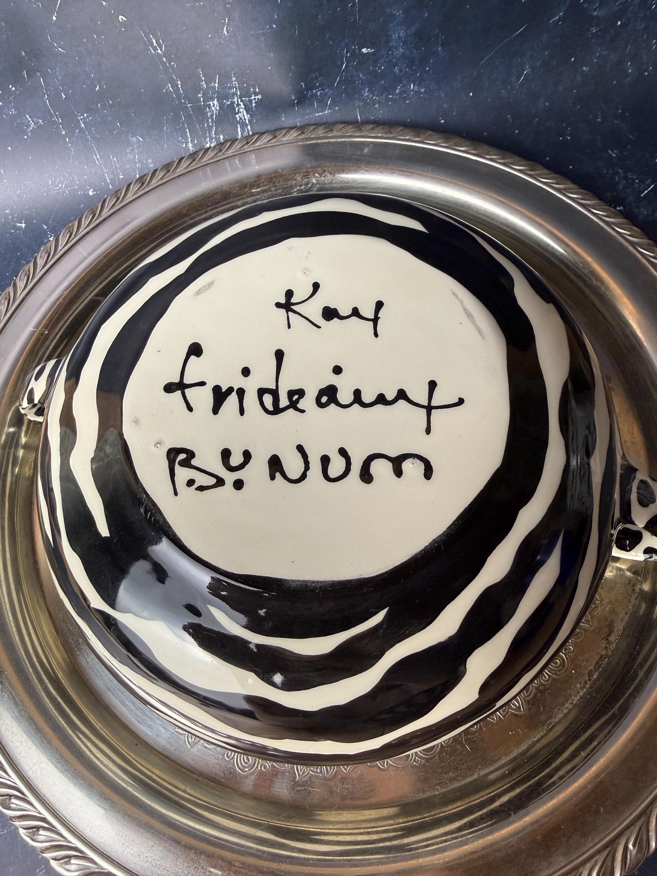 Wildly chic and delightfully bold, this black-and-white zebra-striped lidded pot is a true showstopper. Handcrafted and signed by ceramic artist Kay Frideaux Bynum, this piece fuses playful pattern with timeless craftsmanship. From the expressive animal print to the spotted finial and handles, every detail is a celebration of creative energy.