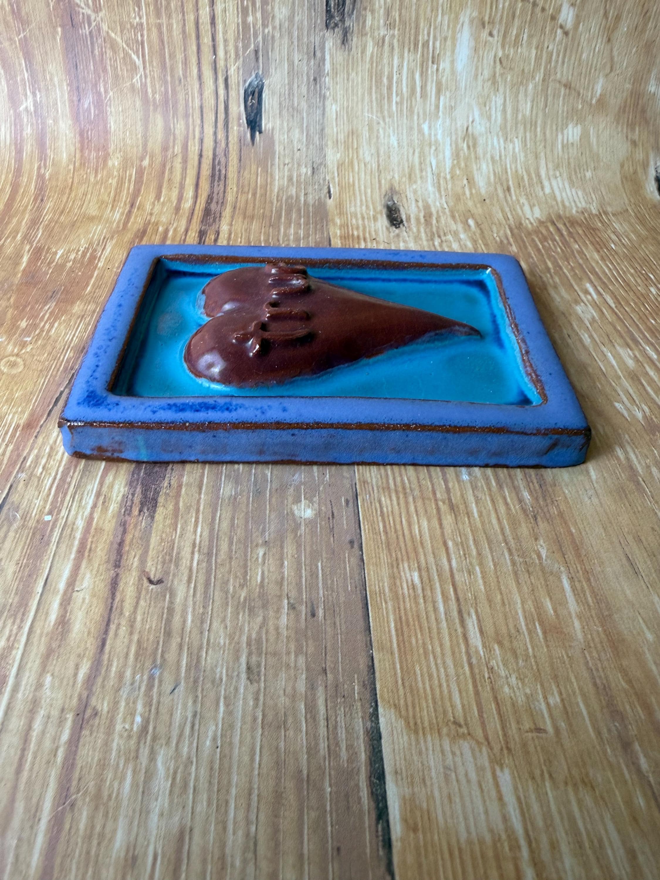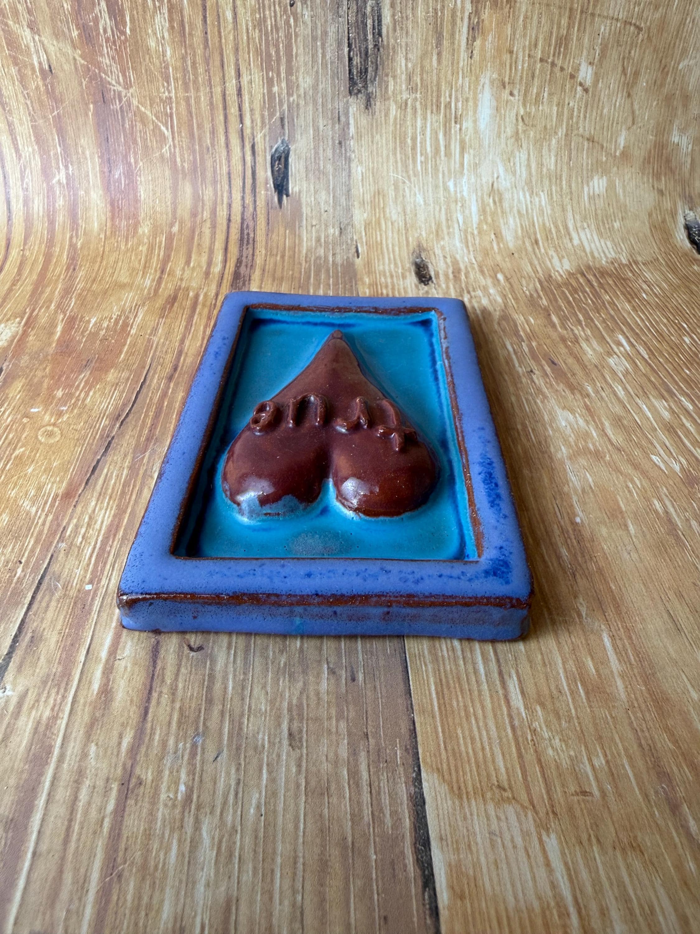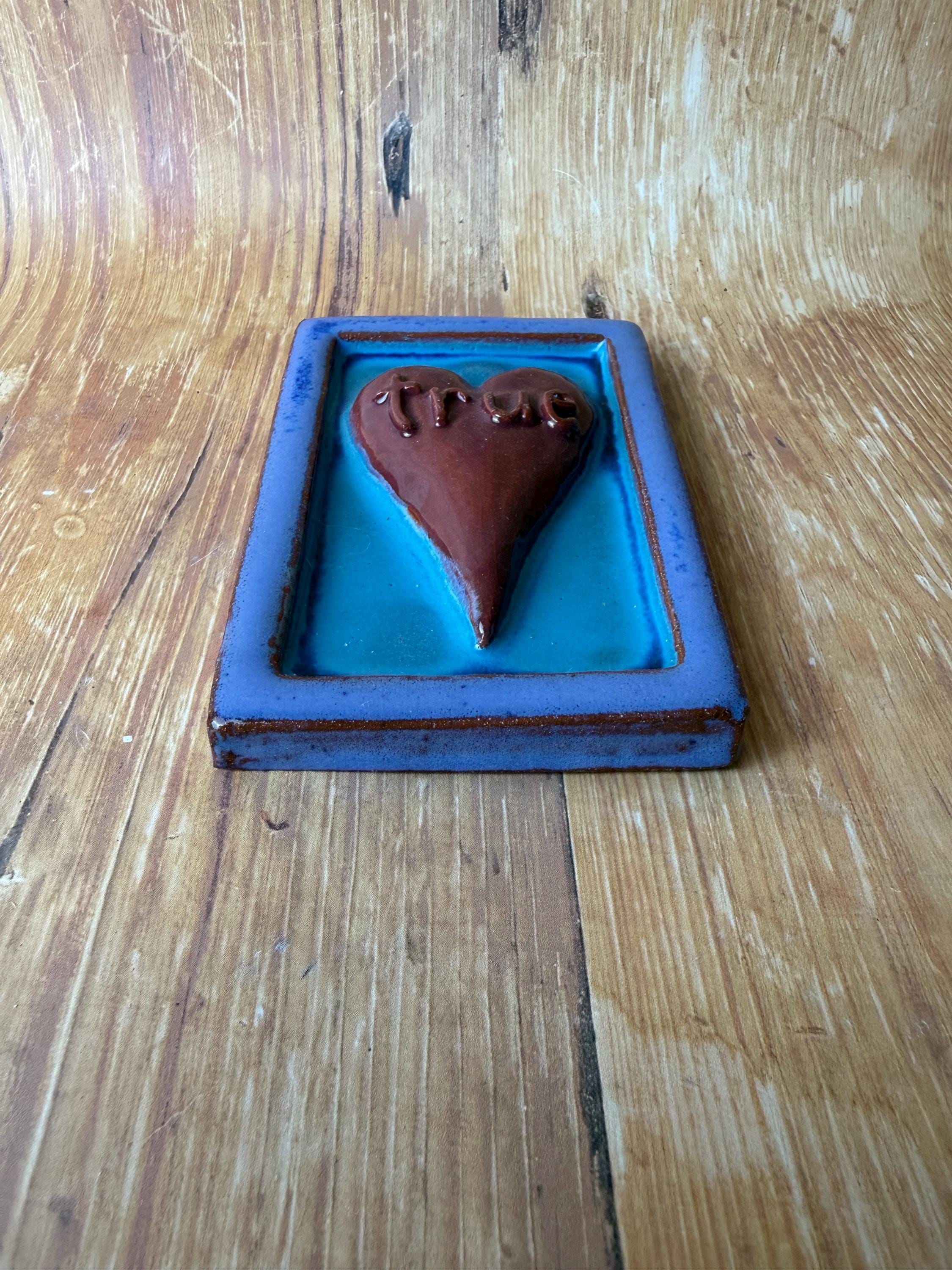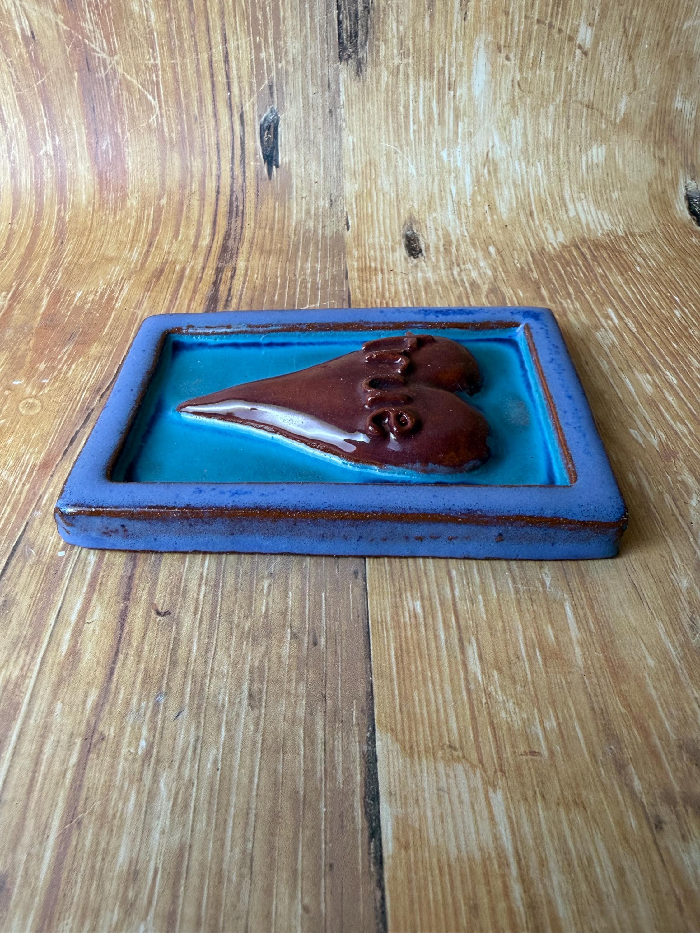 This bold and joyful handmade tile by Eartha Handmade Pottery is a little piece of art that packs a heartfelt punch. Featuring a raised red heart with the word "true" set against rich turquoise and cobalt blues, it evokes a sense of sincerity, warmth, and playfulness—perfect for adding a touch of whimsy to your wall or shelf.