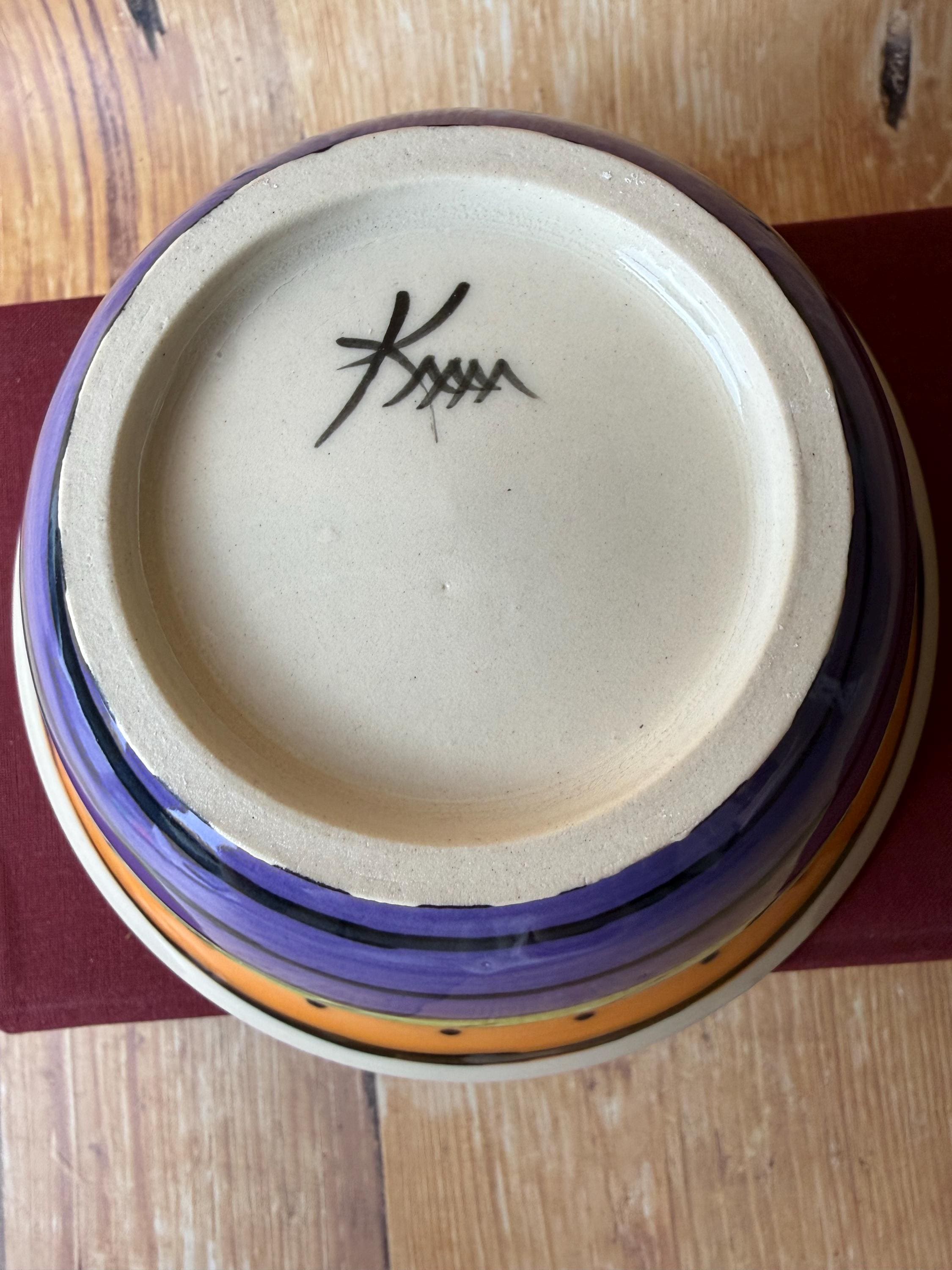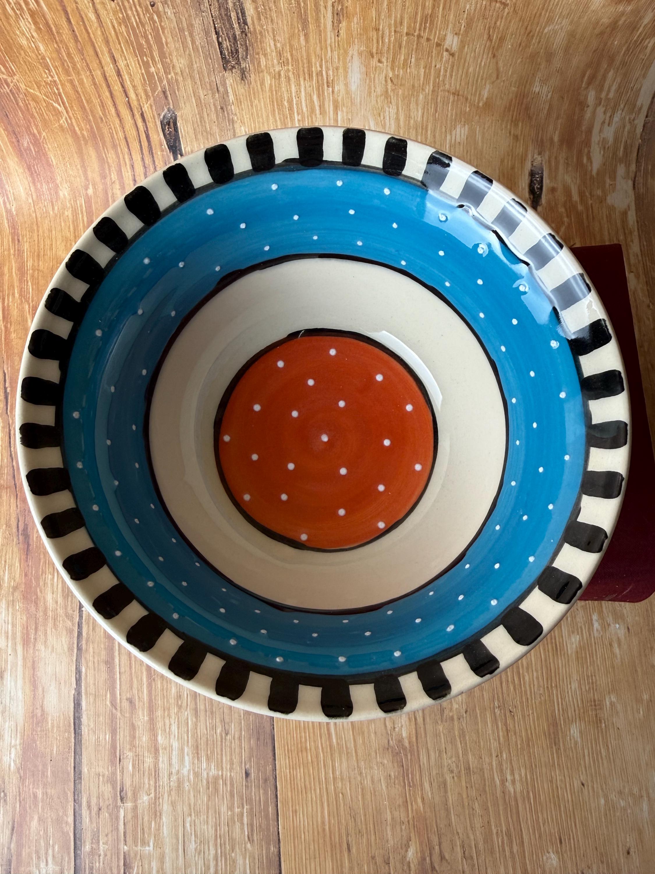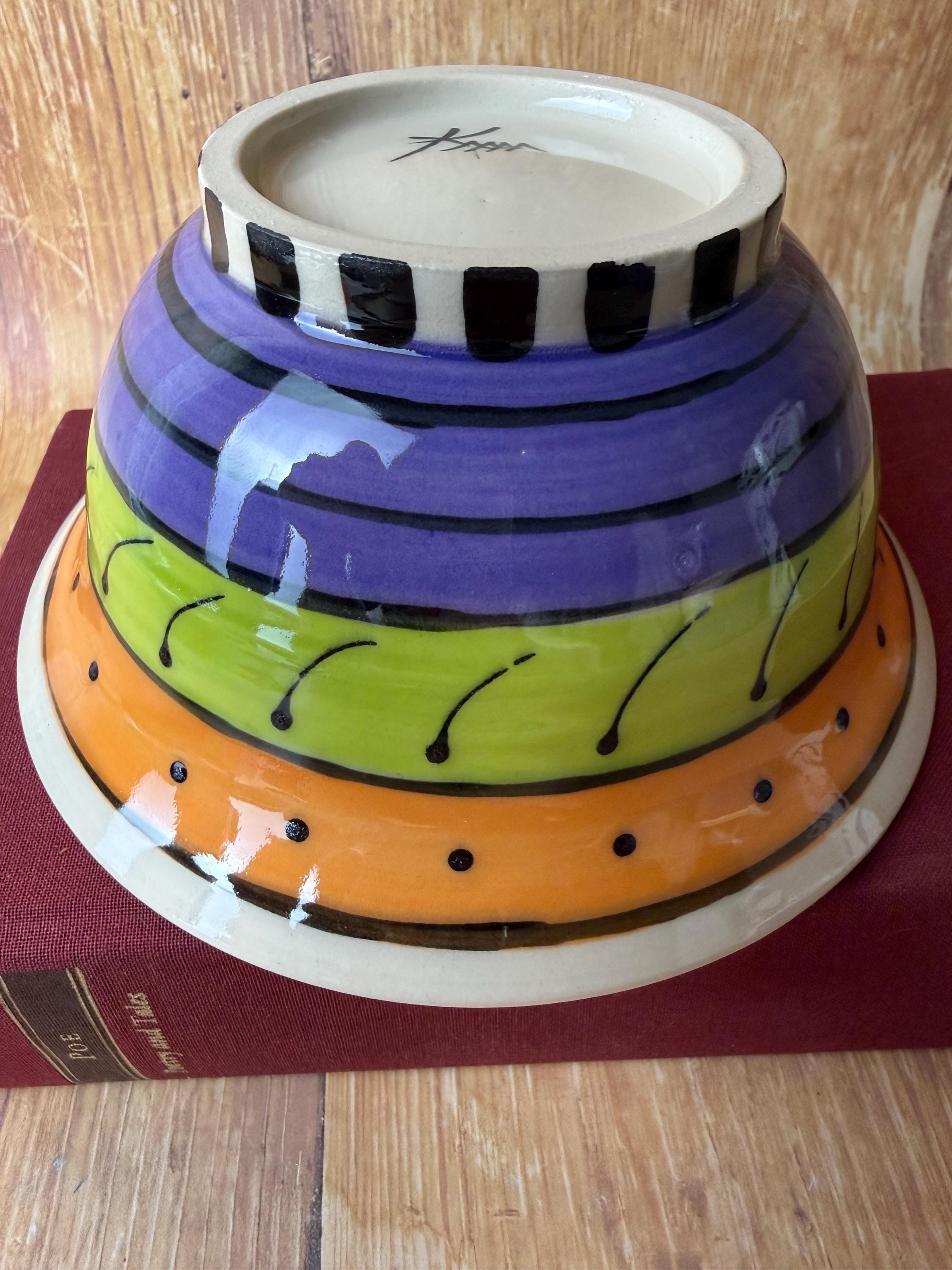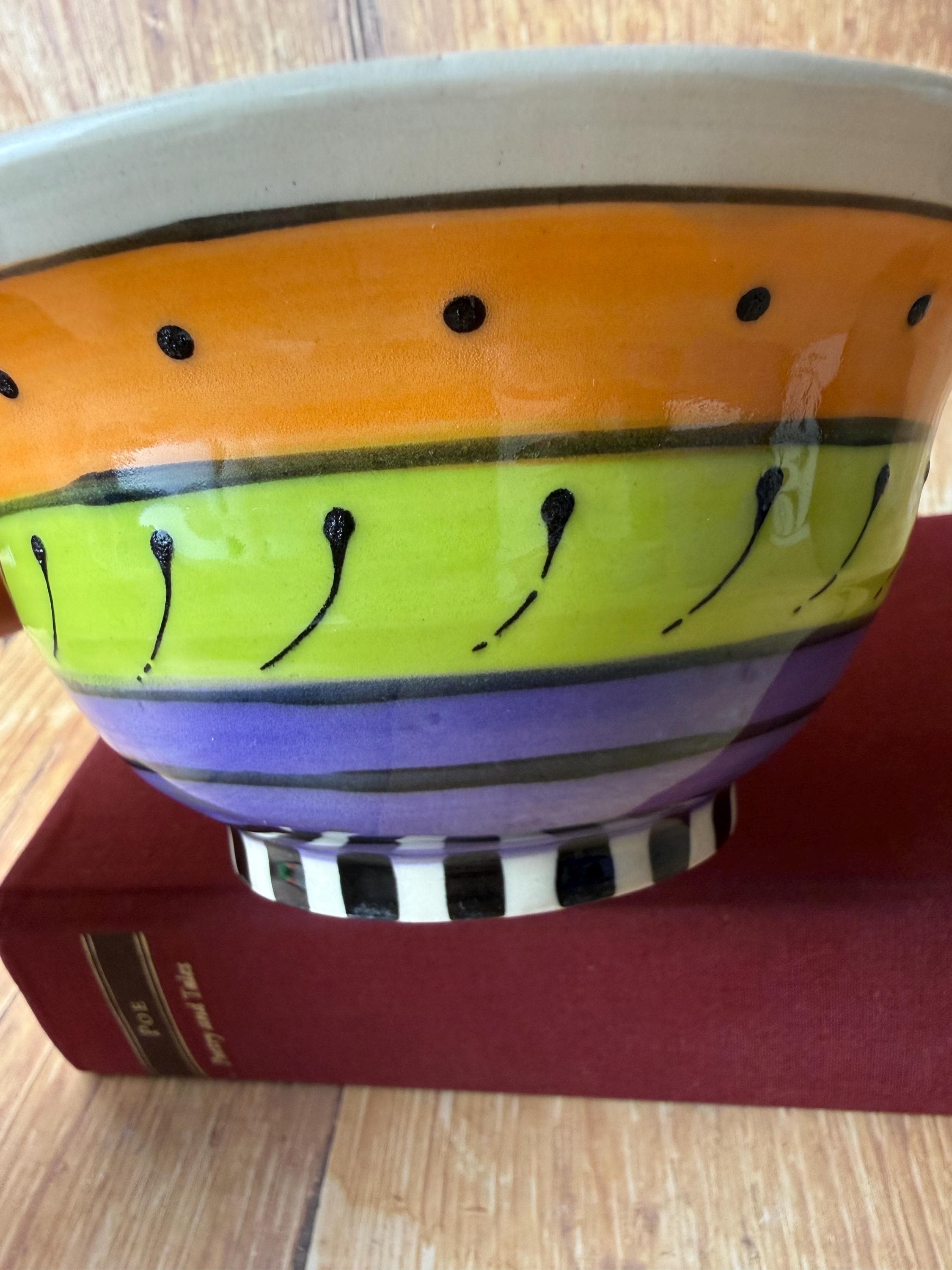 Bright, bold, and full of personality — this whimsical ceramic bowl is a celebration of color and joy. Featuring layers of saturated stripes, playful polka dots, and graphic black-and-white trim, this bowl brings artful energy to your space. Whether used for serving or display, it’s a standout piece that channels the spirit of maximalist decor and dopamine design.
