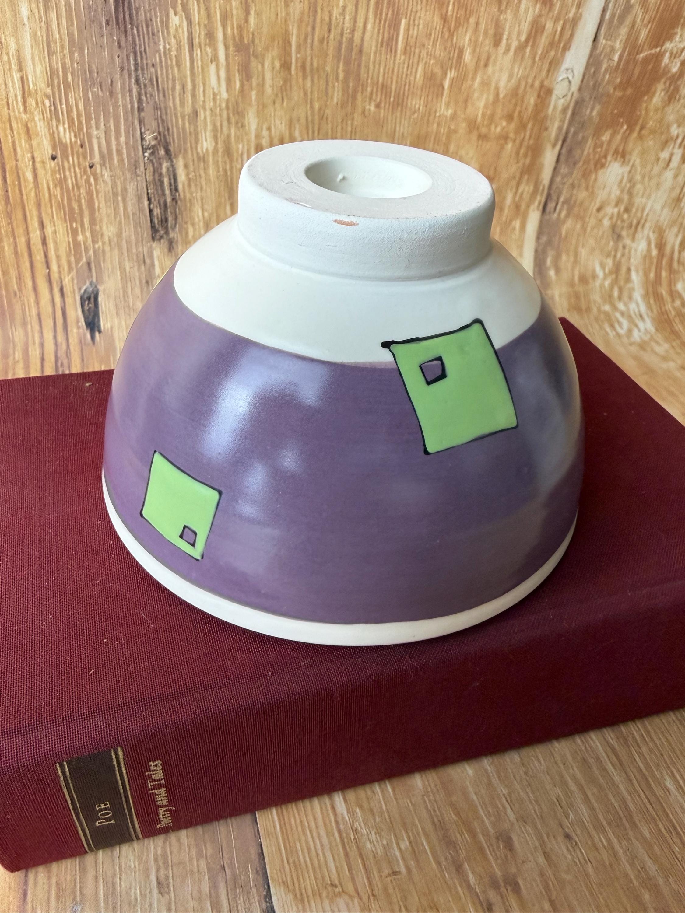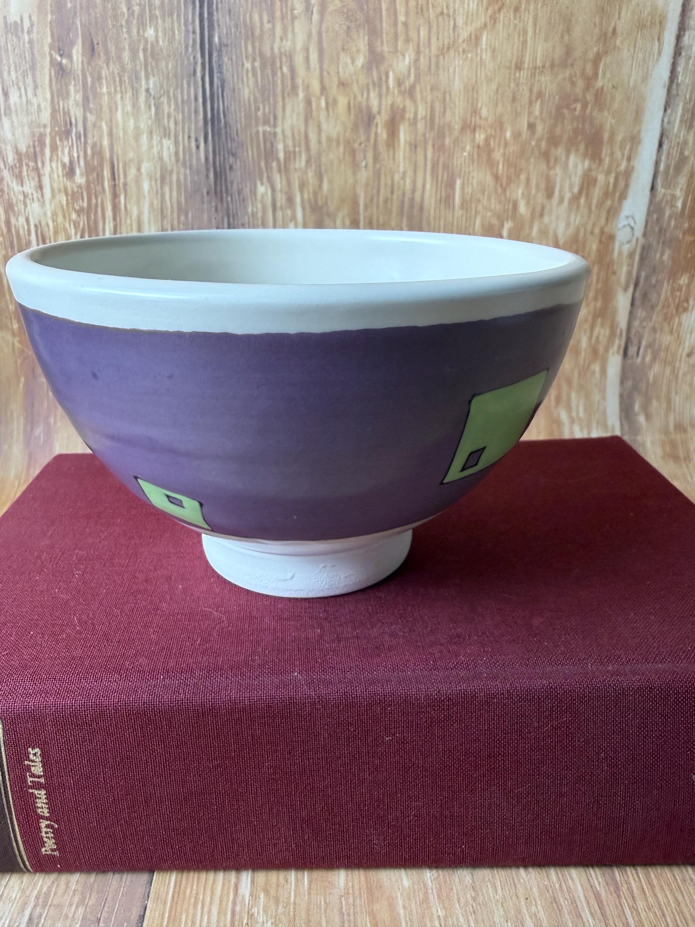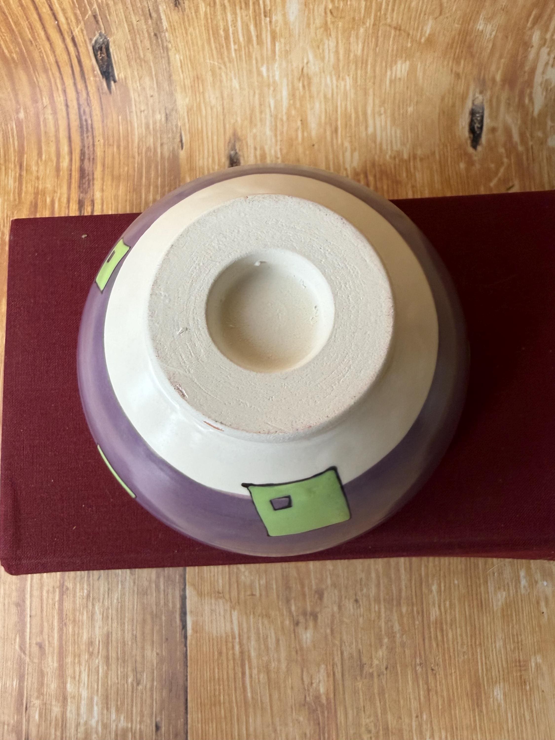 This contemporary handmade ceramic bowl is a little celebration of modern design in clay form. With a rich purple glaze and bright chartreuse geometric shapes outlined in black, it gives off strong postmodern vibes with a fresh, graphic twist. The clean white interior and footed base add to its crisp, balanced form — ideal for adding a bold yet thoughtful accent to any space.