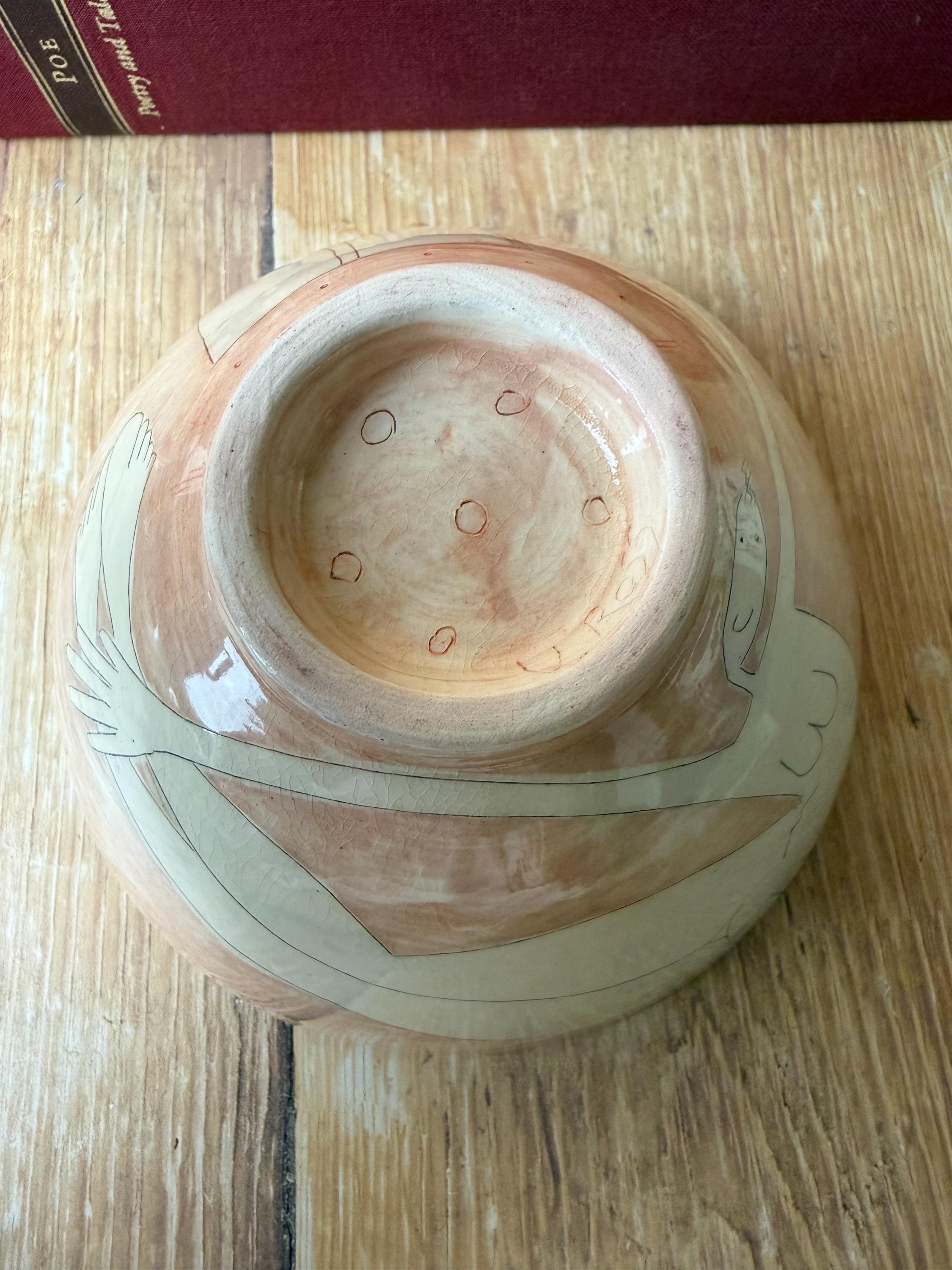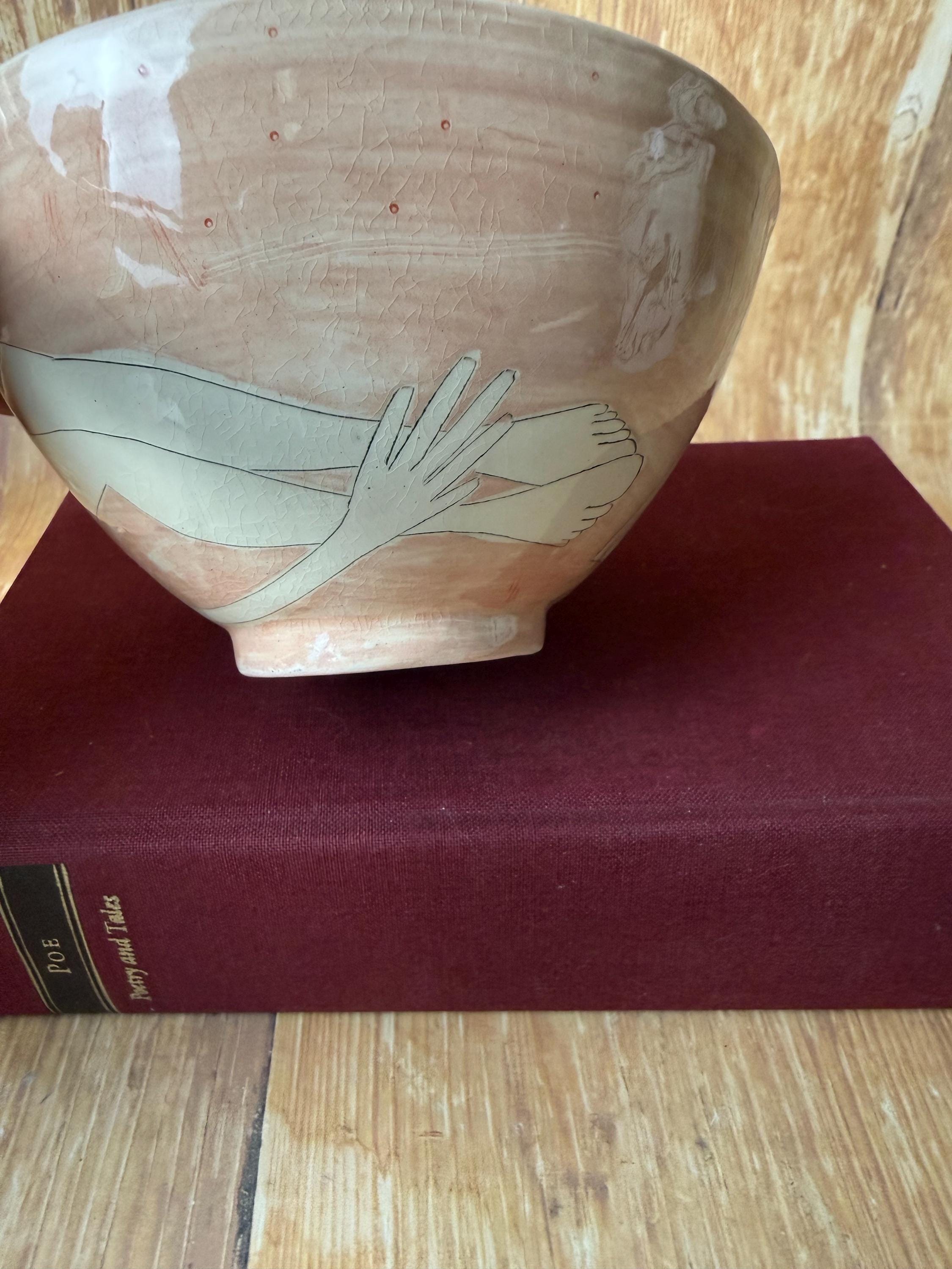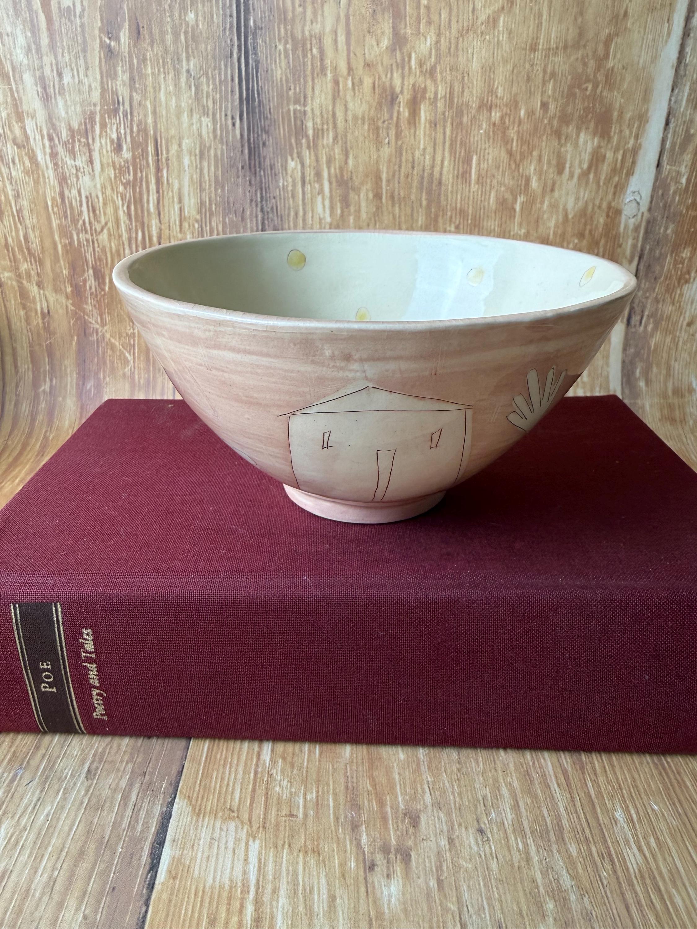 This hand-thrown ceramic bowl features a subtle, narrative design etched into its softly glazed surface — a minimalist nude figure wraps gently around one side, while a small house and plant form sit opposite, almost like a dream remembered. Yellow polka dots float across the inner and outer surface, lending a touch of quiet whimsy. Though unsigned, the craftsmanship and artistic expression are unmistakable. With its gentle crackle glaze and earth-toned washes, this piece feels both grounded and imaginative.