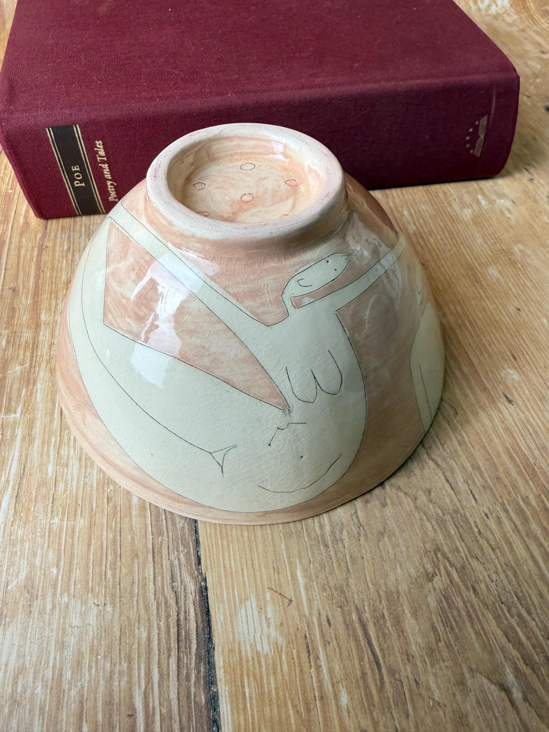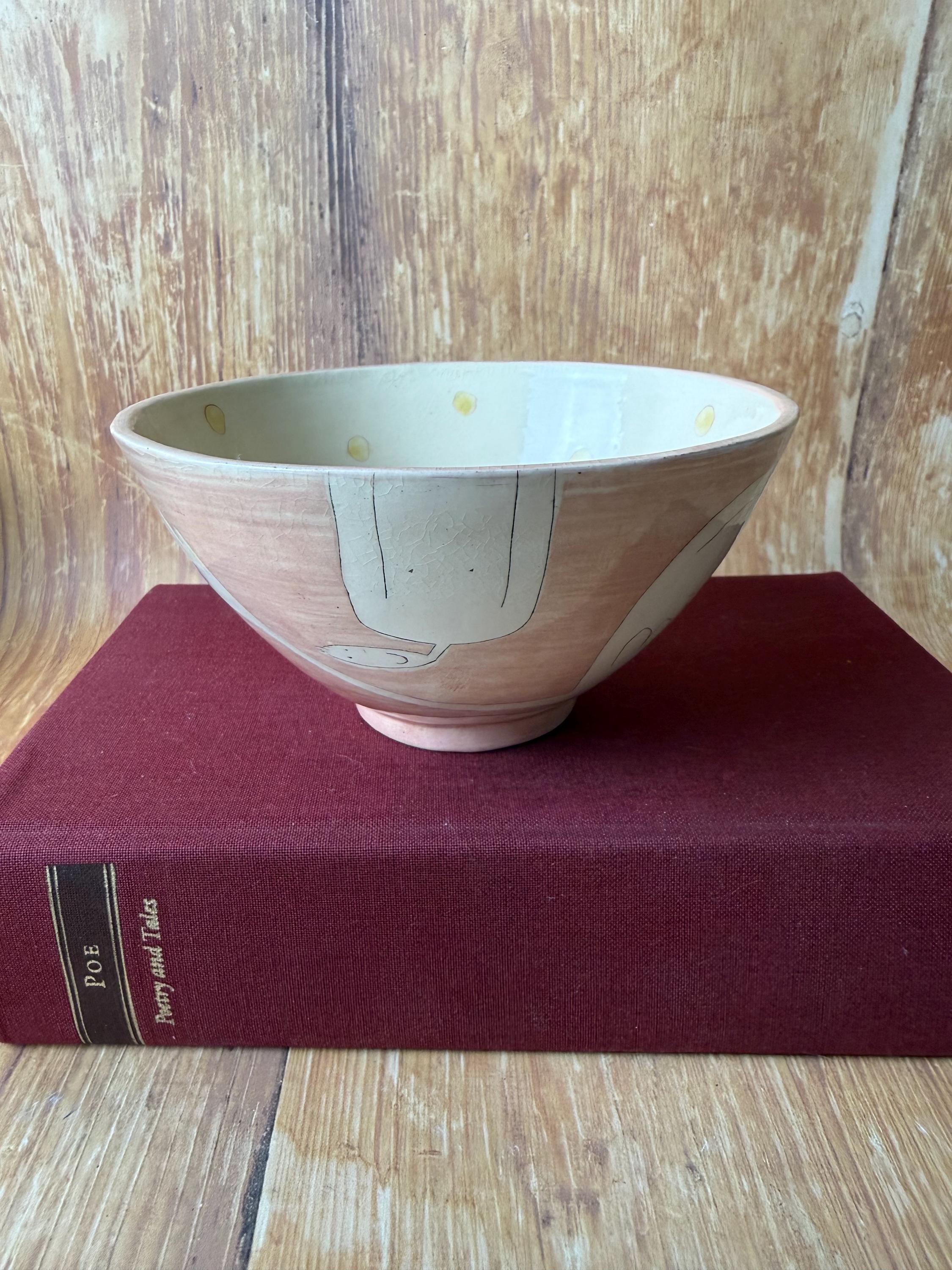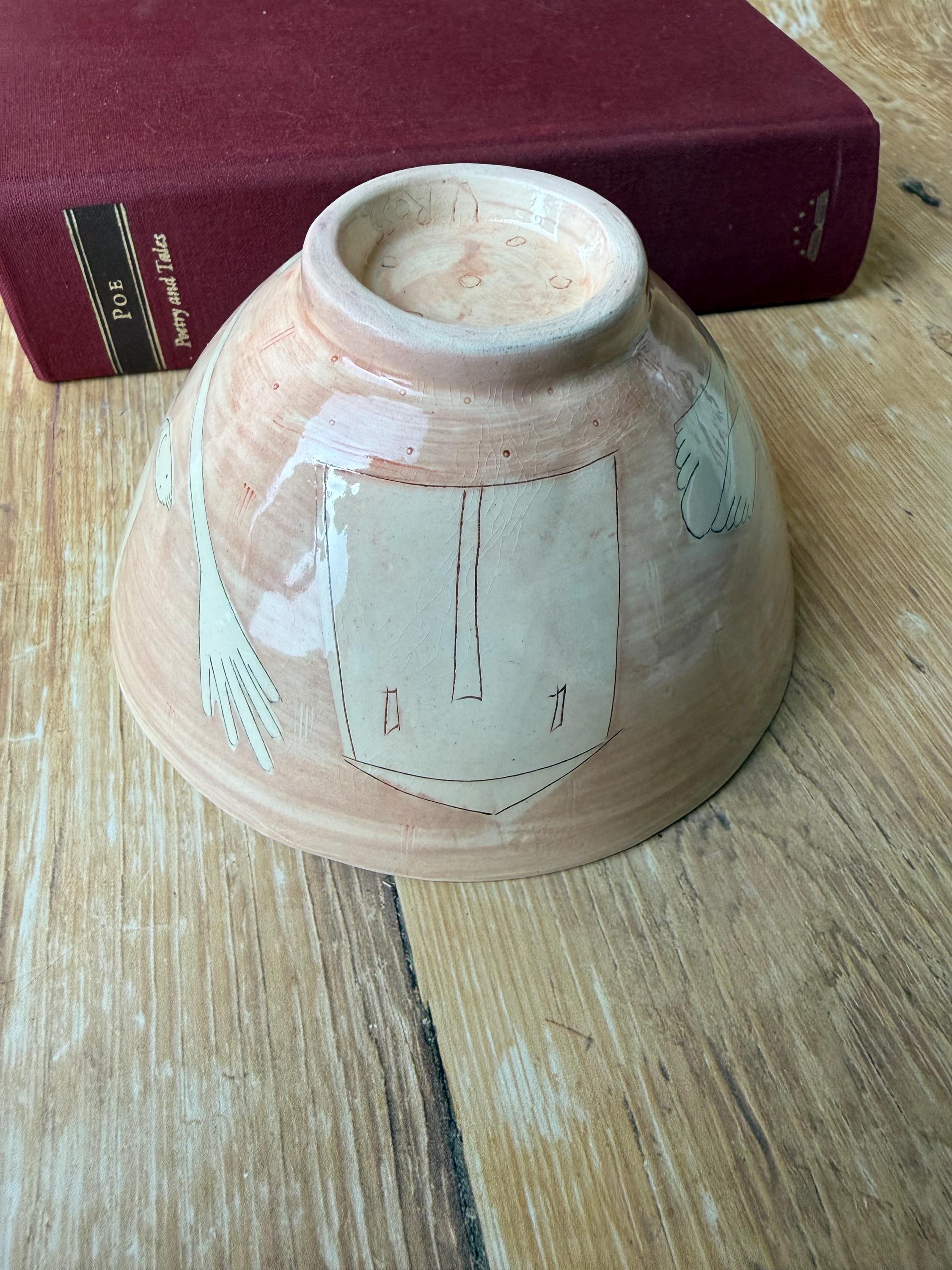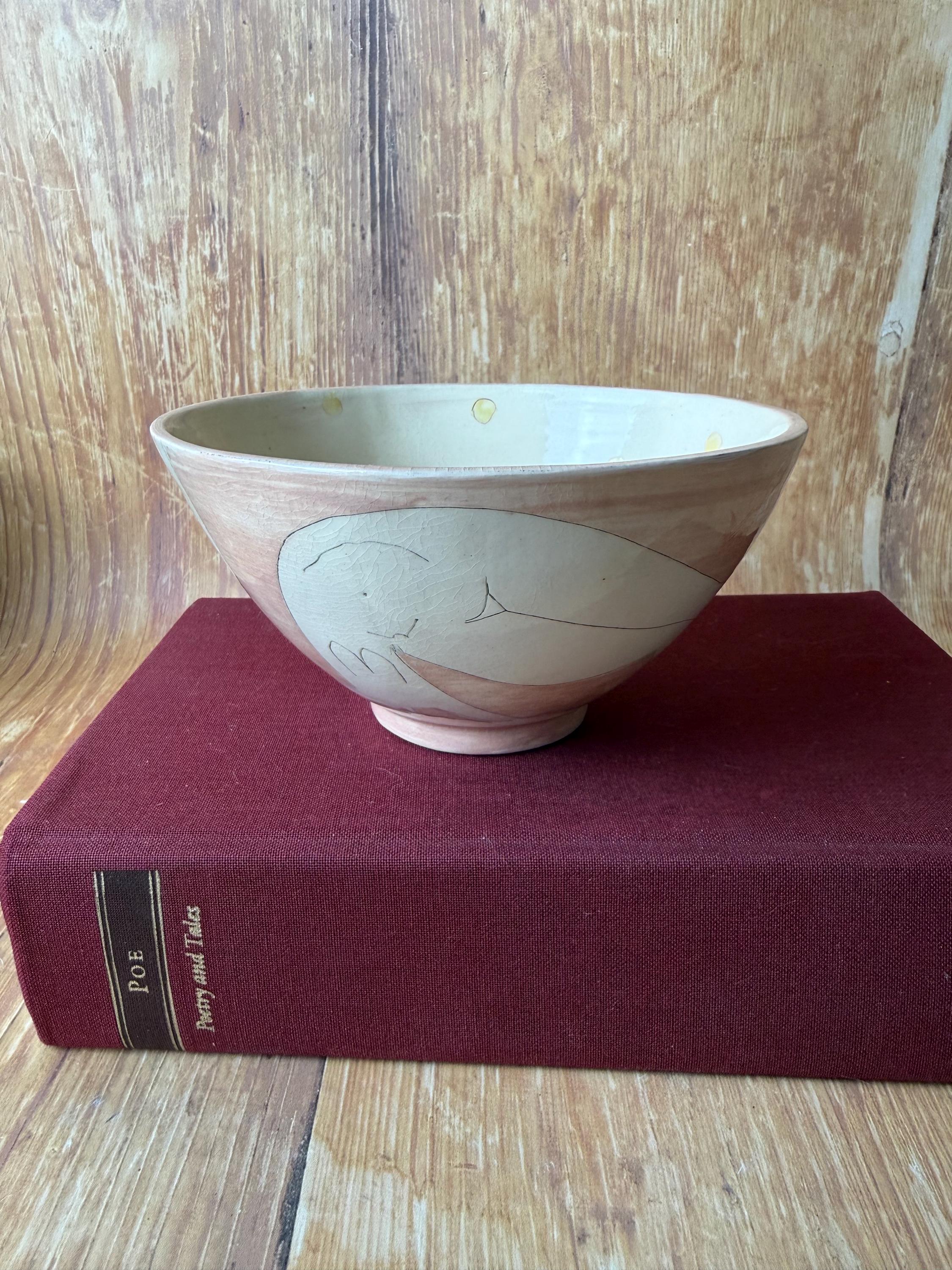 This hand-thrown ceramic bowl features a subtle, narrative design etched into its softly glazed surface — a minimalist nude figure wraps gently around one side, while a small house and plant form sit opposite, almost like a dream remembered. Yellow polka dots float across the inner and outer surface, lending a touch of quiet whimsy. Though unsigned, the craftsmanship and artistic expression are unmistakable. With its gentle crackle glaze and earth-toned washes, this piece feels both grounded and imaginative.