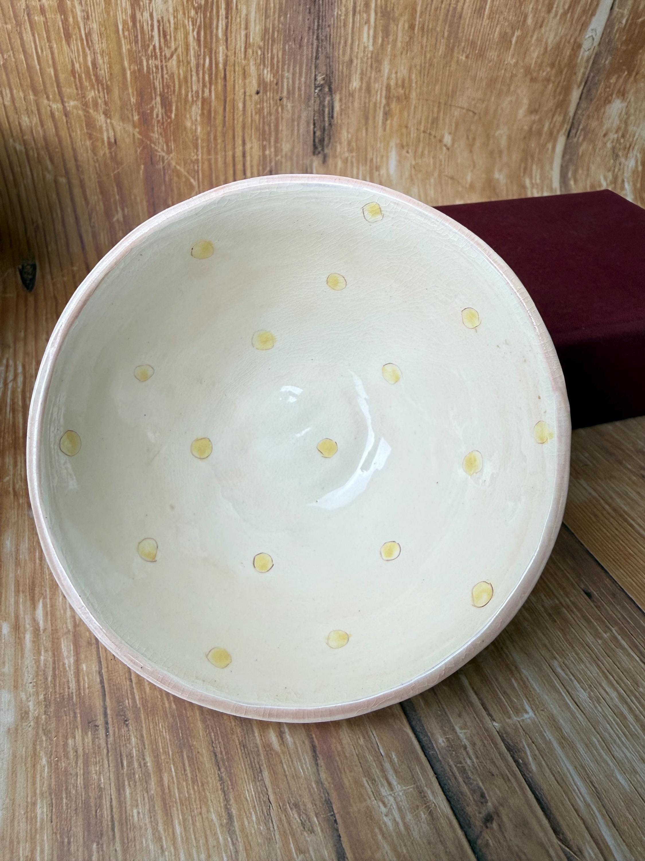 Color: Soft natural clay tones with white glaze, pale yellow dots