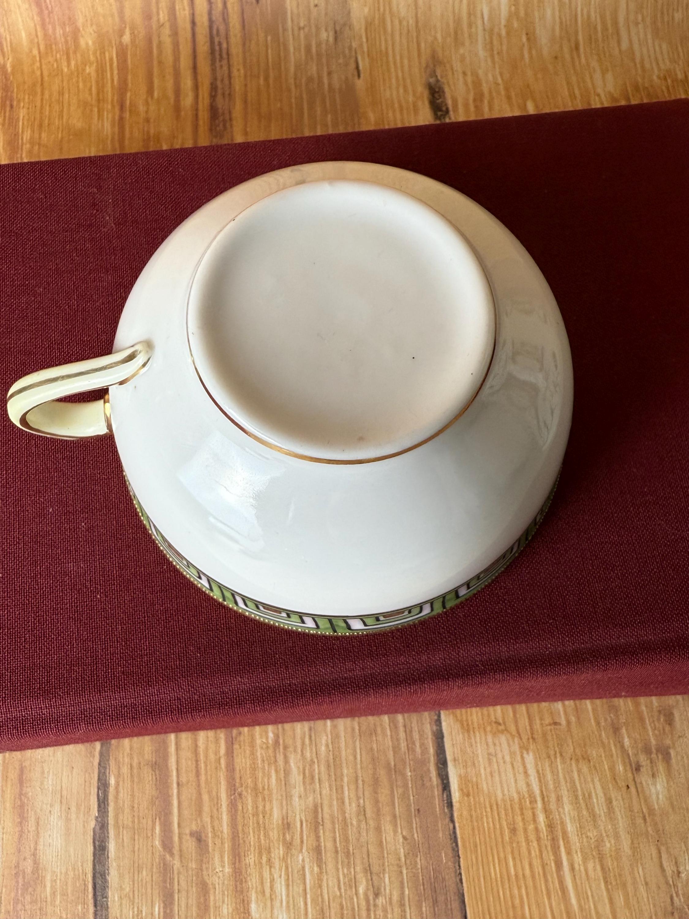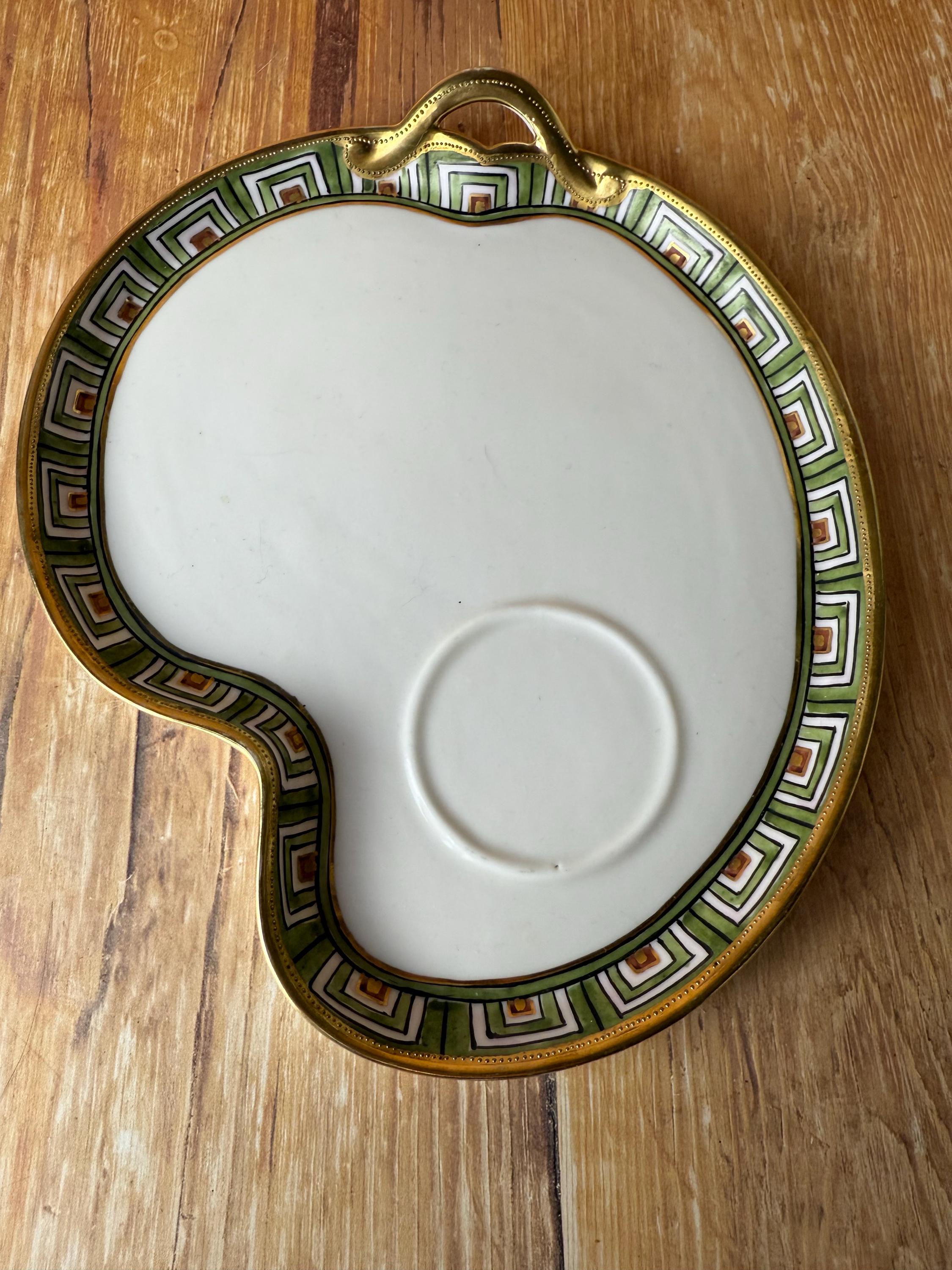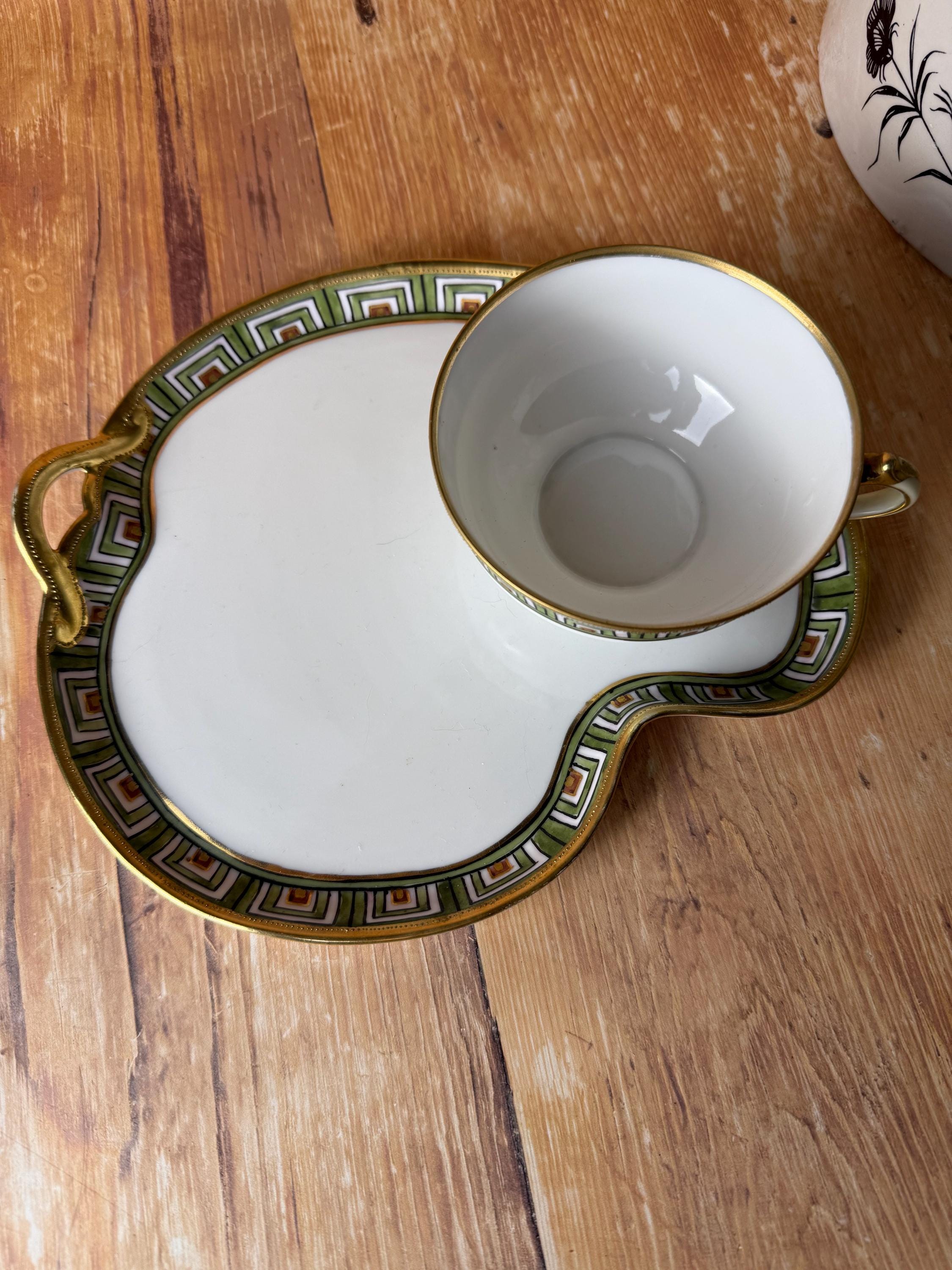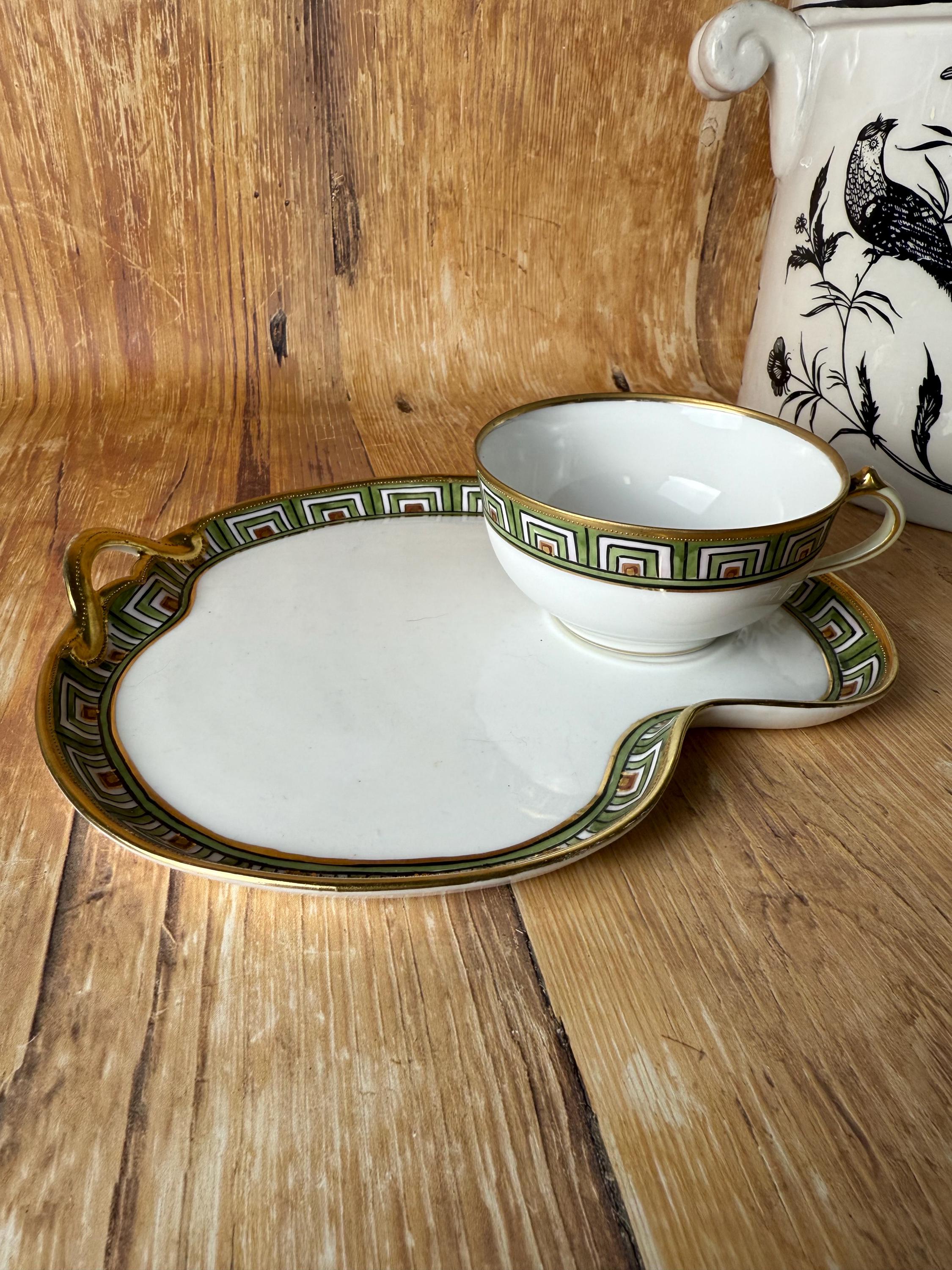 This rare antique Nippon snack set pairs refined craftsmanship with bold geometric elegance. Hand-painted in vibrant green, orange, and black over crisp white porcelain, the design features a hypnotic stepped Art Deco border trimmed in radiant gold. The cup nestles perfectly into the plate’s recessed rest — making it a charming set for tea, coffee, or small bites.
